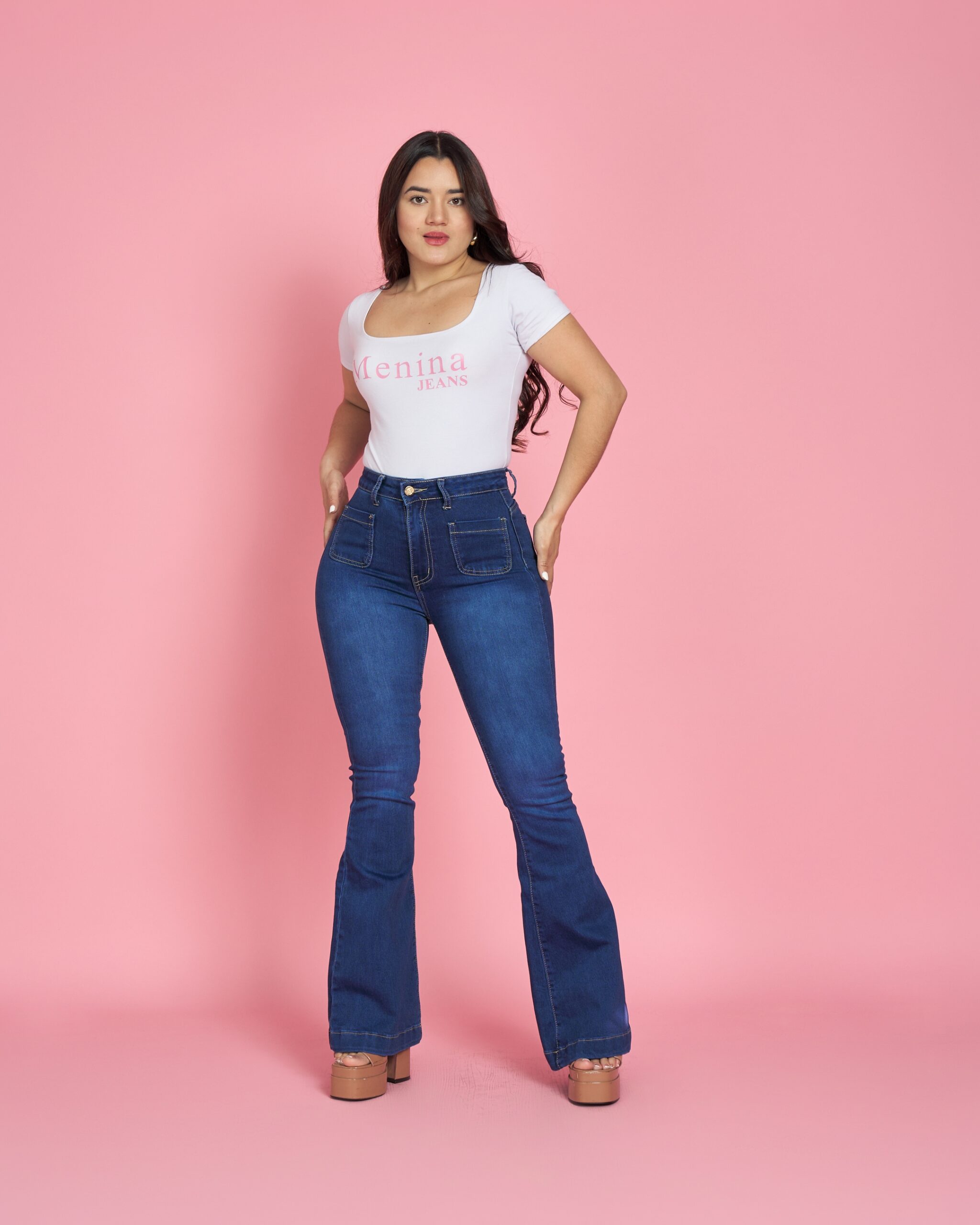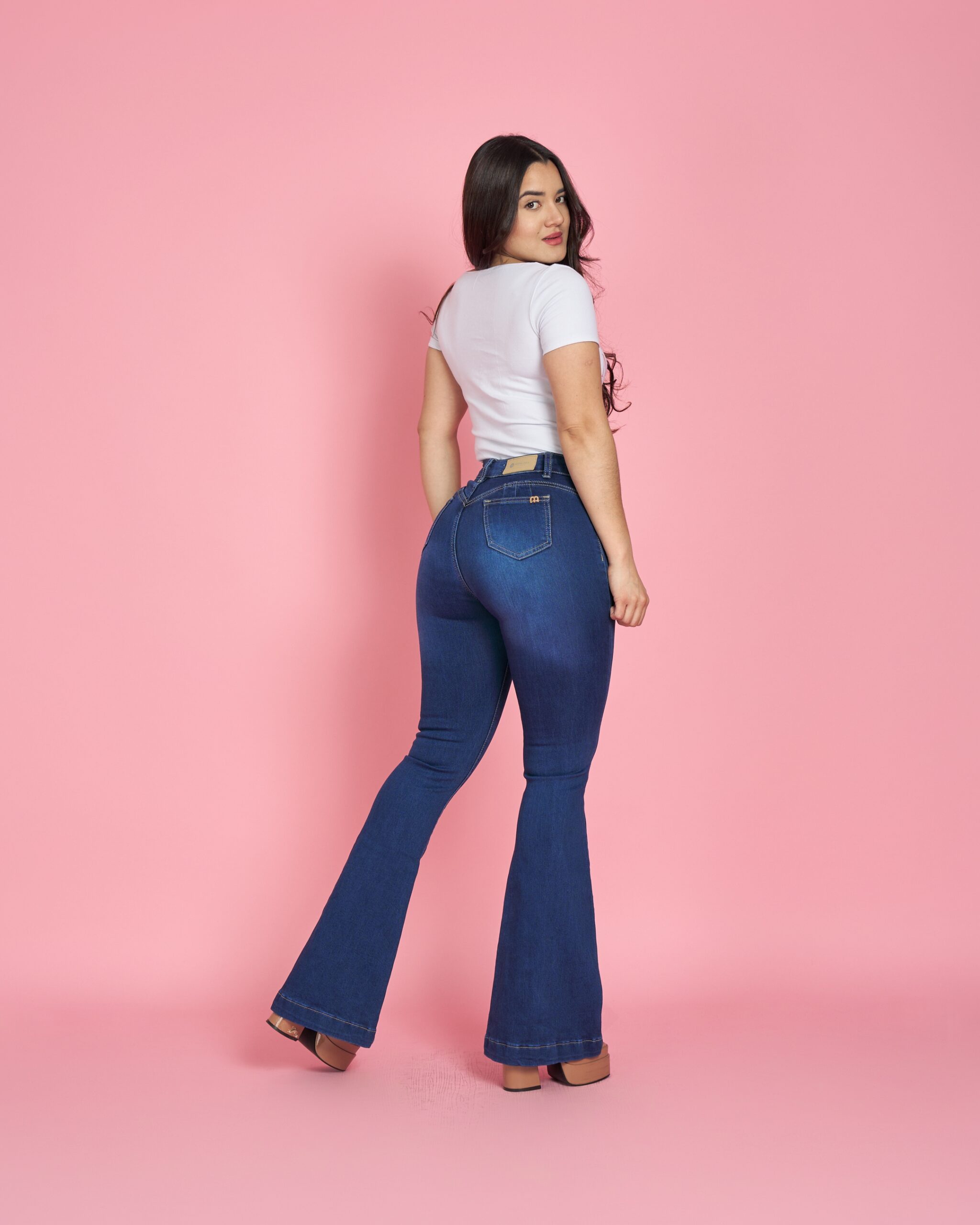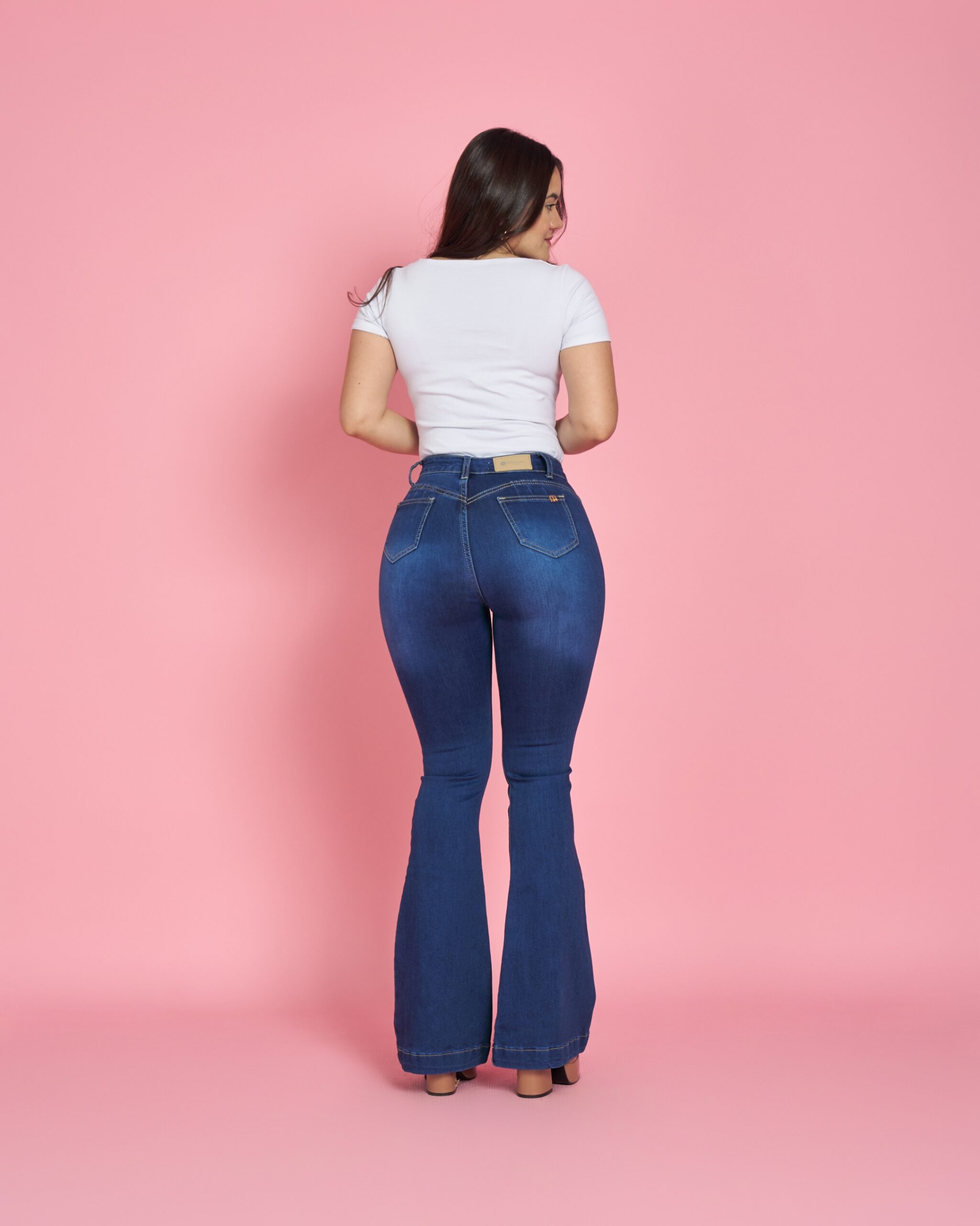 Mayorista, este jeans acampanado tiro alto es un infaltable por su calce perfecto y su estilo tendencia. Confeccionado en denim elasticado, realza cintura, cadera y glúteos mientras su bota campana estiliza la silueta al instante.