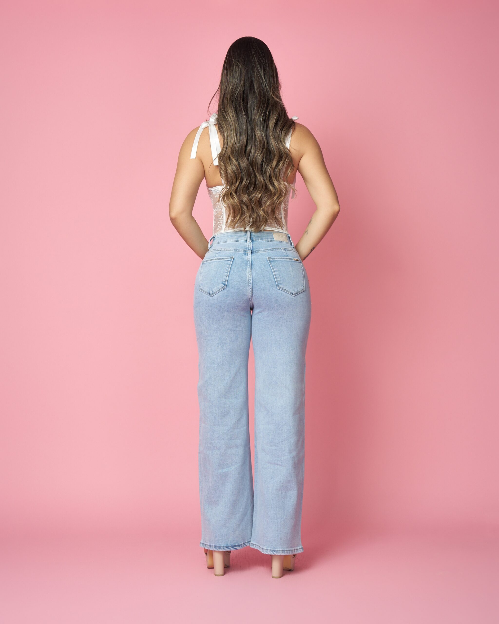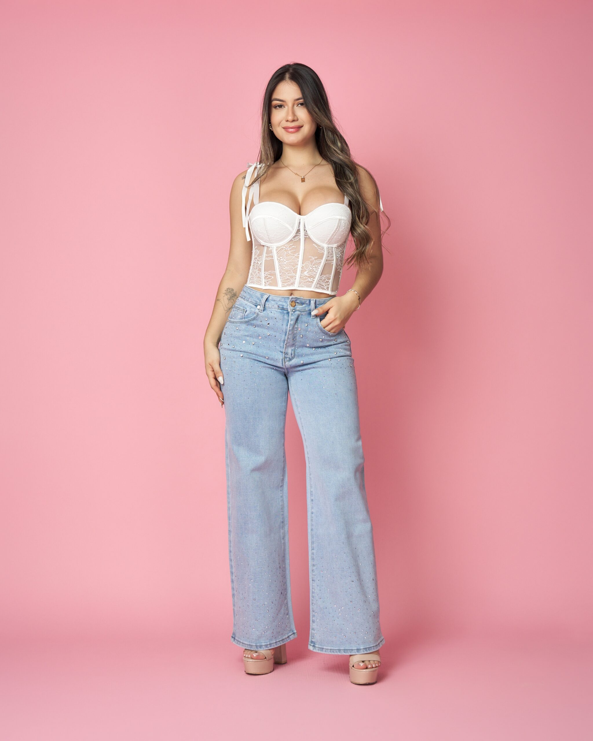 Este jeans de pierna ancha es ese modelo que tus clientas van a elegir apenas lo vean. Fabricado en denim rígido de alta calidad, mantiene la silueta firme y estilizada, logrando ese efecto de “cintura marcada – piernas largas” que tanto buscan.