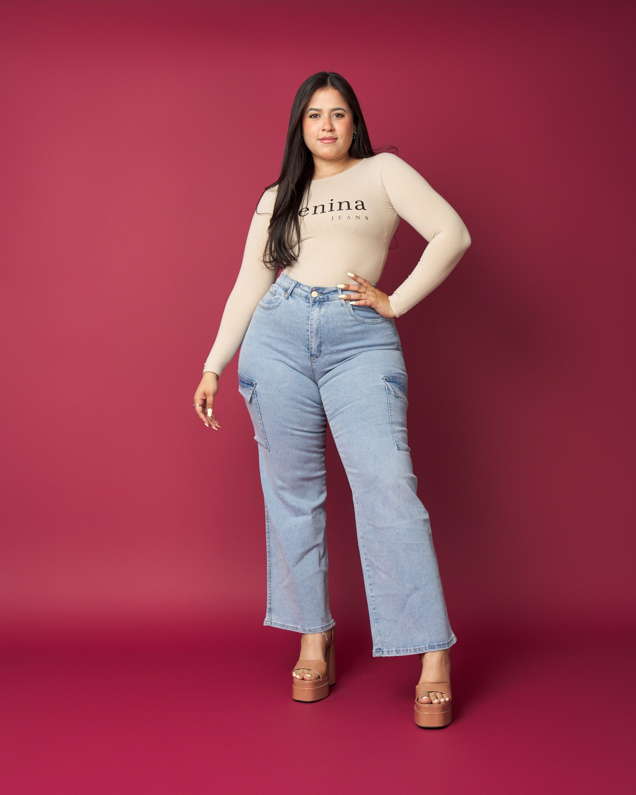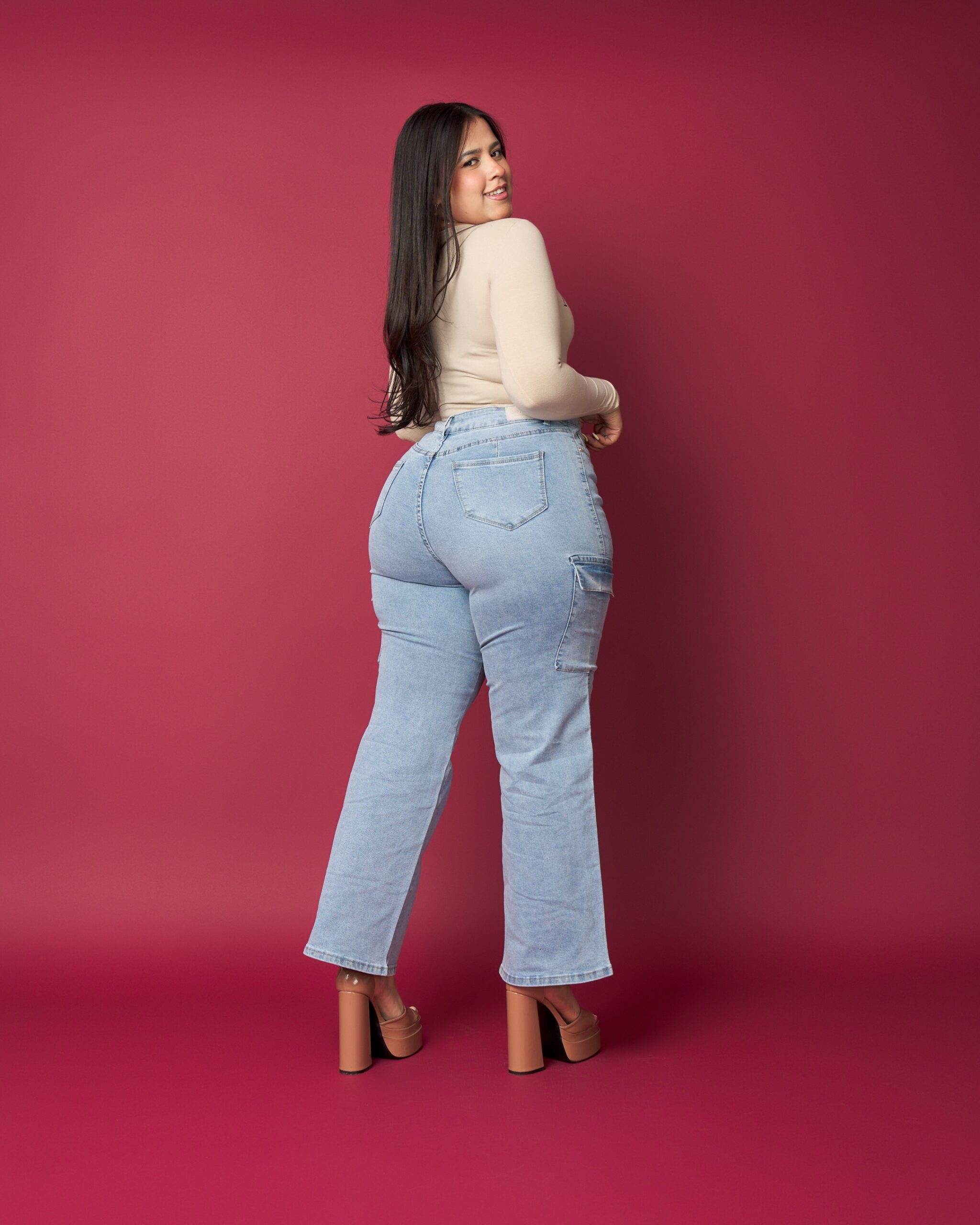 Jeans cargo tiro alto, en mezclilla celeste suave, con bolsillos laterales funcionales que estilizan la pierna y dan un look moderno.