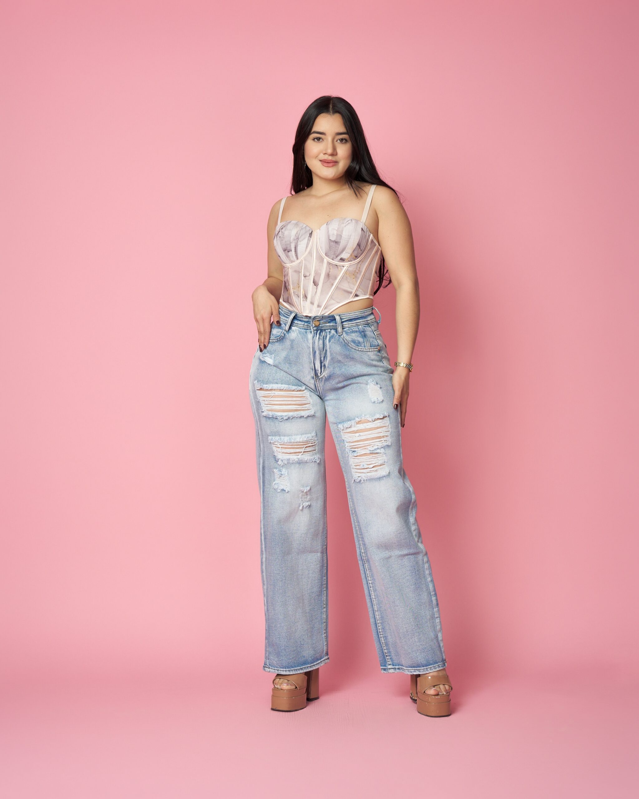 Amig@, el MB2020 es un jean wide leg tiro alto con lavado celestial y roturas profundas al frente que lo hacen ultra juvenil y top en ventas. Su tela es gruesa, resistente y con excelente estructura, ideal para este tipo de diseño. La horma realza naturalmente caderas y glúteos, mientras que la caída amplia aporta comodidad total. Perfecto para mayoristas que buscan modelos urbanos, modernos y de alta rotación. Semi-elasticado