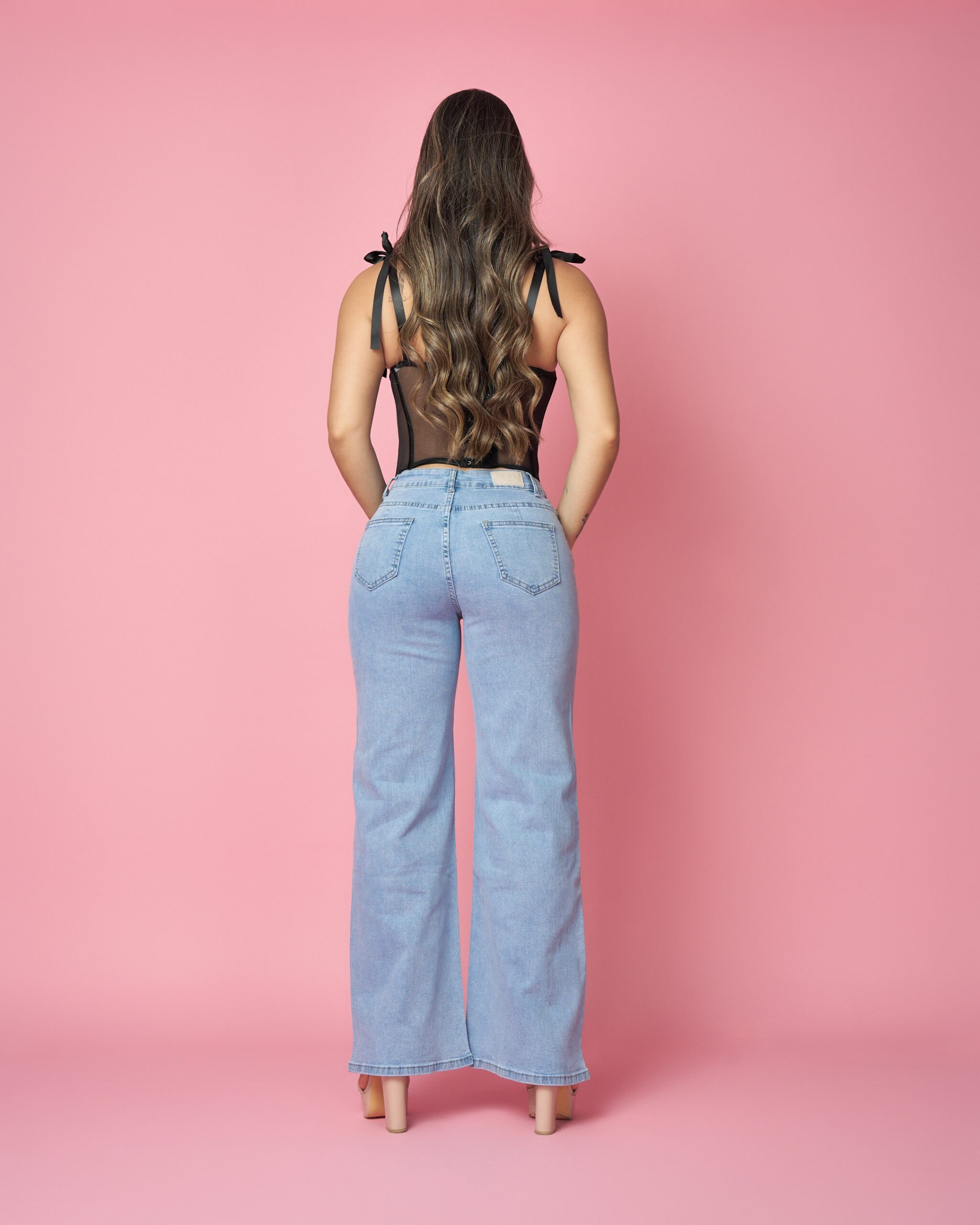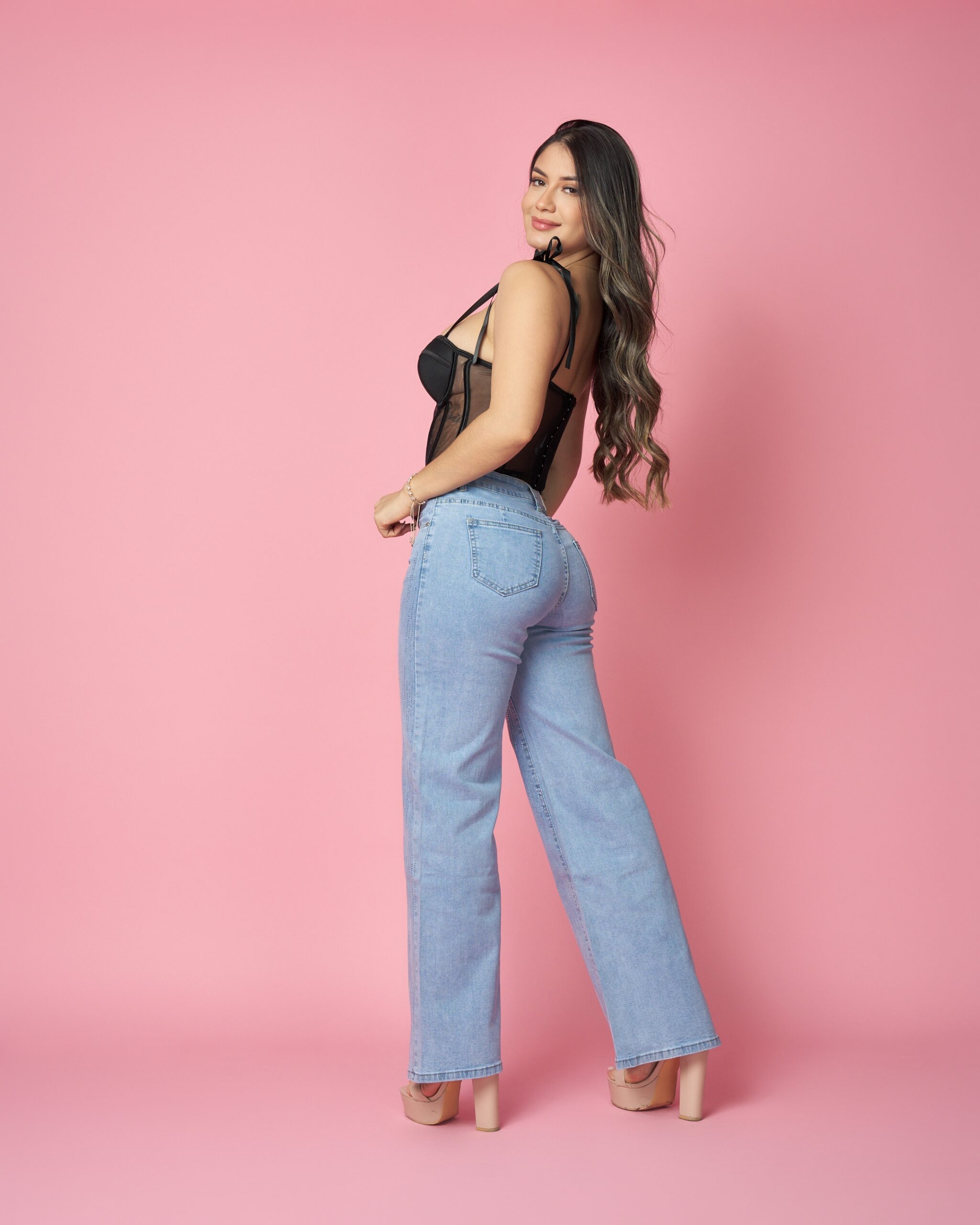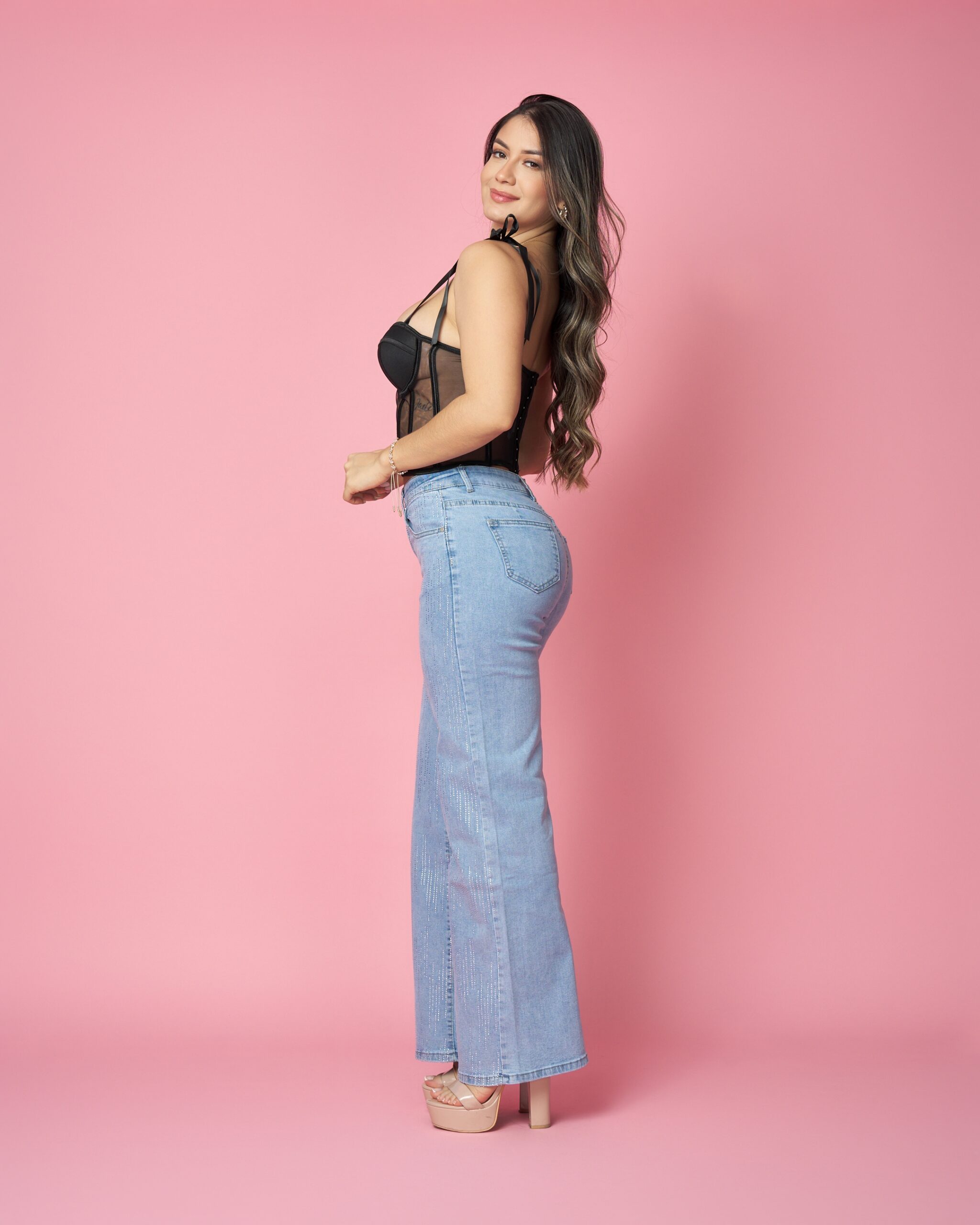 Amig@, el MB2054-1 es un wide leg moderno y súper llamativo, con un tono celeste suave que estiliza y brillos en líneas verticales que alargan visualmente la figura. Su tiro alto firme define la cintura, la tela tiene excelente estructura y suavidad, y la horma realza glúteos y caderas de forma natural. Es un modelo ideal para vitrinas, colecciones de tendencia y clientas que aman brillar, con rotación rápida en tiendas.