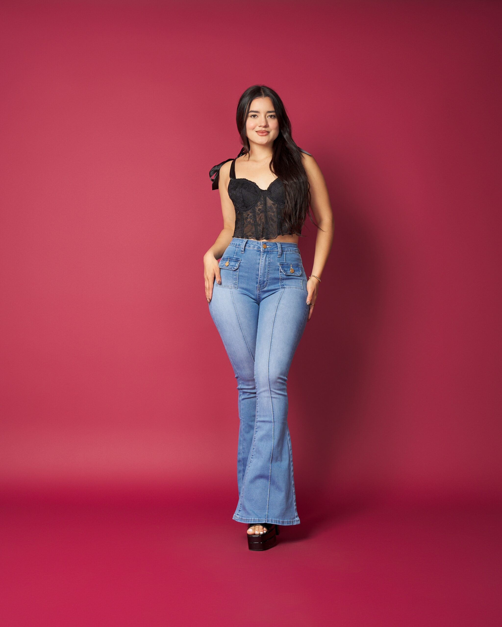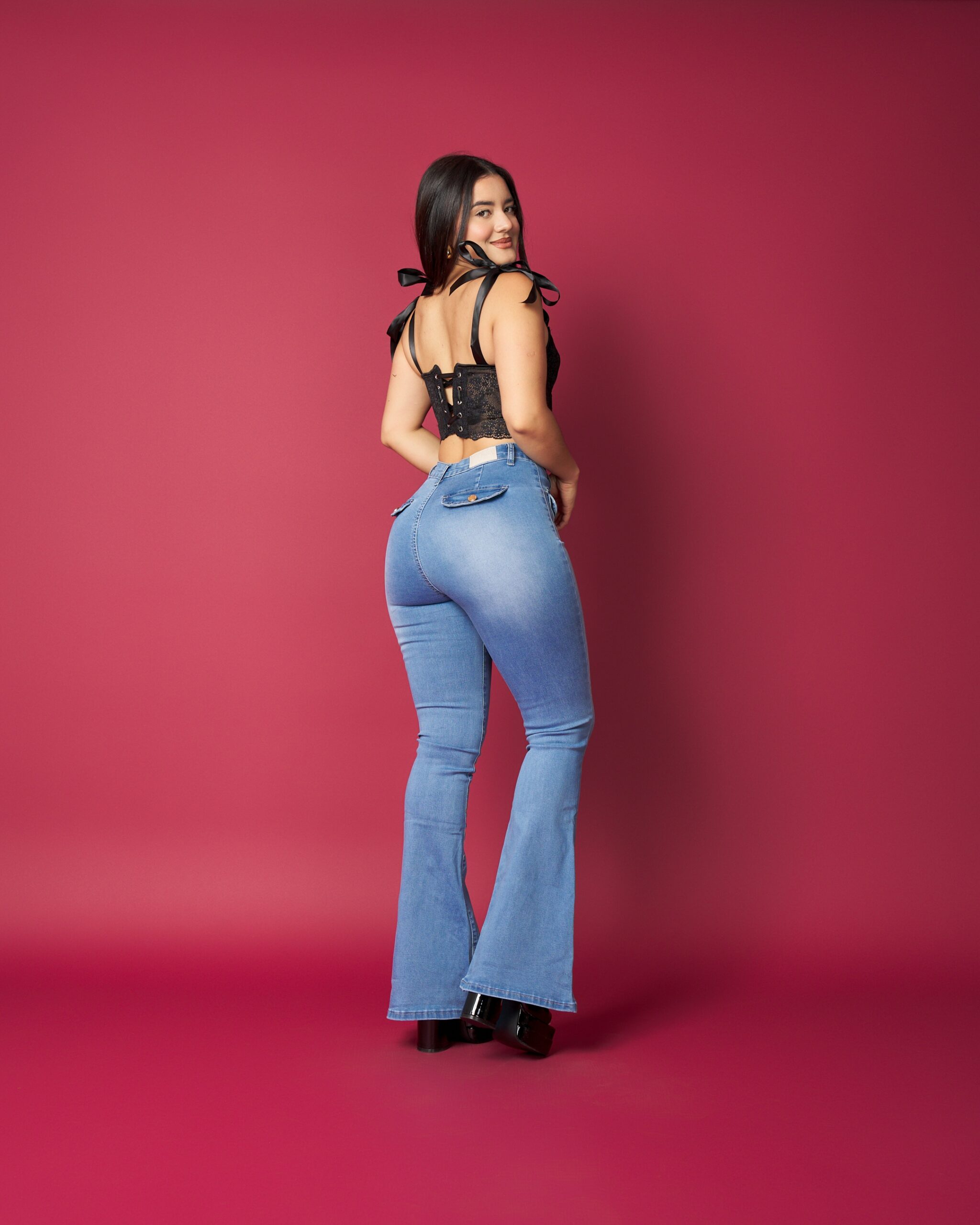 Este jeans combina un calce favorecedor con un diseño moderno que realza tus curvas de forma natural. Su tela elasticada brinda comodidad durante todo el día, mientras su corte acampanado aporta un toque elegante y femenino.