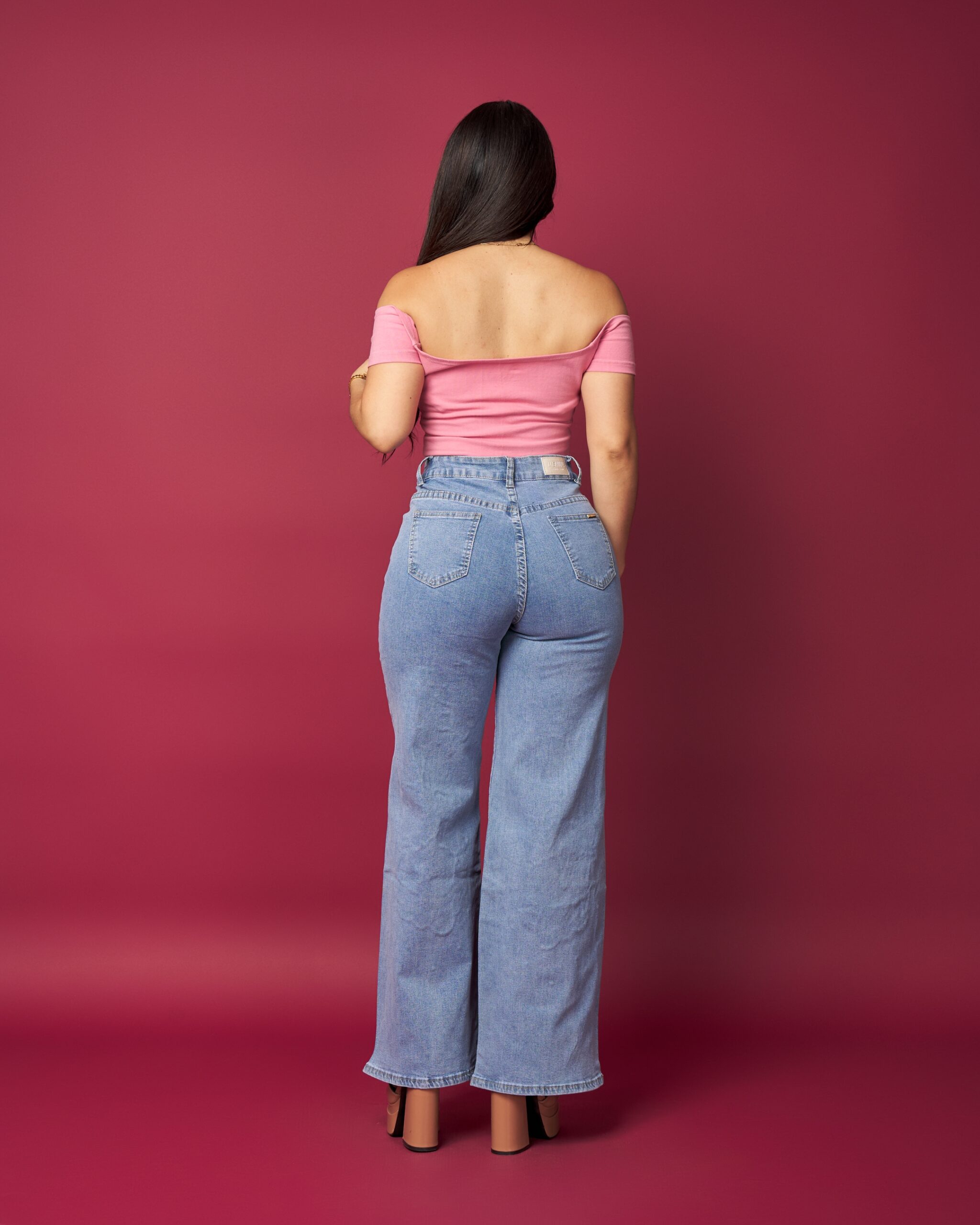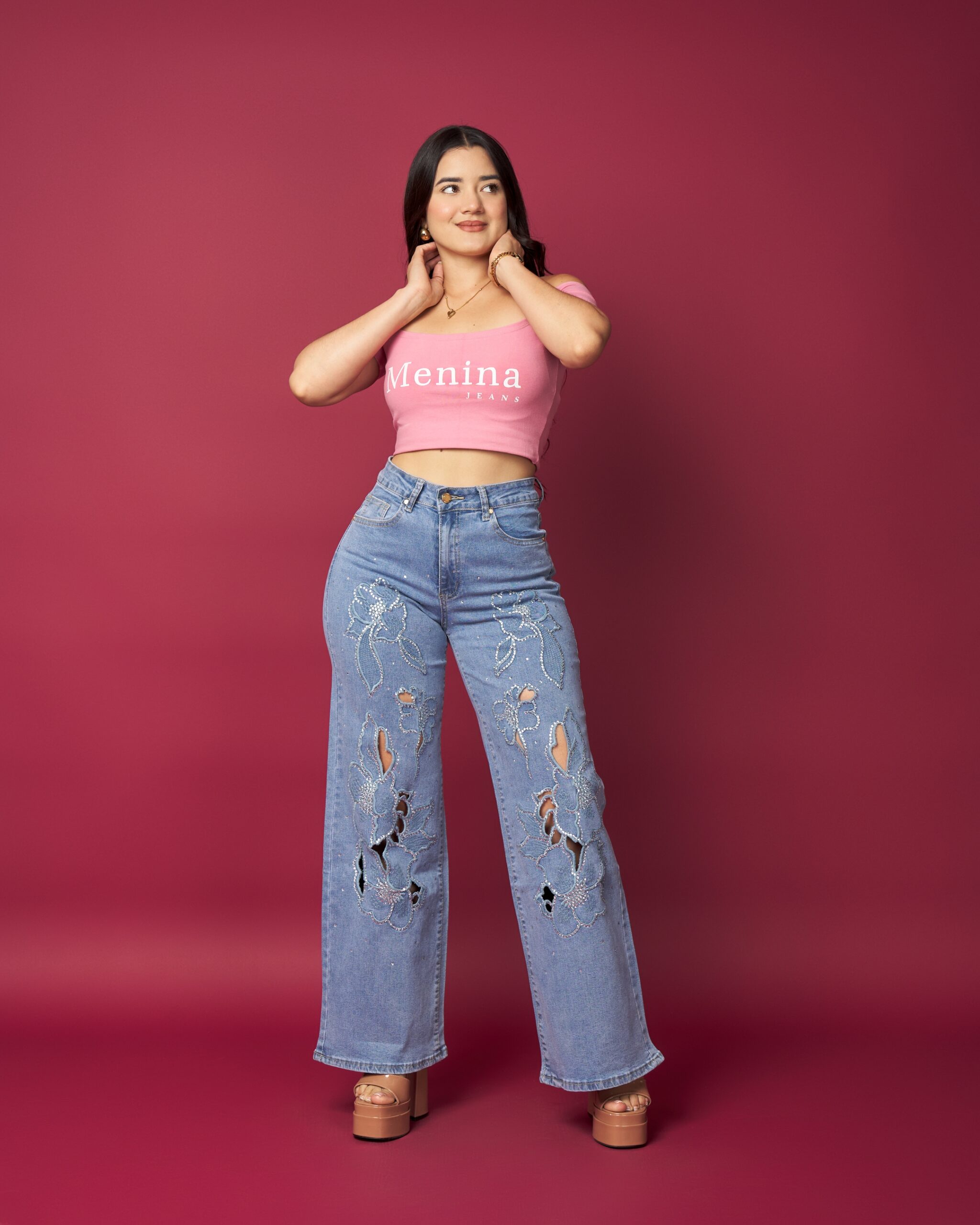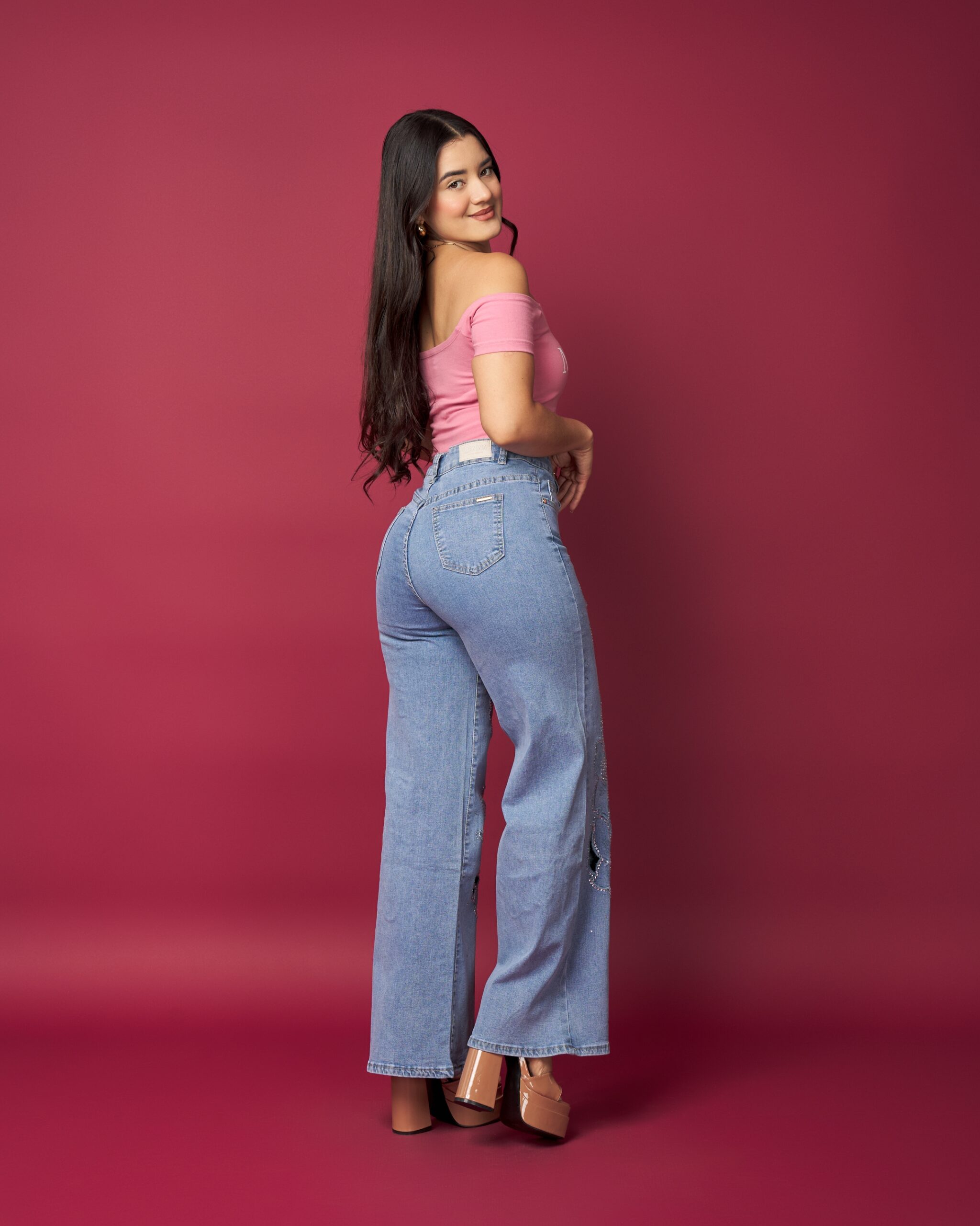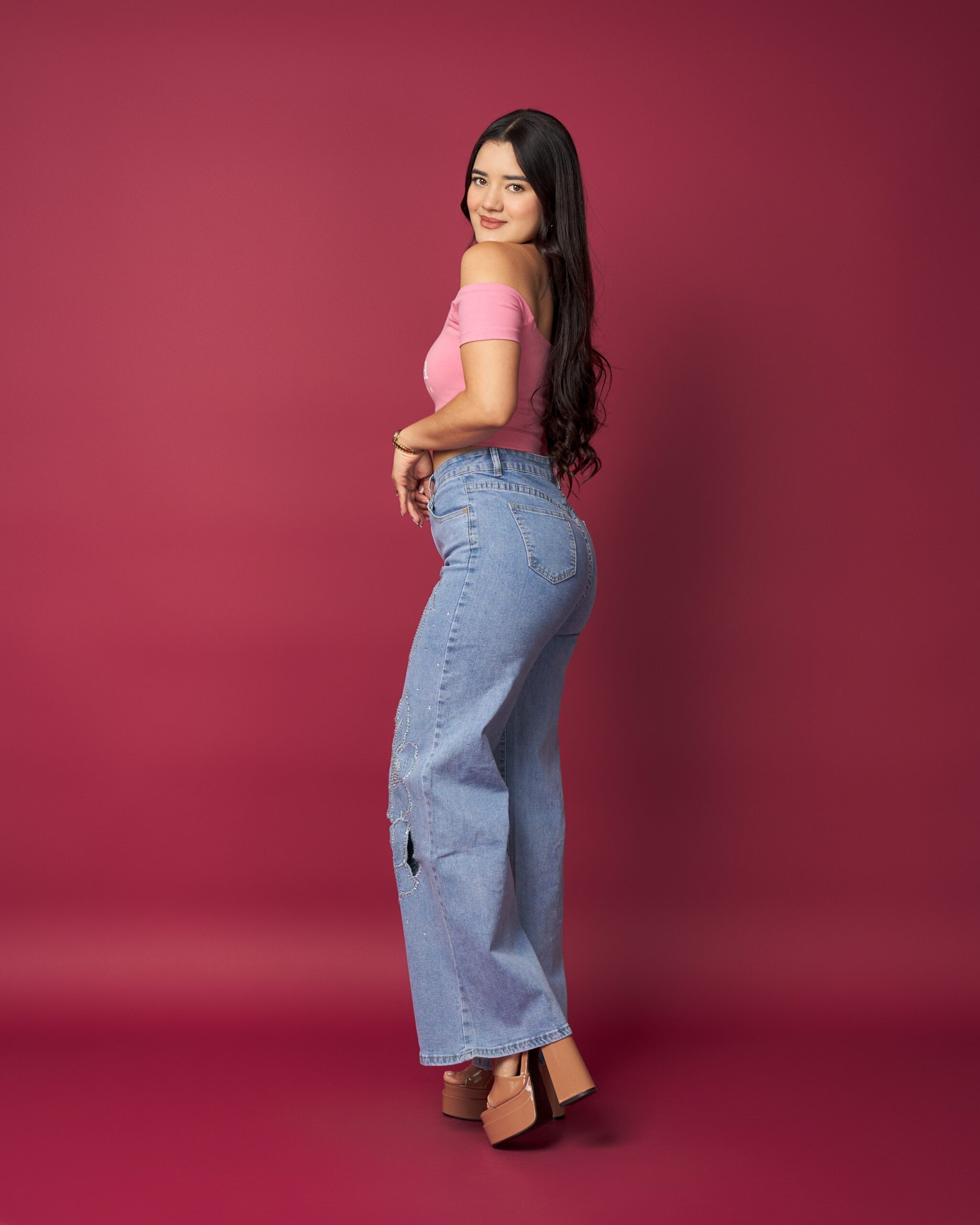Jeans de denim elasticado con elegante diseño wide leg, destacado por sus bordados frontales con aplicaciones que aportan un toque femenino y sofisticado. Su tiro alto realza la silueta y ofrece un calce cómodo, ideal para looks de día o de noche con un estilo único.