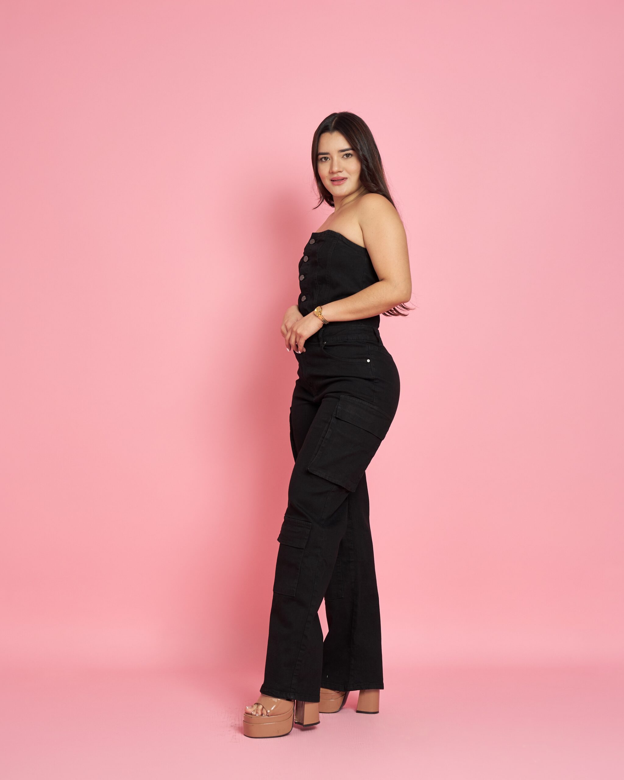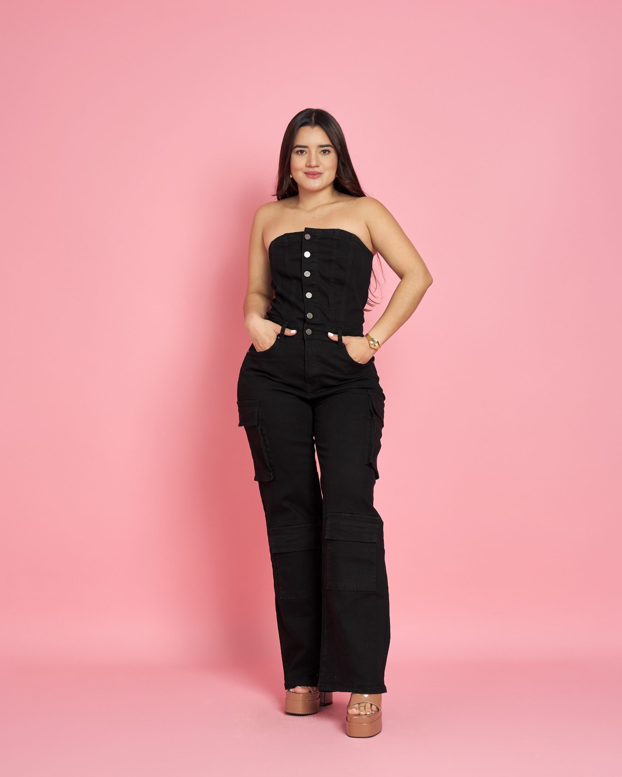 Enterito MB419-3 en denim negro elasticado, con top strapless estilo corset, botones metálicos frontales y bolsillos cargo laterales que destacan. Pierna recta, calce firme y confección premium ideal para vitrina.