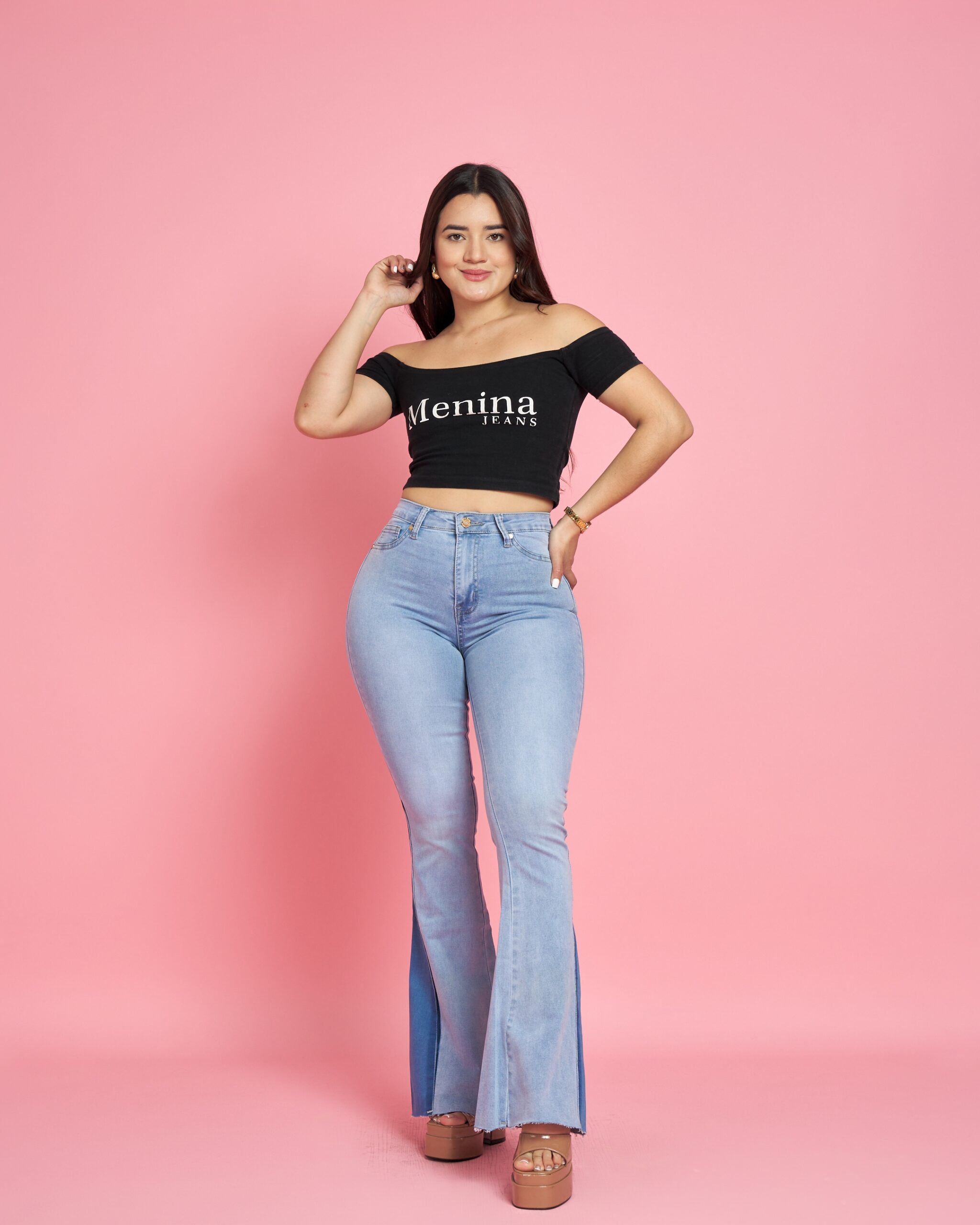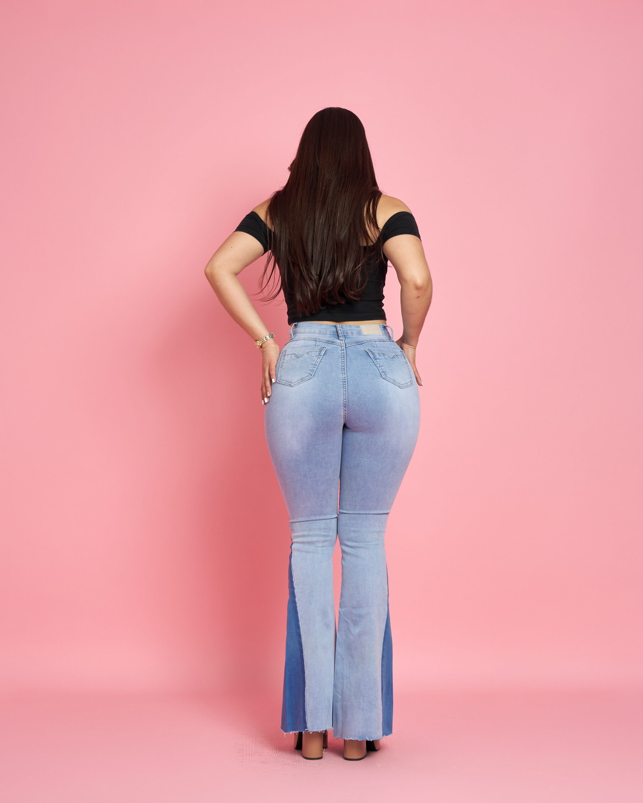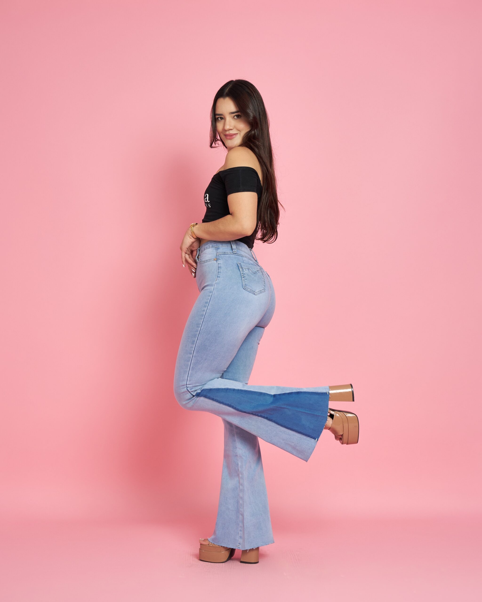 Jeans MB442 tiro alto, tono celeste suave, con bota acampanada y apertura lateral en contraste que estiliza y alarga la figura. Fit que realza, denim suave y elasticado para máximo confort