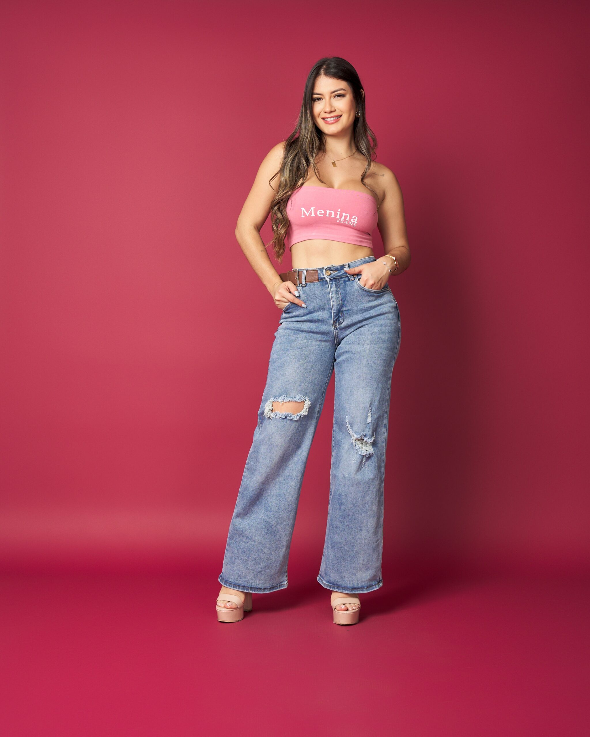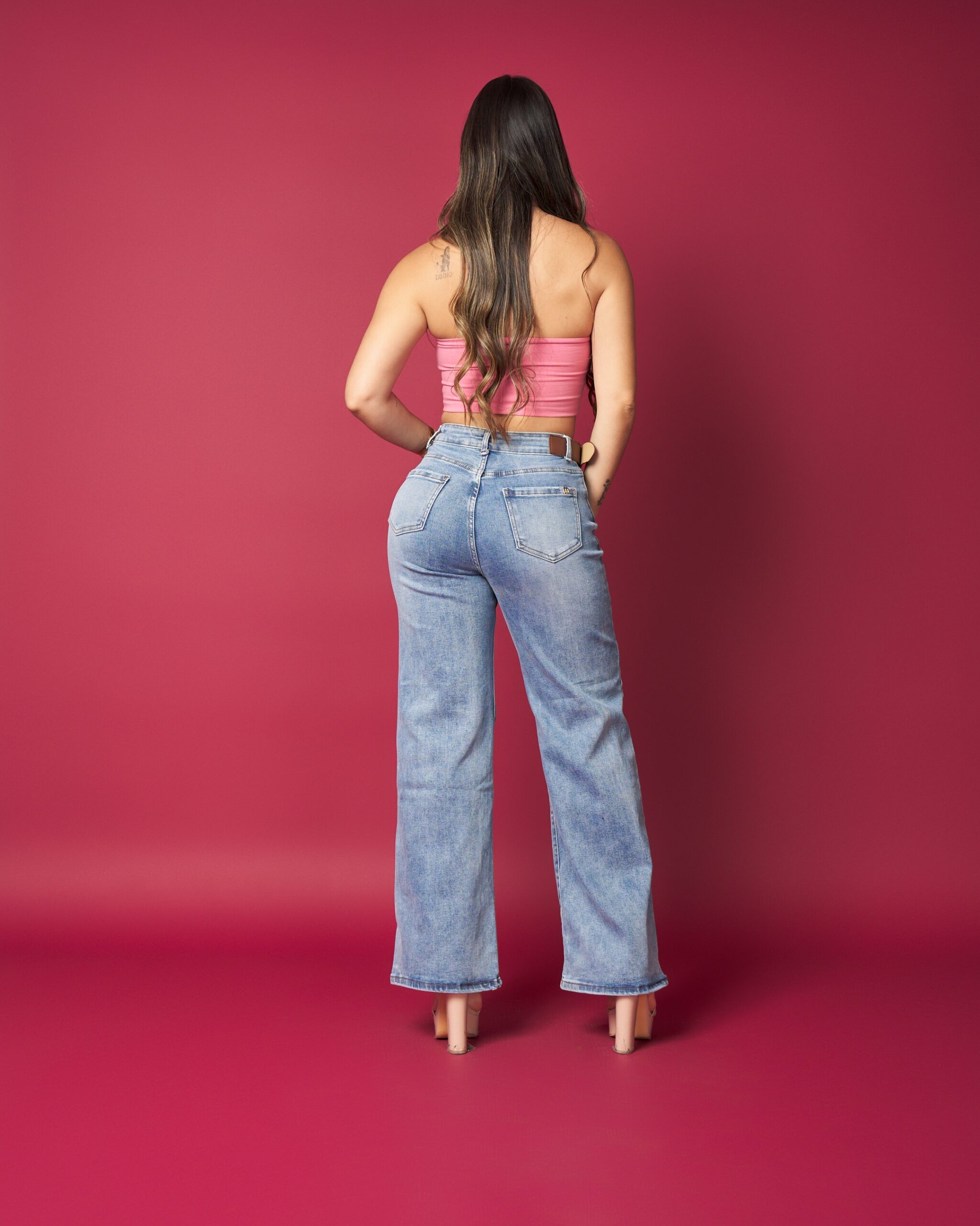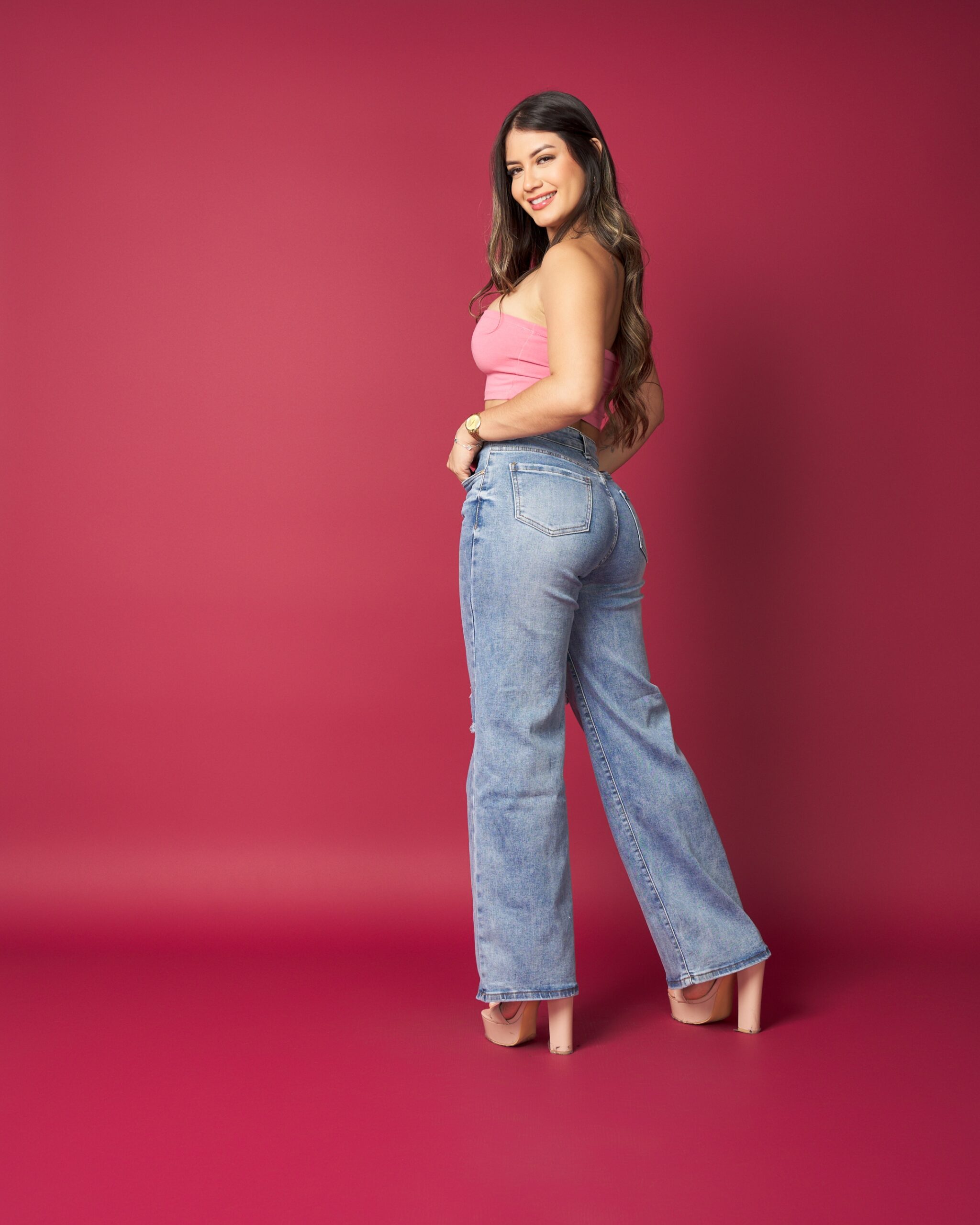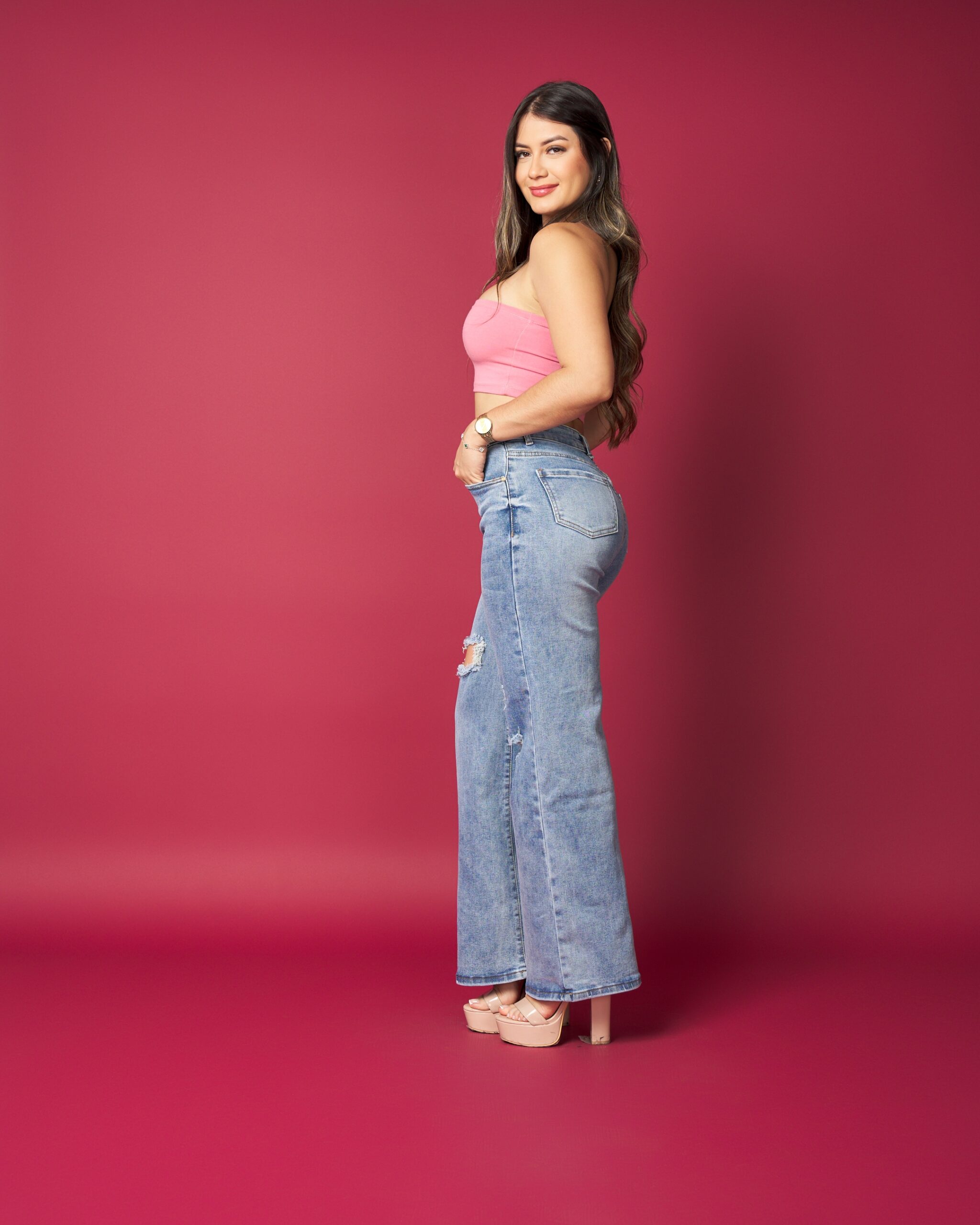 El jeans MB7001 combina un corte recto de caída amplia con un lavado azul clásico y detalles rasgados que aportan ese toque moderno y urbano. Su tiro alto estiliza la silueta y entrega un calce cómodo para usar todo el día.