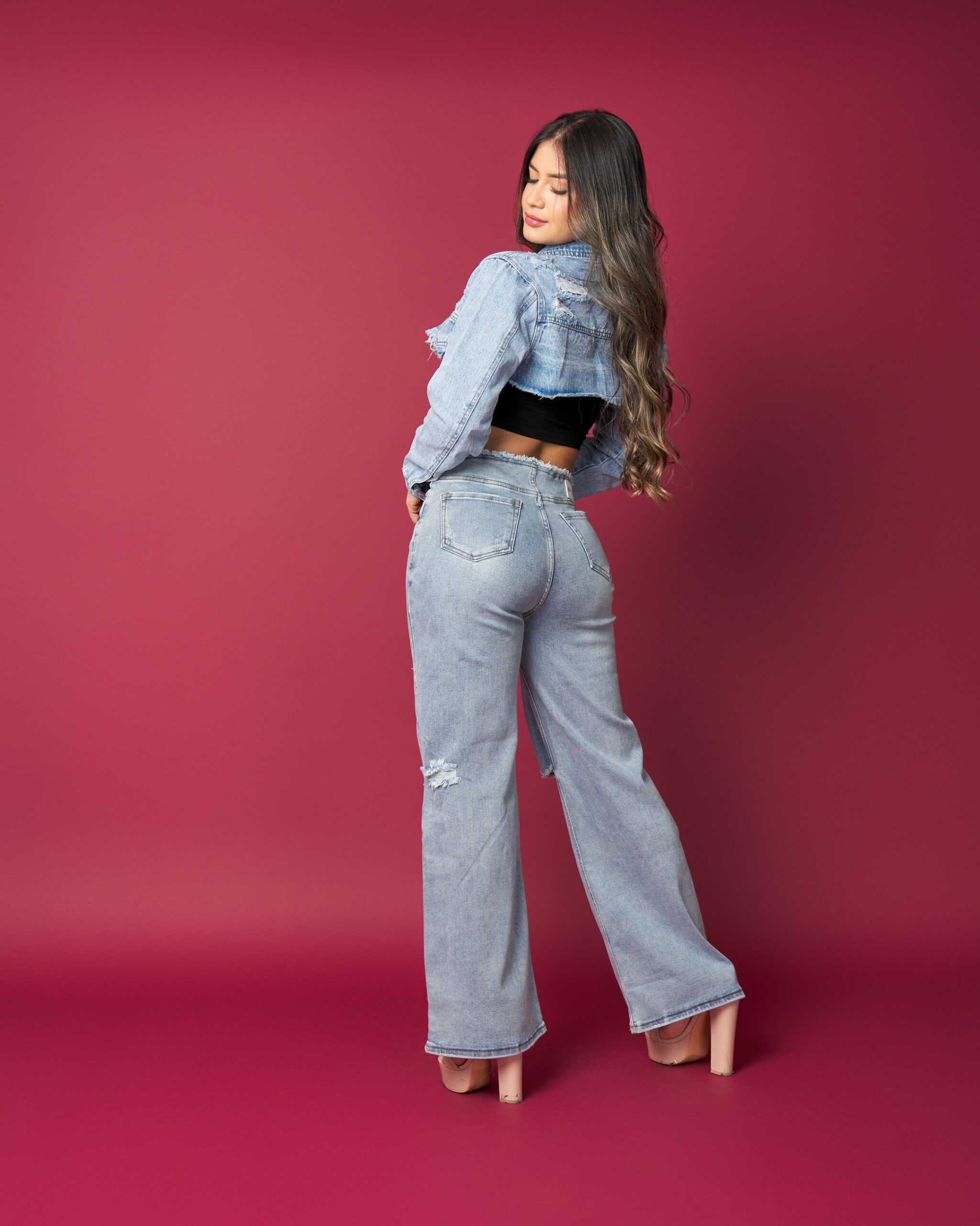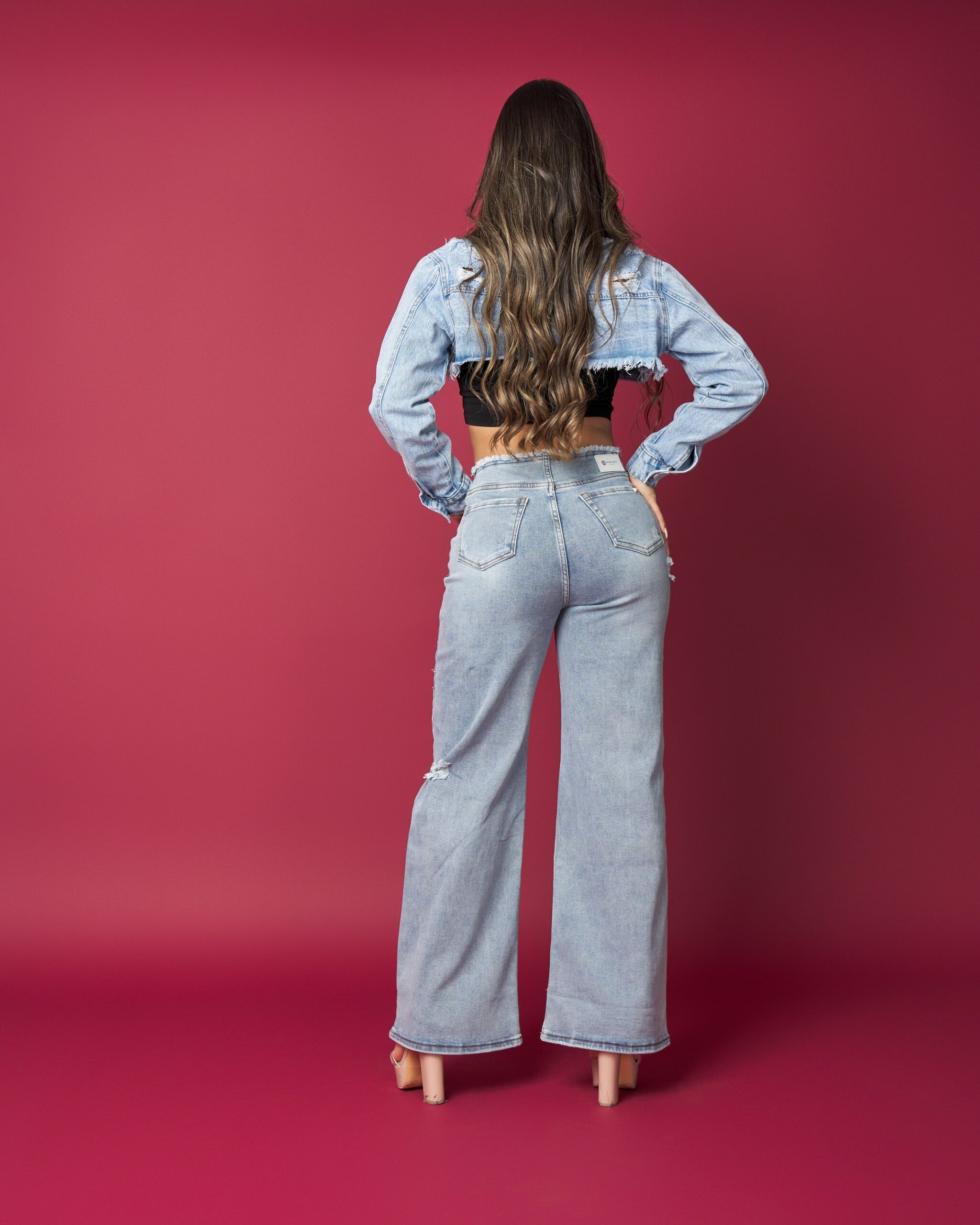 Jeans wide leg tiro alto en mezclilla celeste clara, con roturas delicadas en rodillas que le dan un look moderno sin perder elegancia. Calce perfecto en cintura y cadera, con caída ancha que estiliza y se mueve increíble.