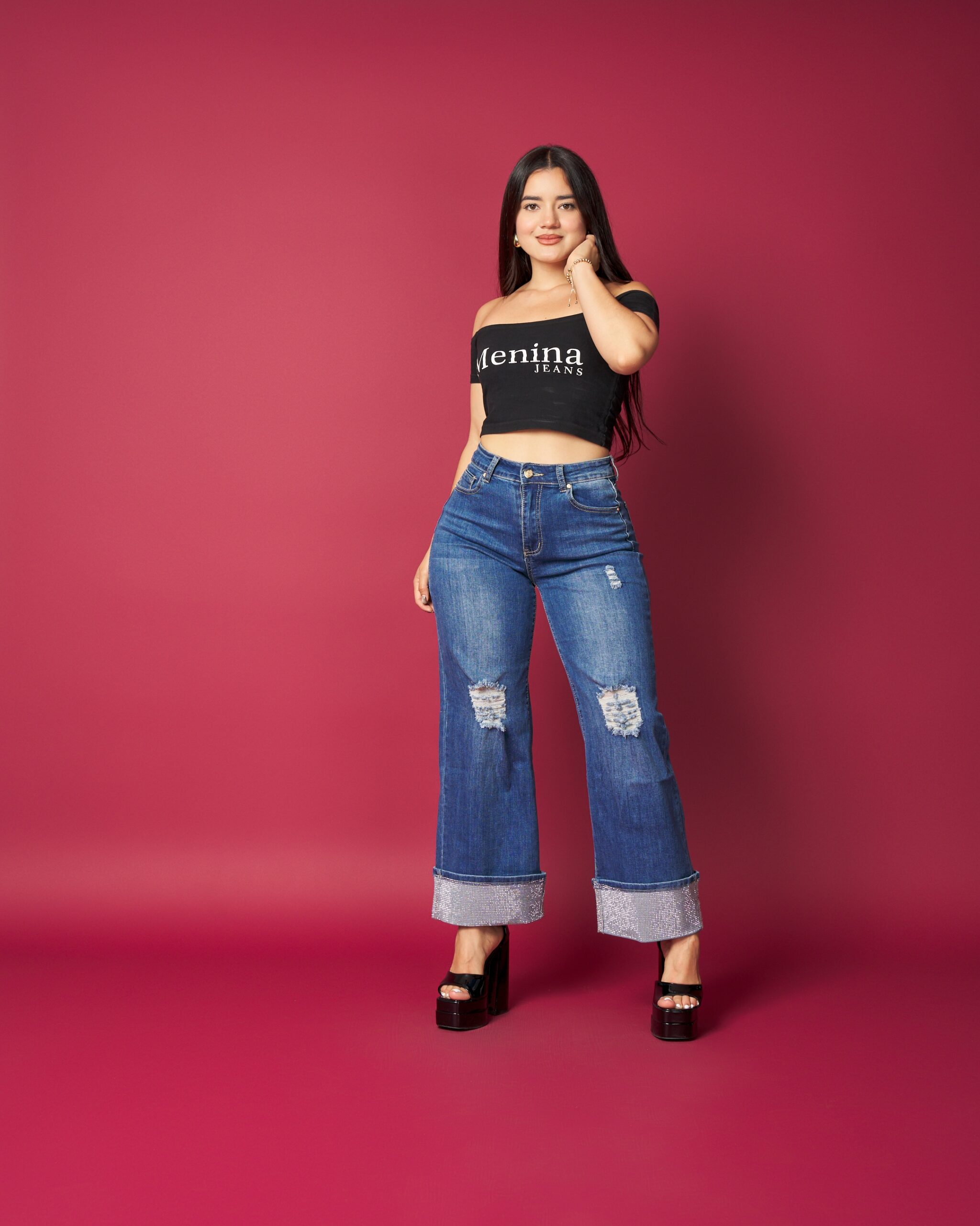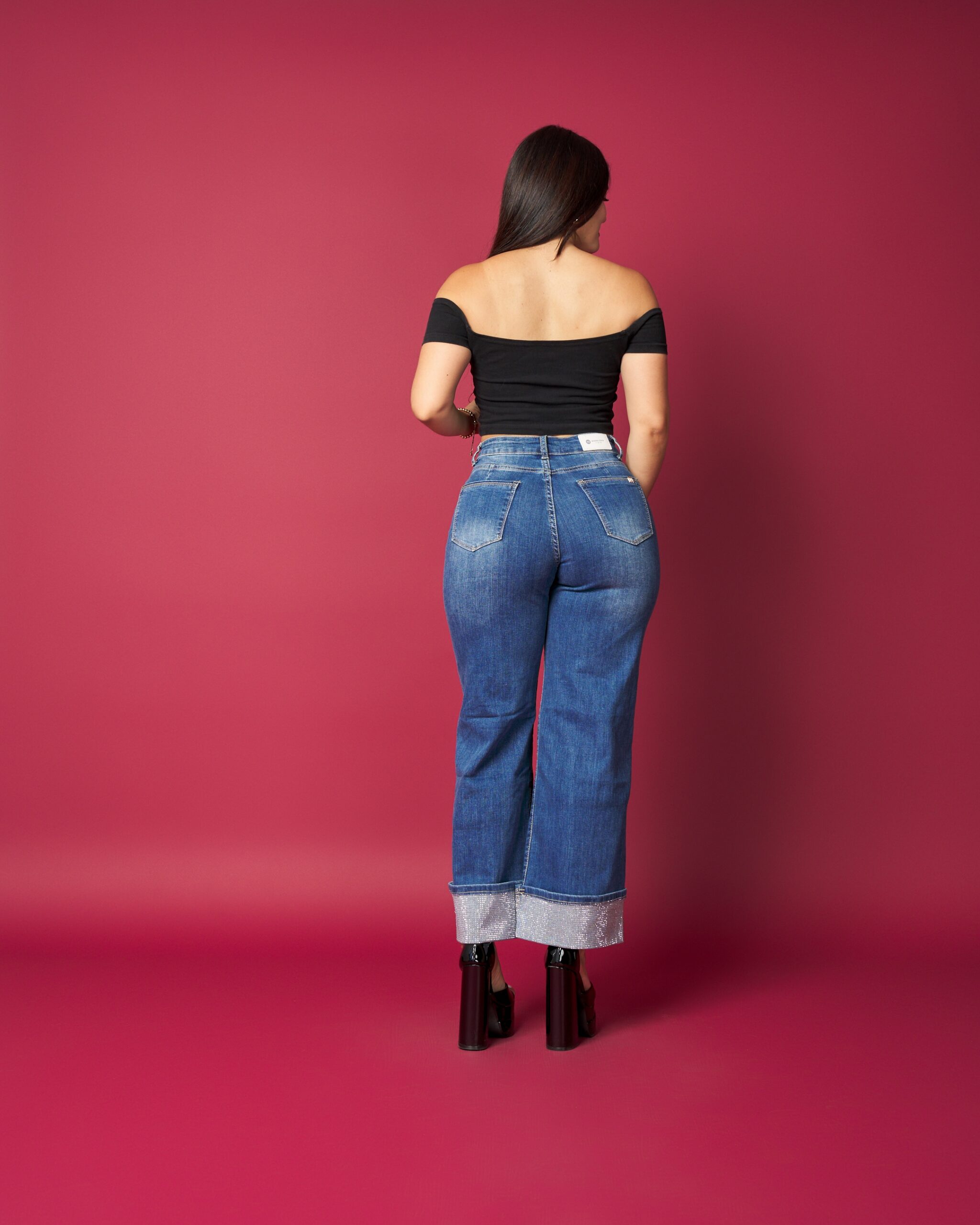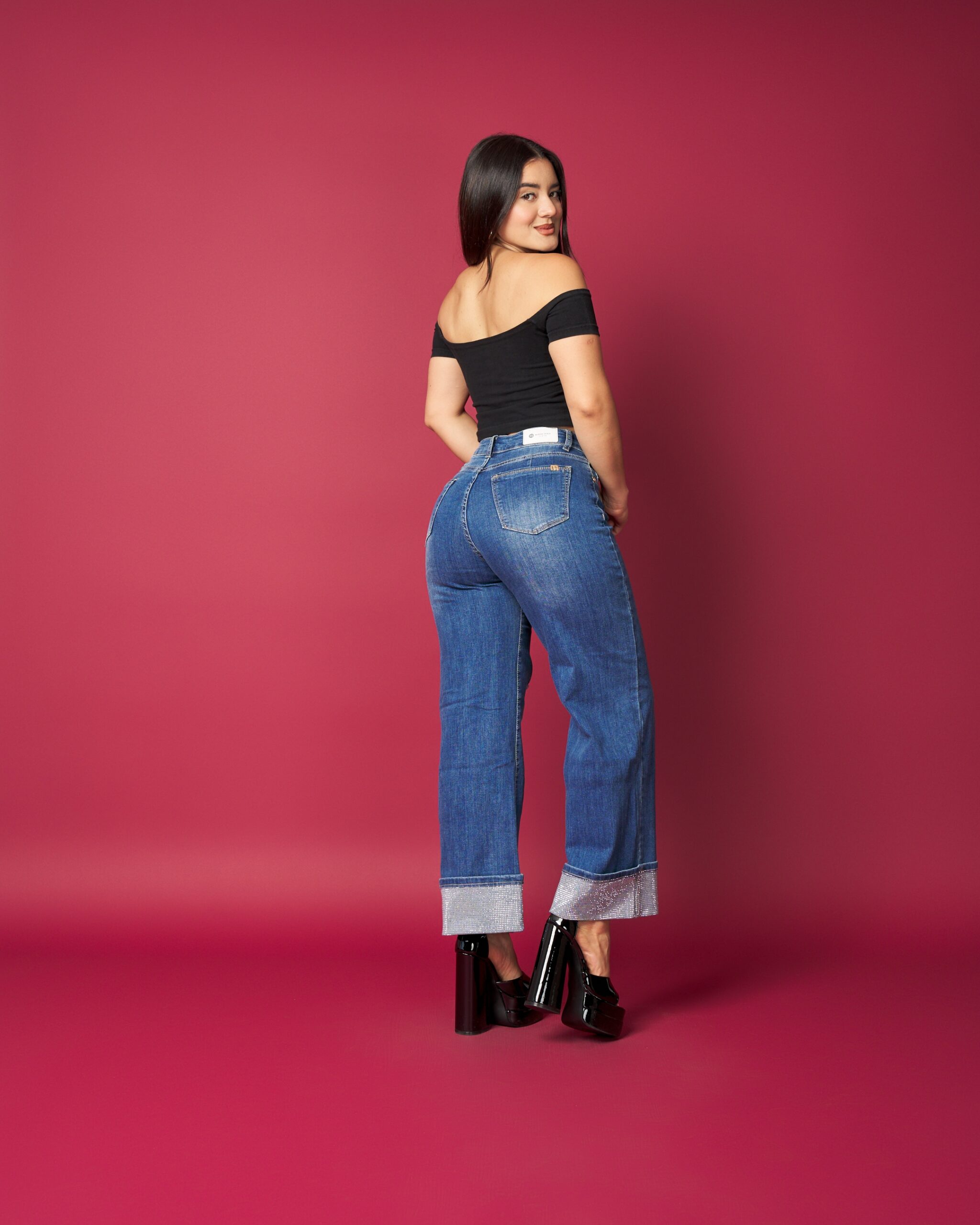 Jeans de tiro alto con corte flare, diseñado para estilizar la figura y alargar visualmente las piernas. Destaca por su basta con aplicación brillante, que le da un toque moderno y sofisticado sin perder comodidad. Denim de buen calce, ideal para looks urbanos o más elegantes según cómo lo combines.