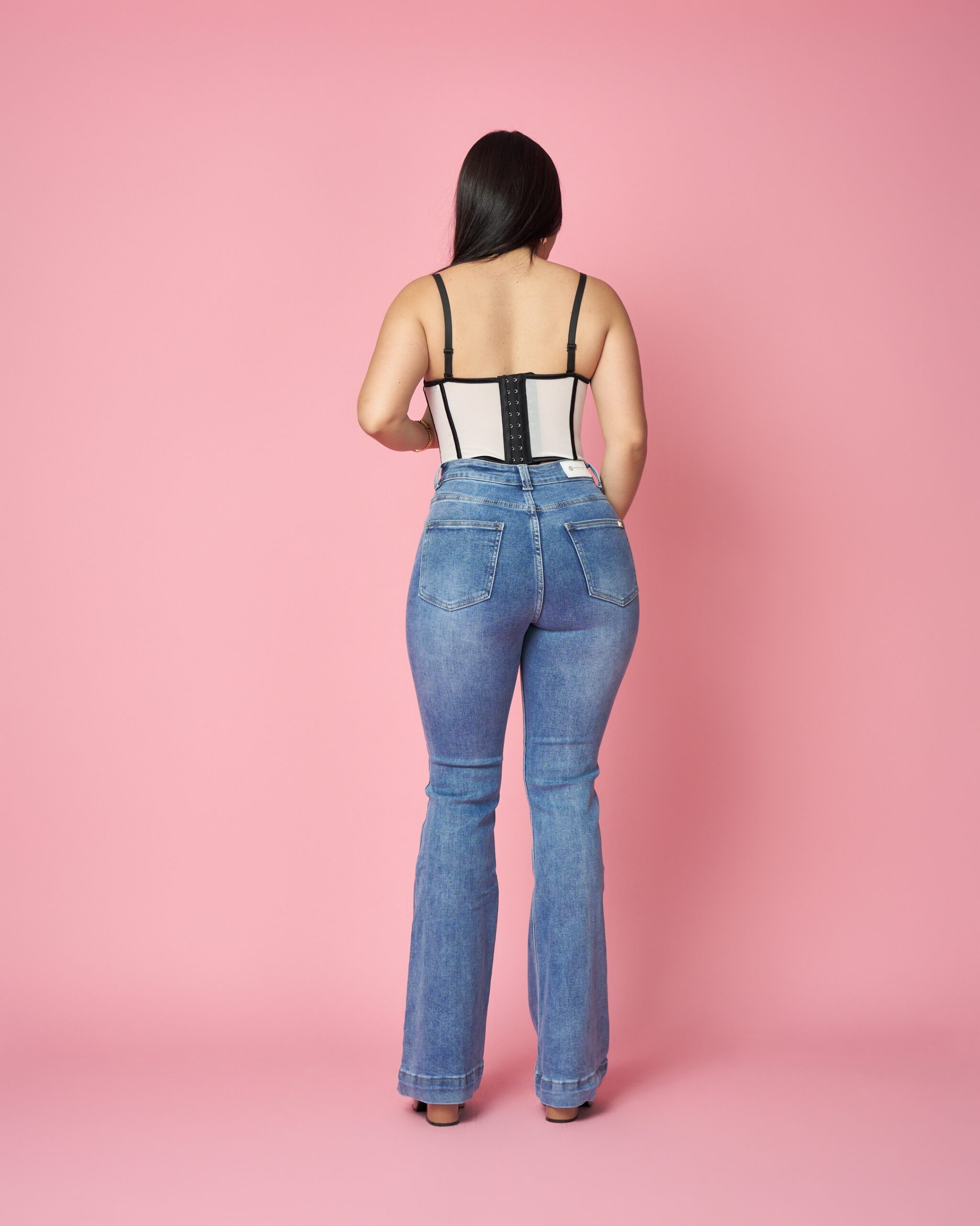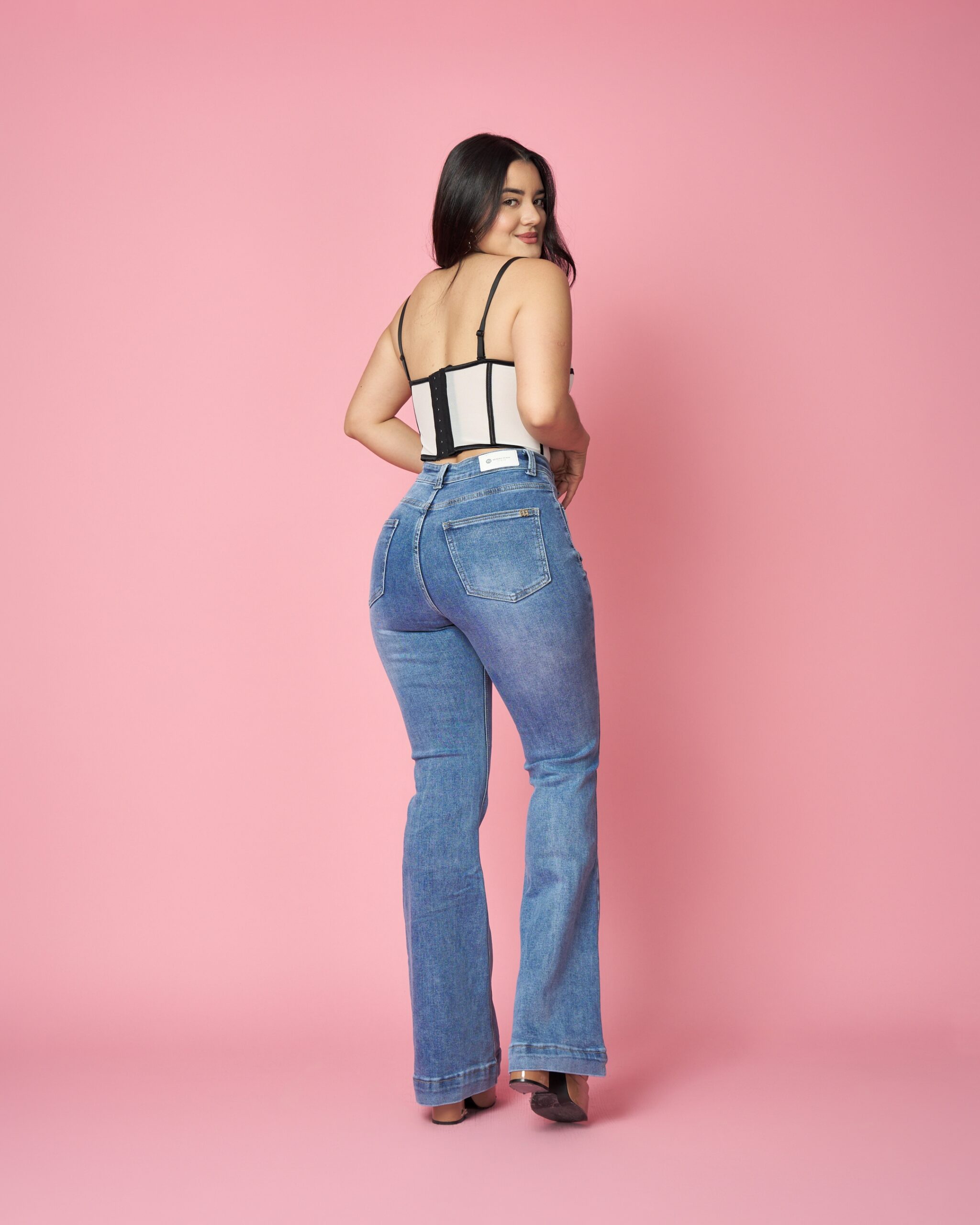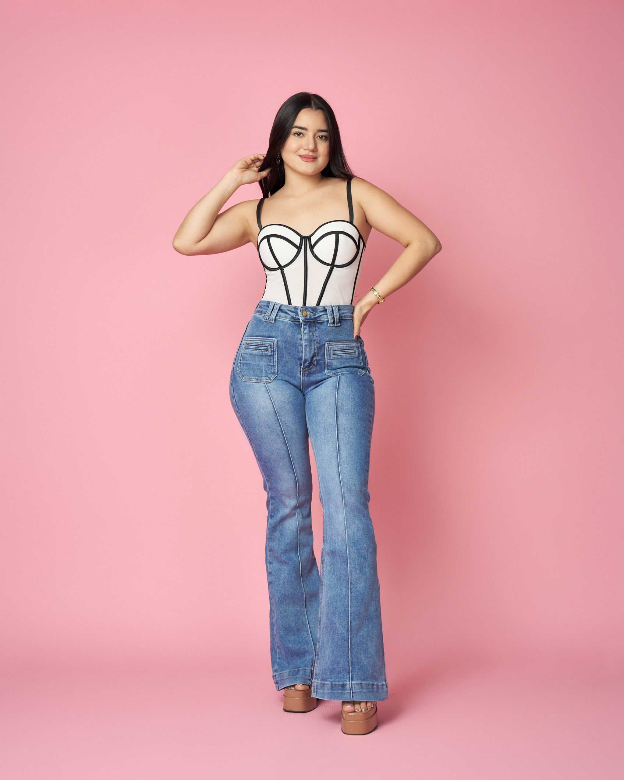 Jeans flare tiro alto, confeccionado en elasticado de alta calidad que moldea la figura y mantiene la estructura perfecta. Su diseño incluye costuras delanteras que estilizan, bolsillos frontales decorativos y un entalle impecable en cadera y cintura. Ideal para un look moderno, cómodo y súper favorecedor.