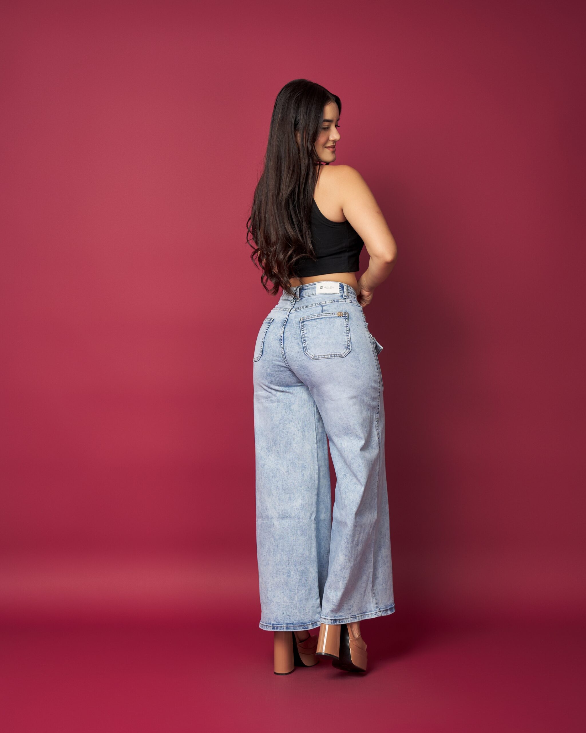 Jeans de corte wide leg que aporta estilo y comodidad, con bolsillos delanteros protagonistas que suman un look moderno y urbano. Confeccionado en denim de excelente calidad, de calce relajado y caída fluida, ideal para tiendas que buscan diferenciar su oferta con modelos en tendencia y alta rotación.