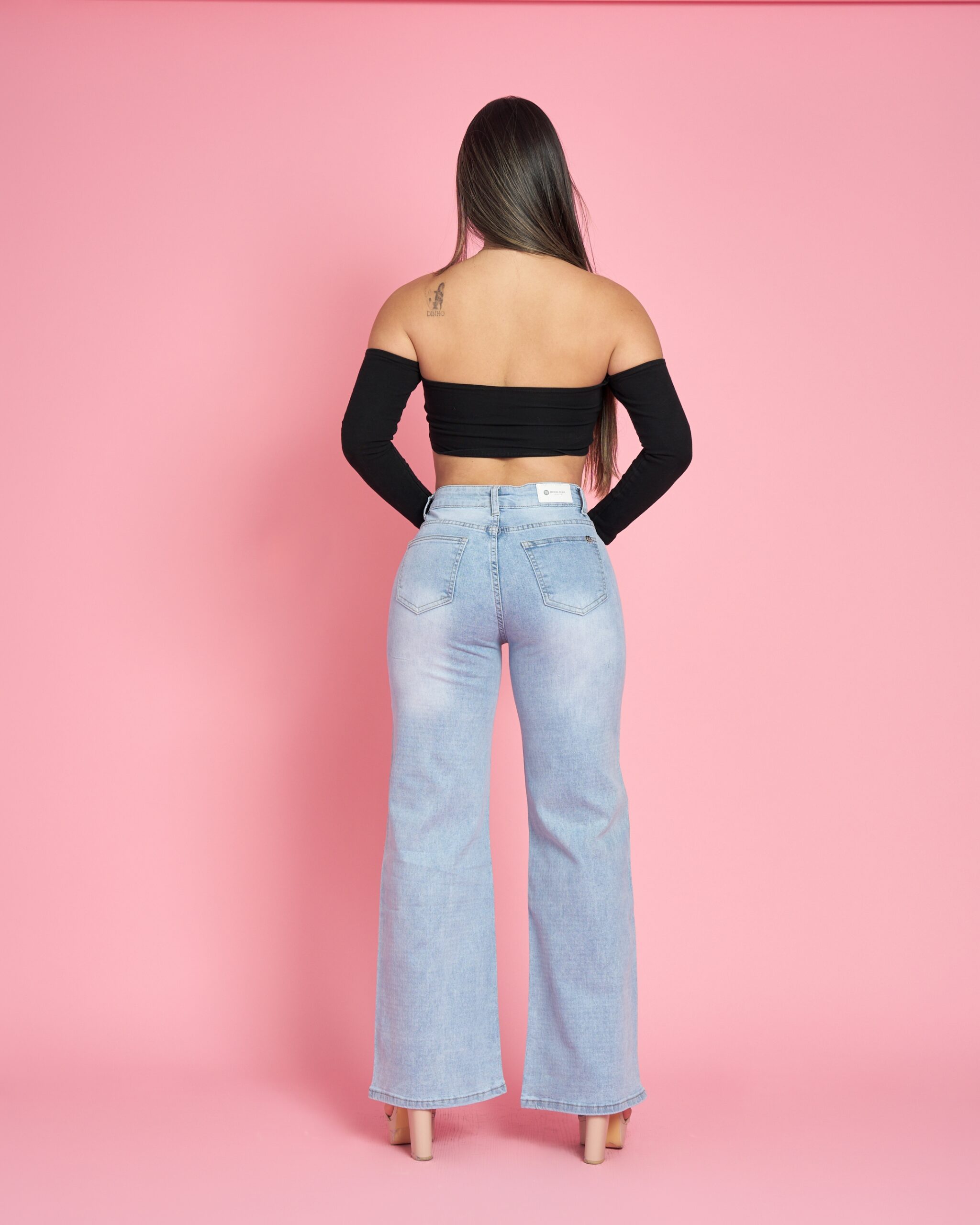 Es un jeans wide leg tiro alto, confeccionado en denim elasticado, ideal para lograr un calce firme, cómodo y muy favorecedor.