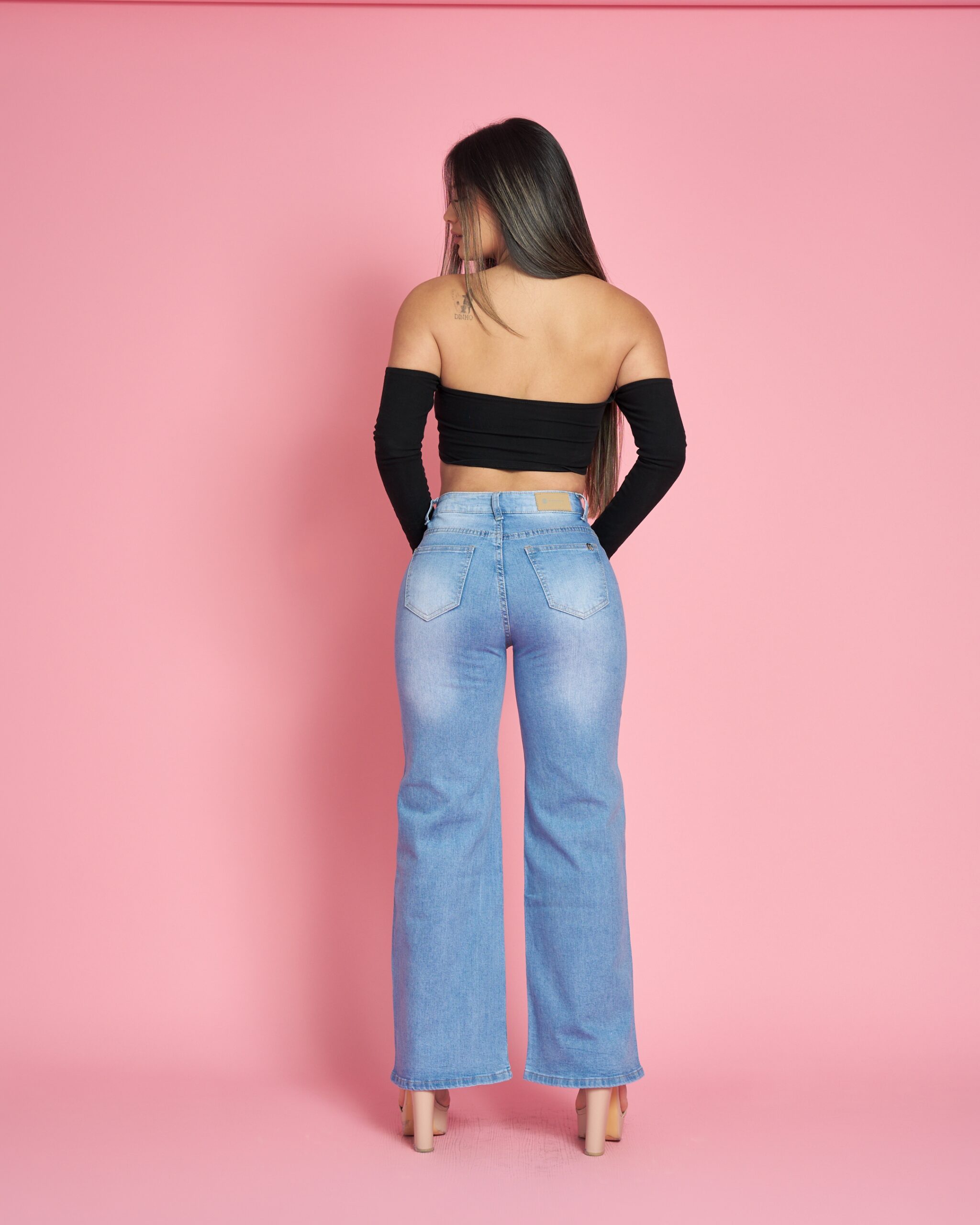 Jeans wide leg tiro alto con brillos completos al frente, un modelo elegante y súper vendible. Tela suave, cómoda y con excelente calce que estiliza la figura.