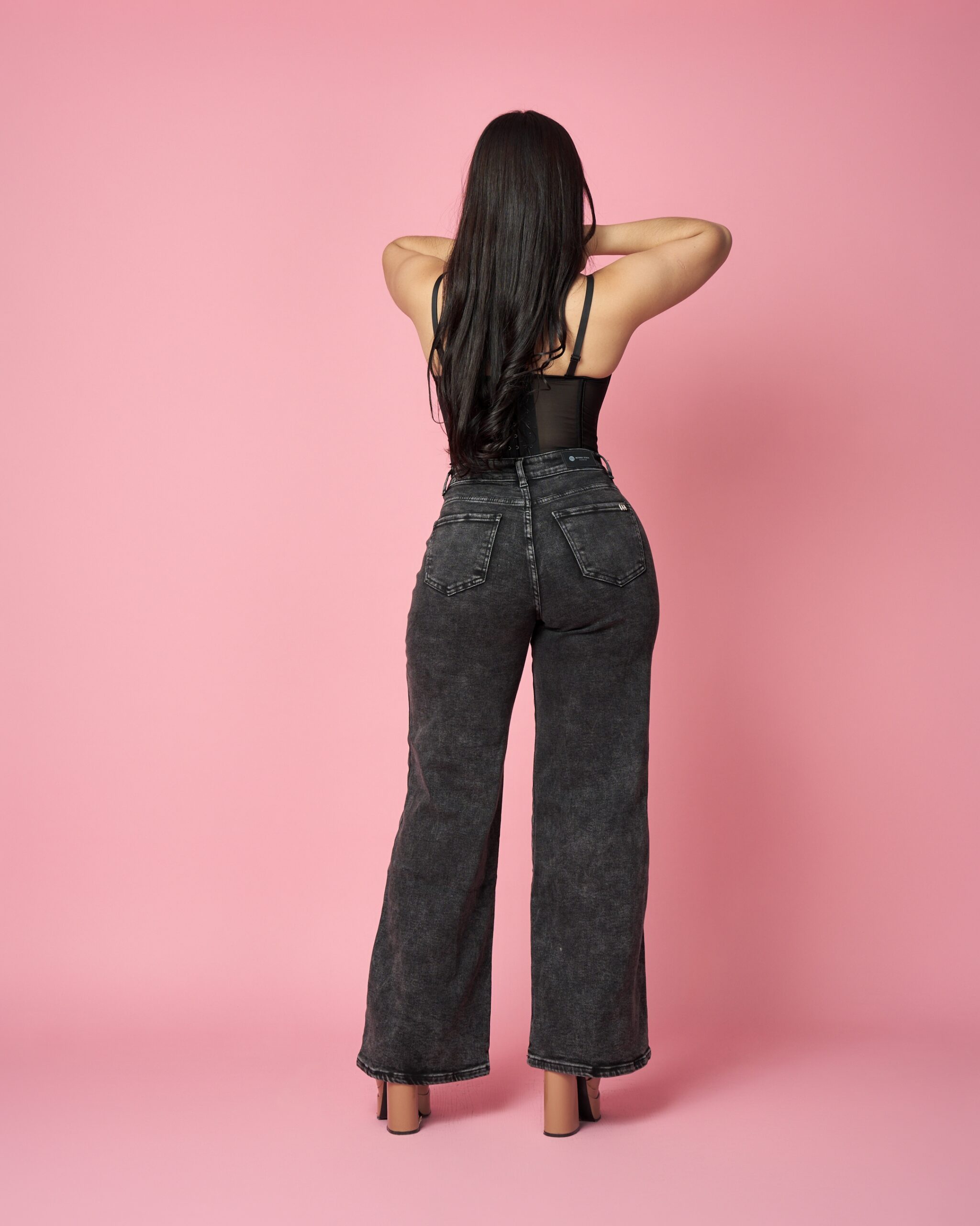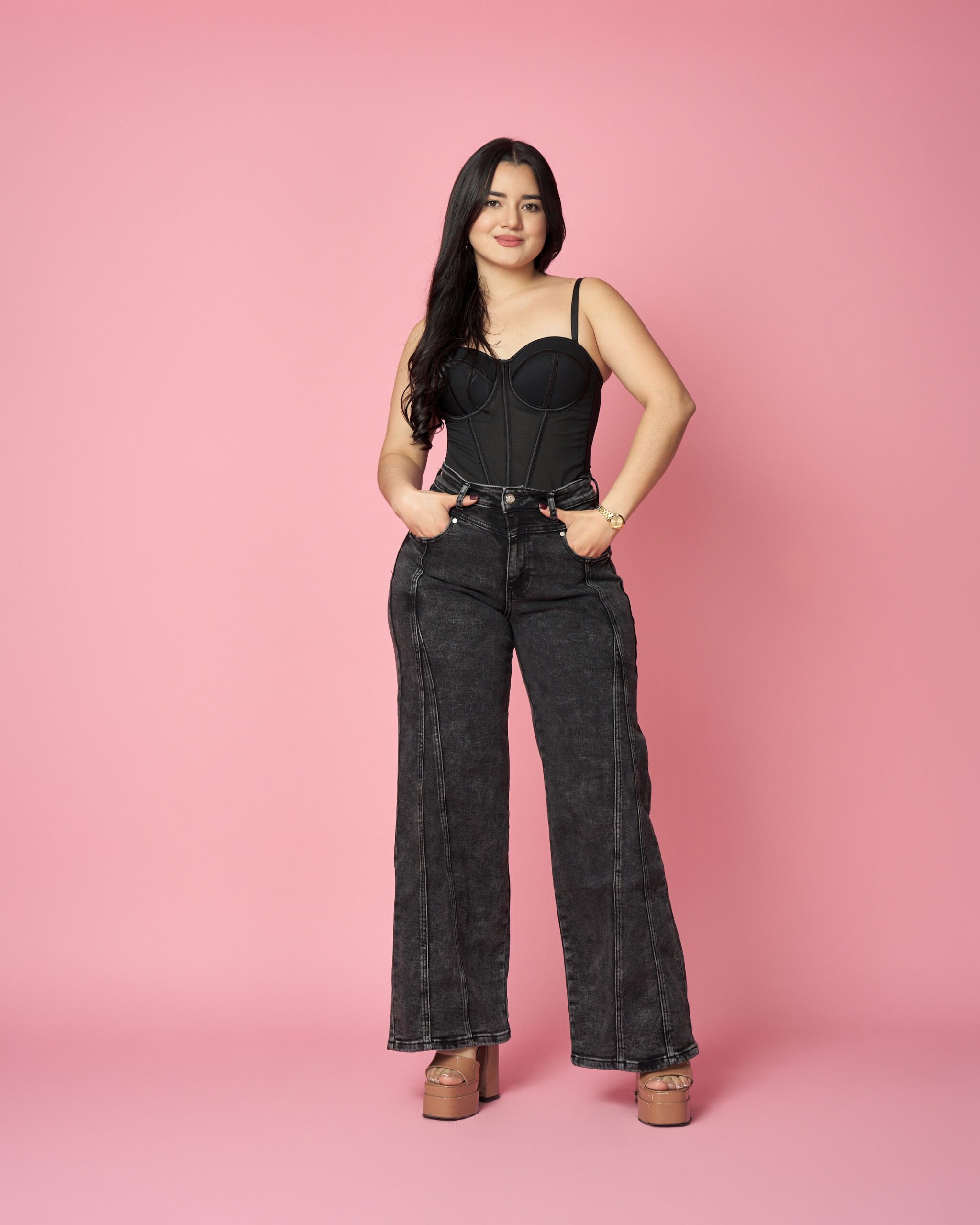 Jeans wide leg en mezclilla elástica con lavado negro ahumado y costuras marcadas que estilizan la figura. Tiro alto que realza cintura y moldea cadera, con un fit amplio y cómodo en pierna. Un modelo moderno, firme y muy favorecedor para todo tipo de cuerpo.