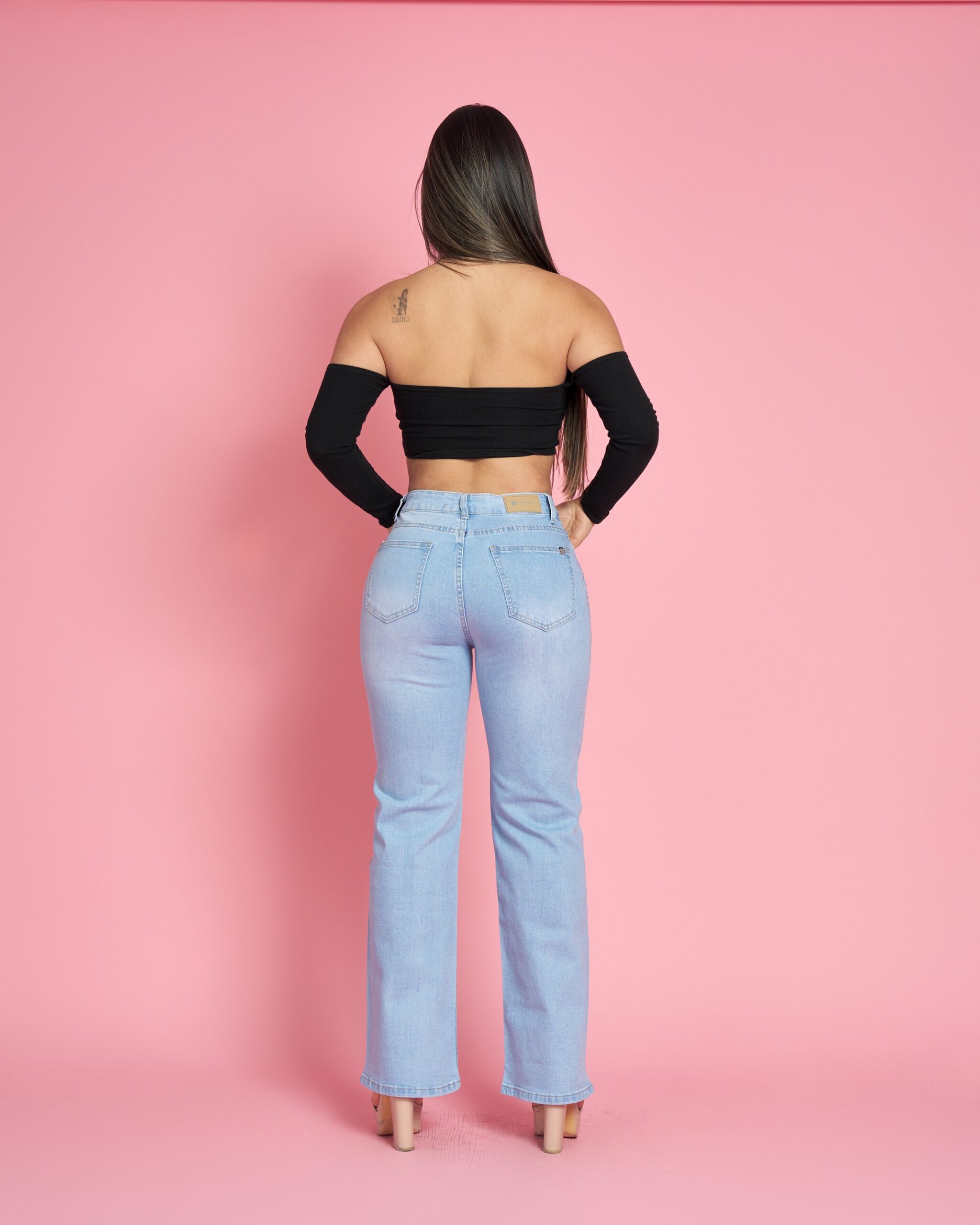 Es un jeans recto, tiro alto y color celeste claro, pensado para realzar la figura con un look moderno y femenino.