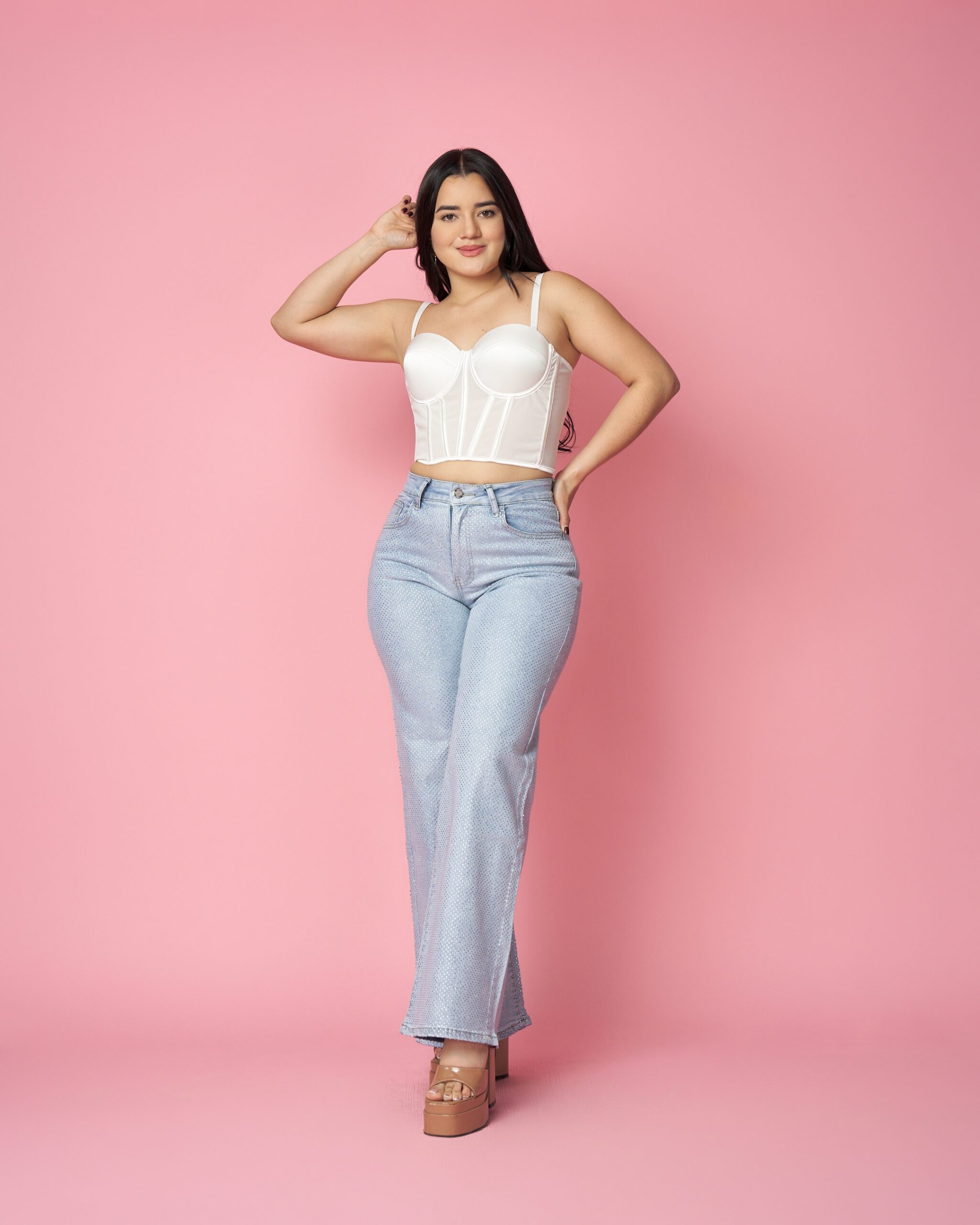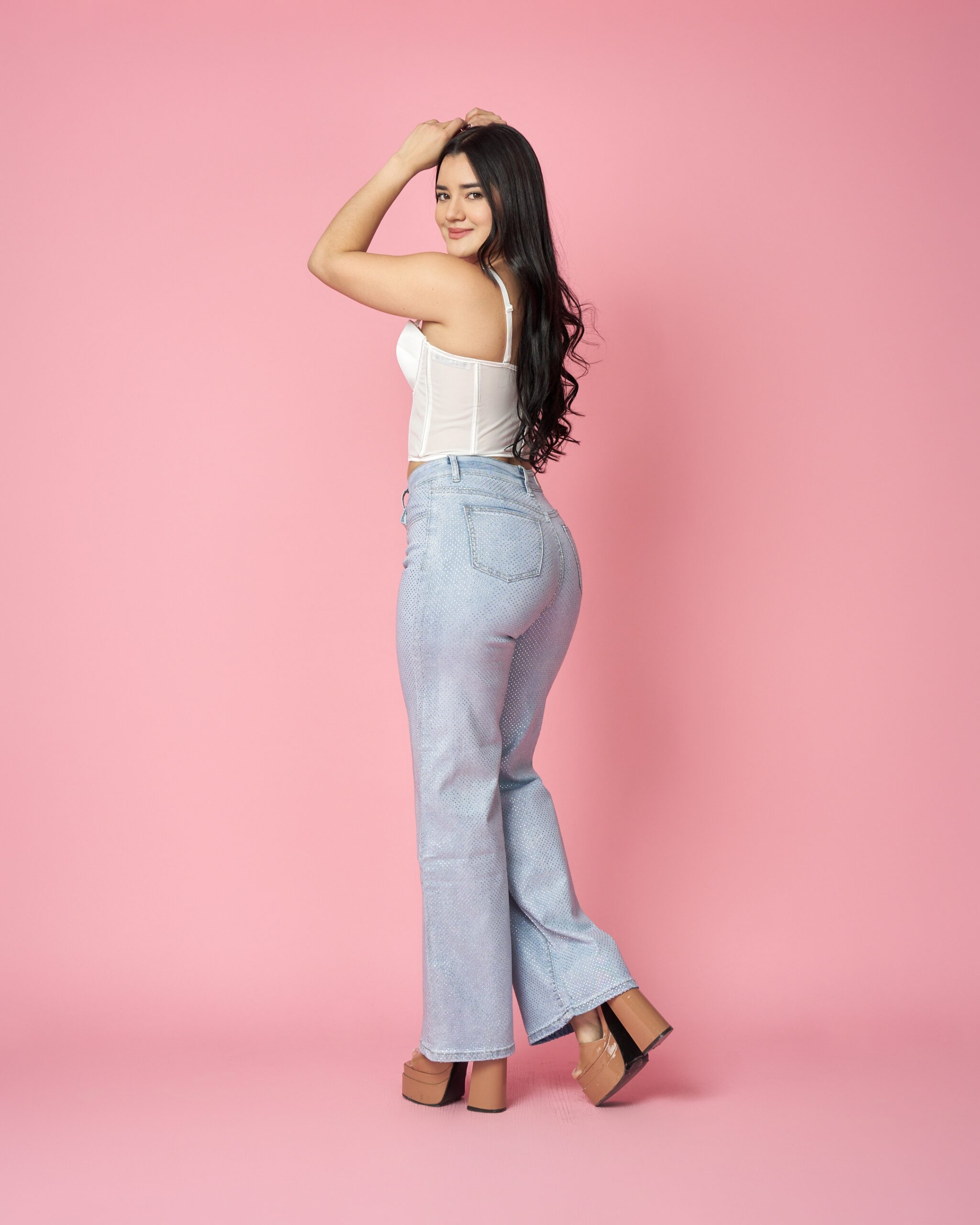 Este modelo está elaborado en denim elasticados de alta calidad con un acabado efecto brillantina en todo el tejido, que resalta sin perder elegancia. Su tiro alto moldea la cintura, realza la cadera y estiliza la figura con su corte recto ancho. Un diseño exclusivo pensado para mayoristas que buscan piezas llamativas, modernas y de excelente durabilidad para su colección.