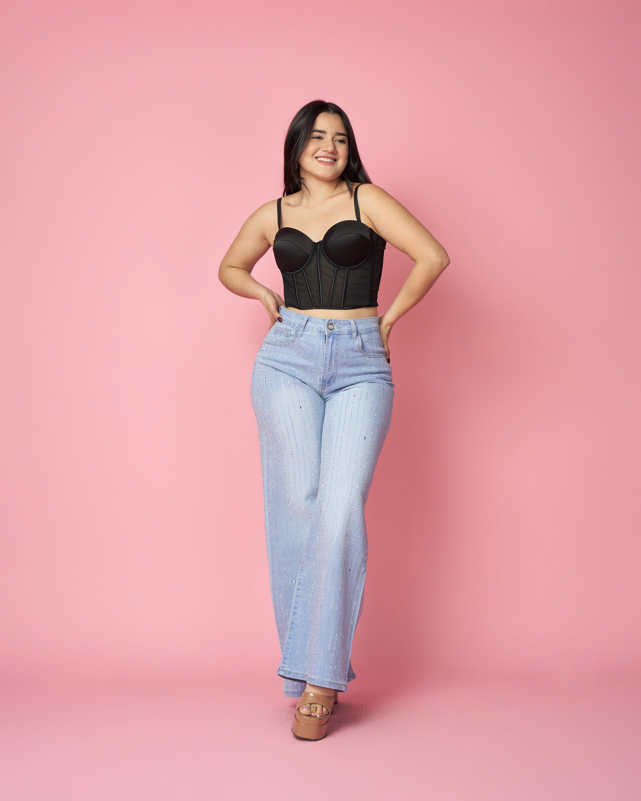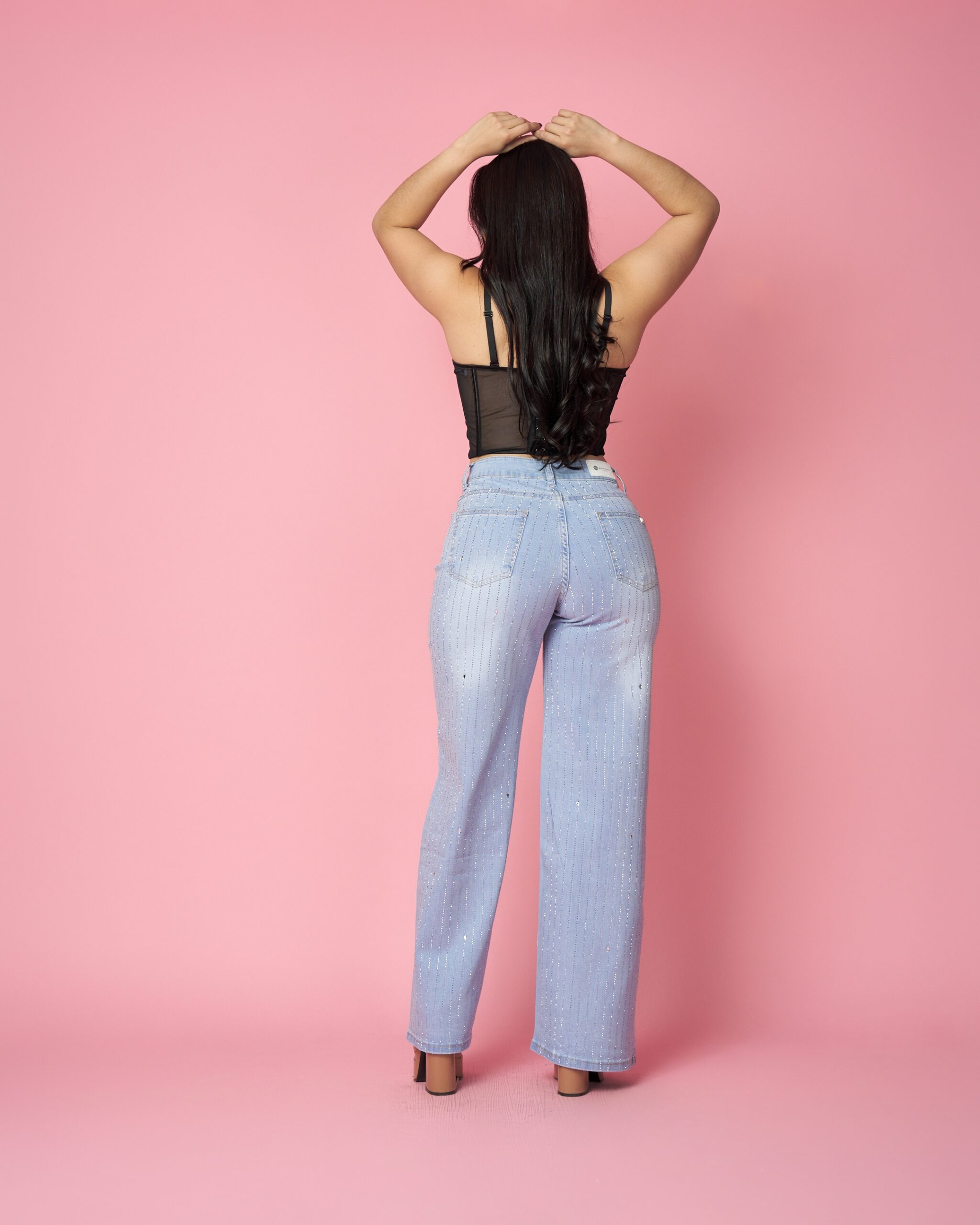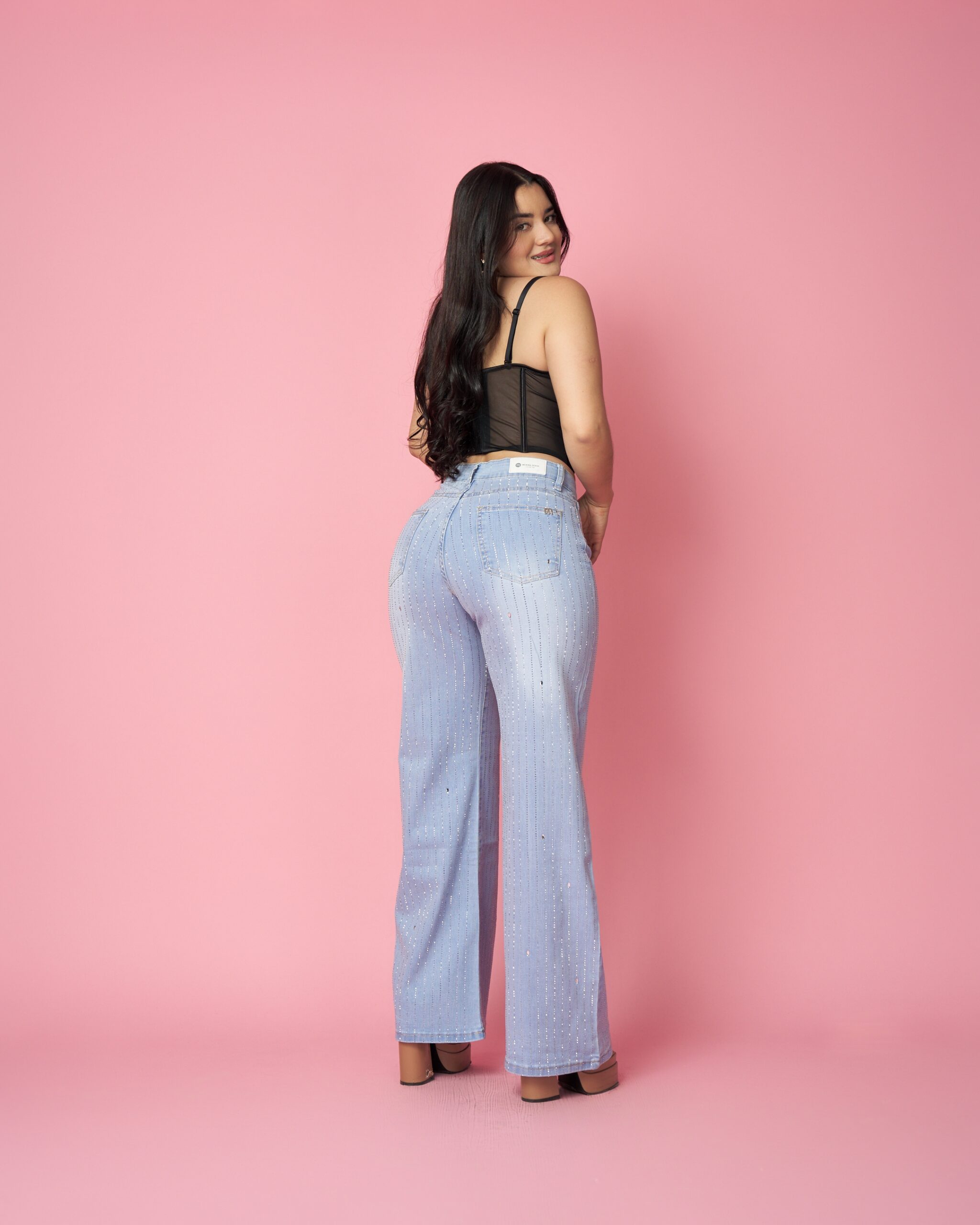 Confeccionado en denim elasticado con efecto iluminado en todo el contorno, este diseño atrae miradas y se convierte rápido en uno de los favoritos de las clientas.