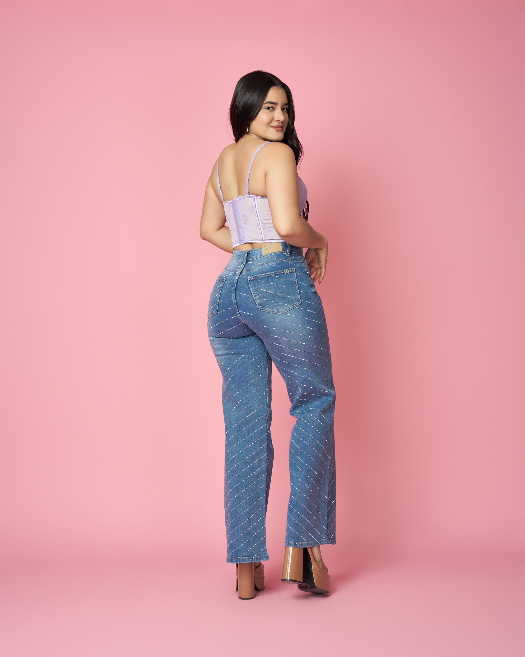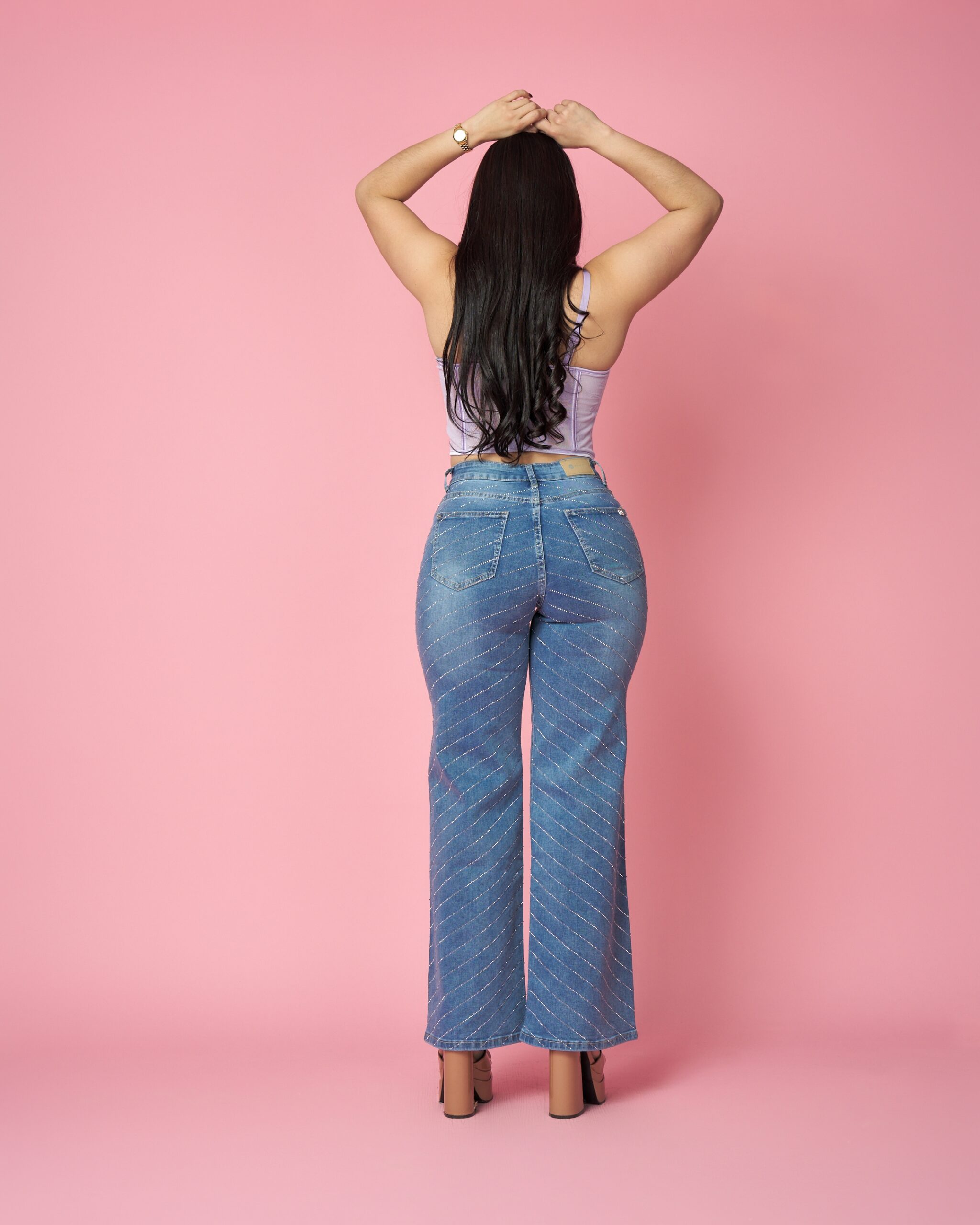 Amig@ mayorista, este modelo MB7041-2 es ideal para quienes buscan un jean llamativo, moderno y lleno de estilo. Su diseño de brillos en líneas diagonales le da un toque único que se ve espectacular en vitrina y se vende rapidísimo, sobre todo entre clientas que aman los looks diferentes y con personalidad.