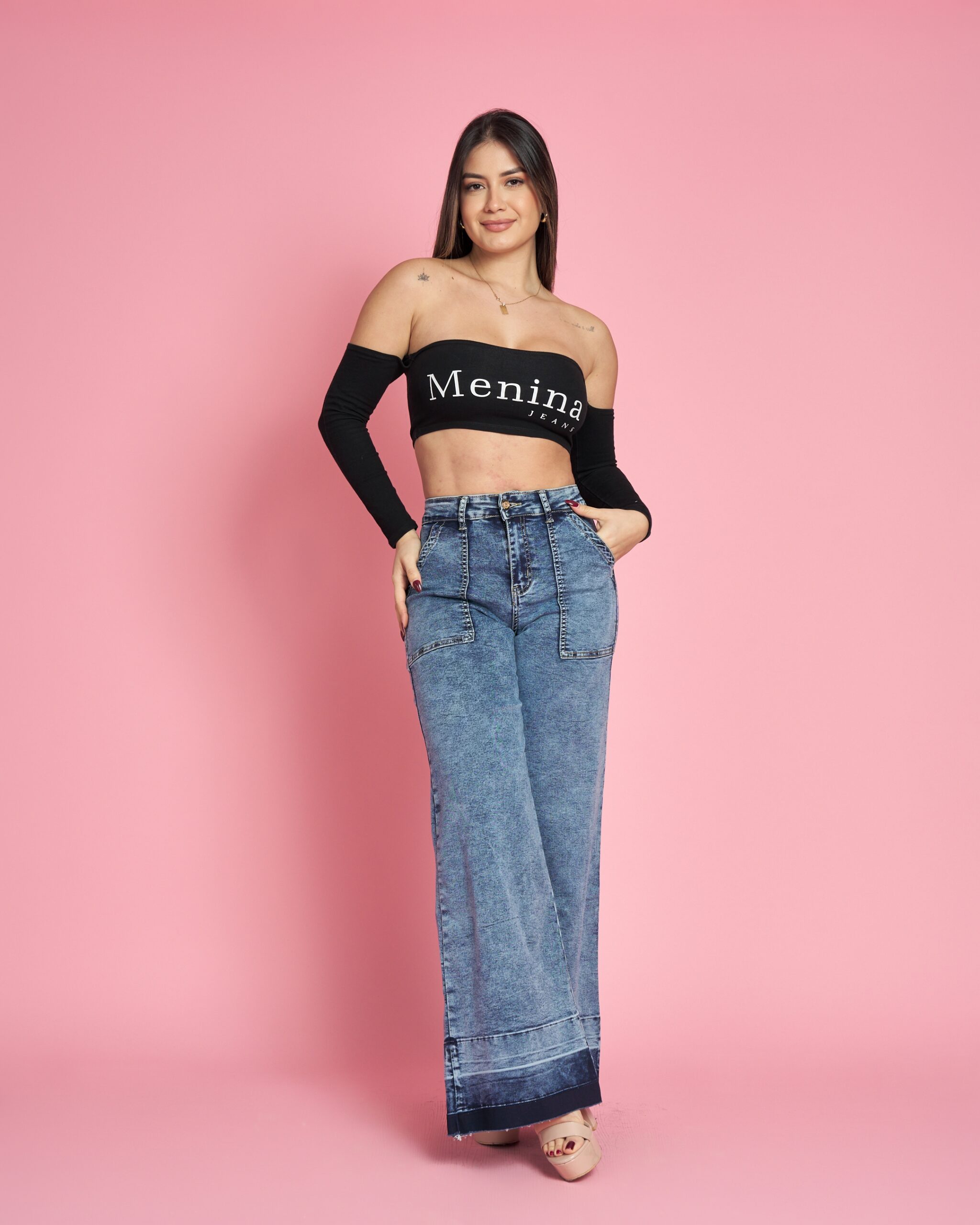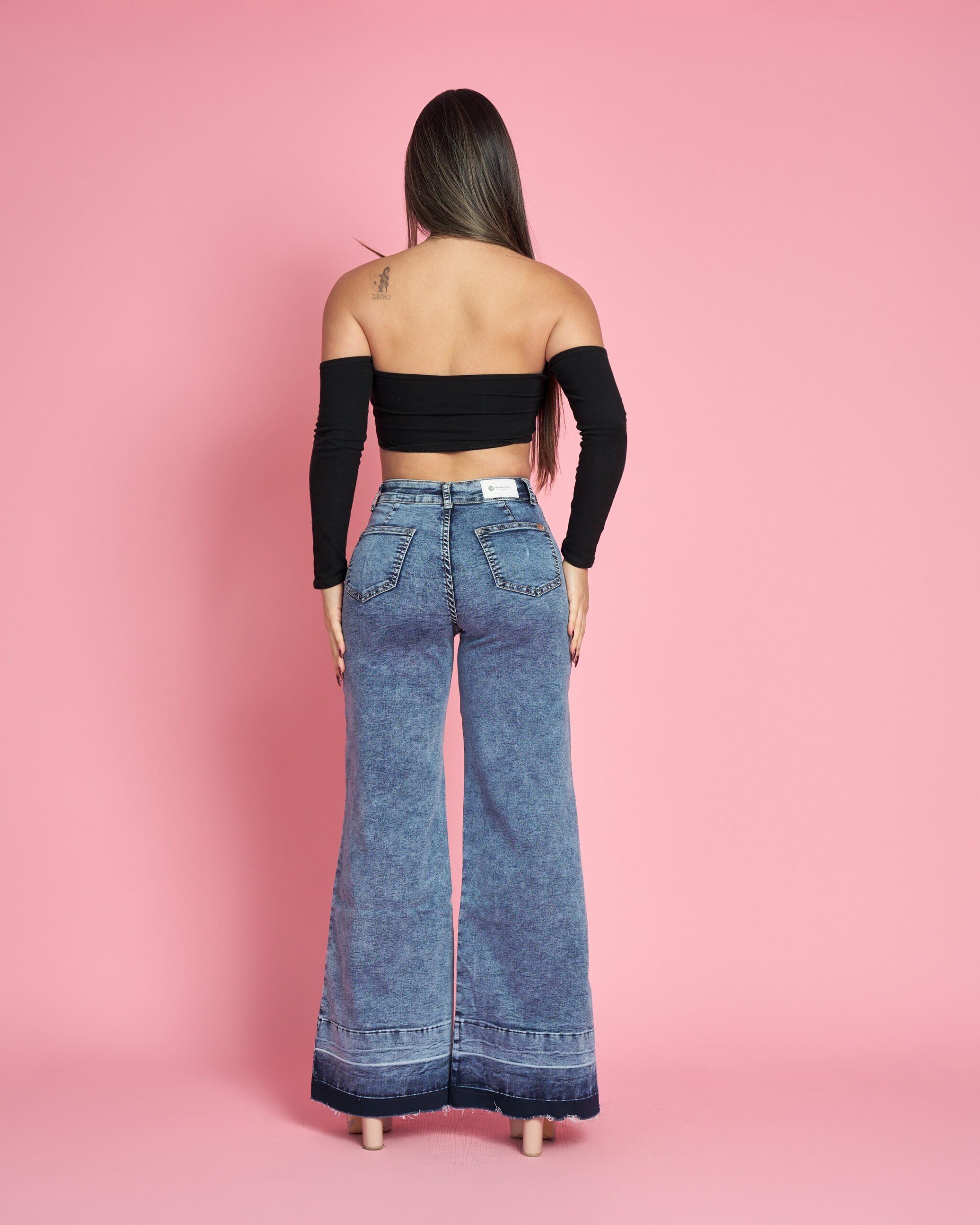 El MB7044 es un jeans wide leg de tiro alto con efecto desgastado y detalle de dobladillo ancho en contraste, uno de los diseños más pedidos por su estilo moderno y favorecedor.