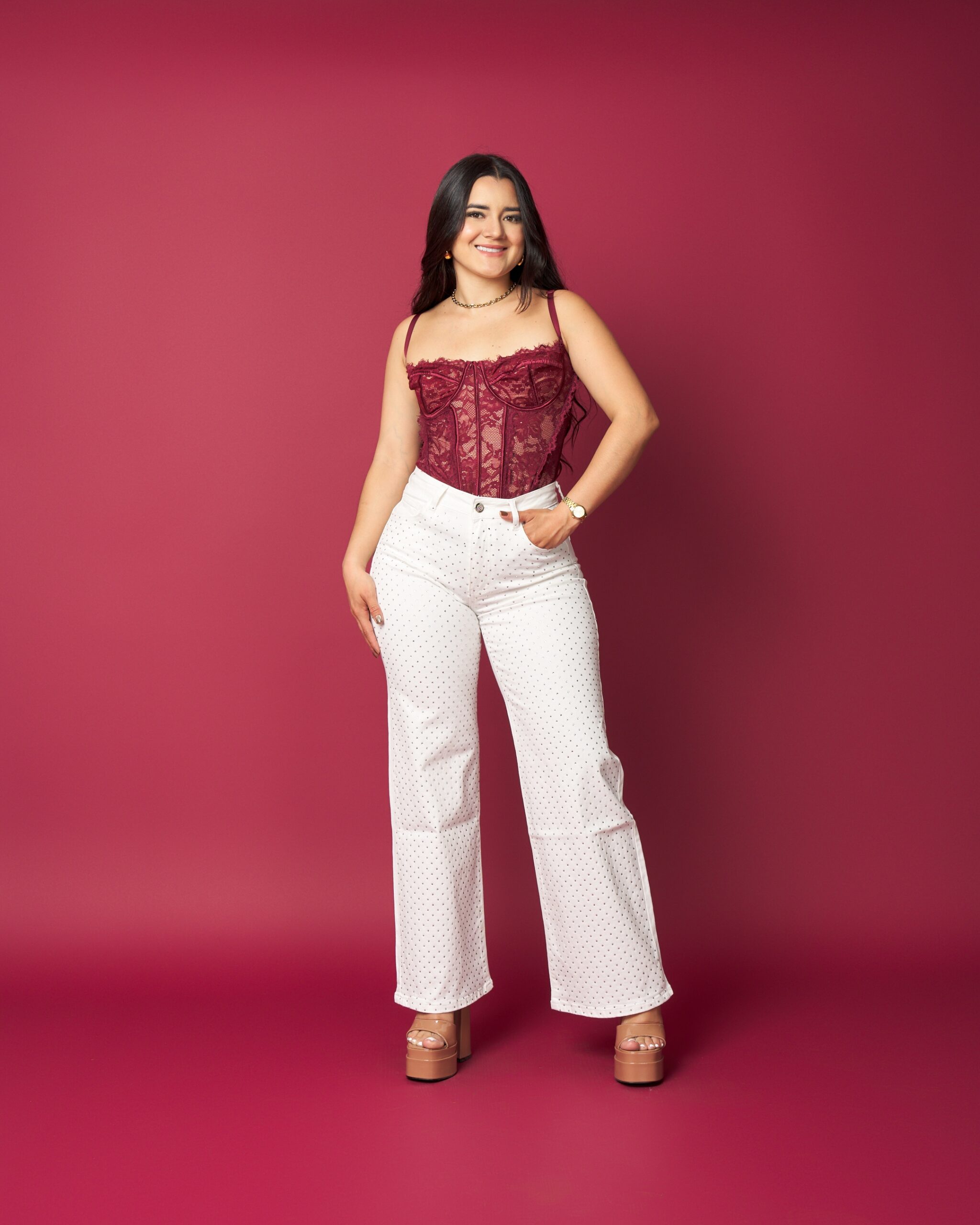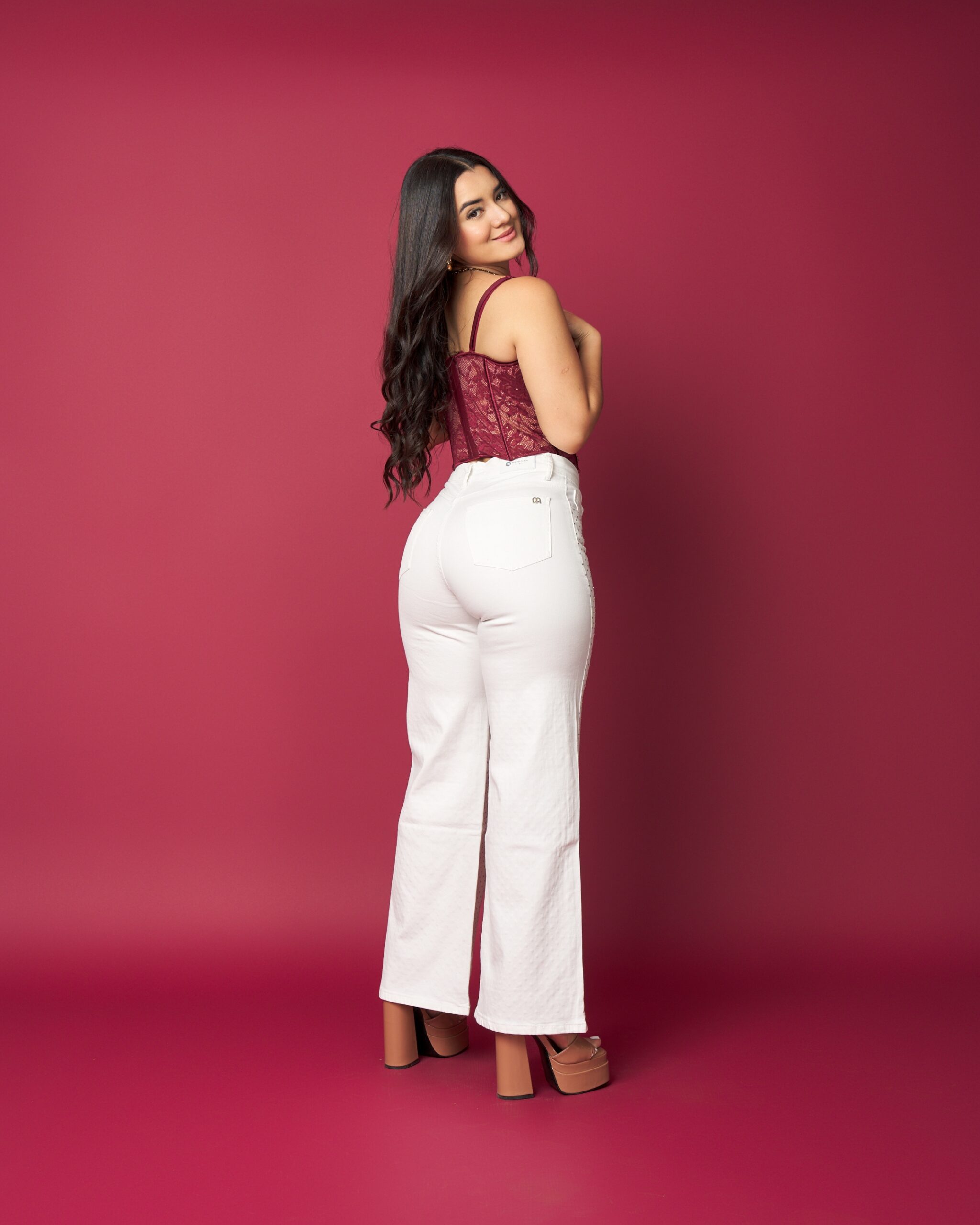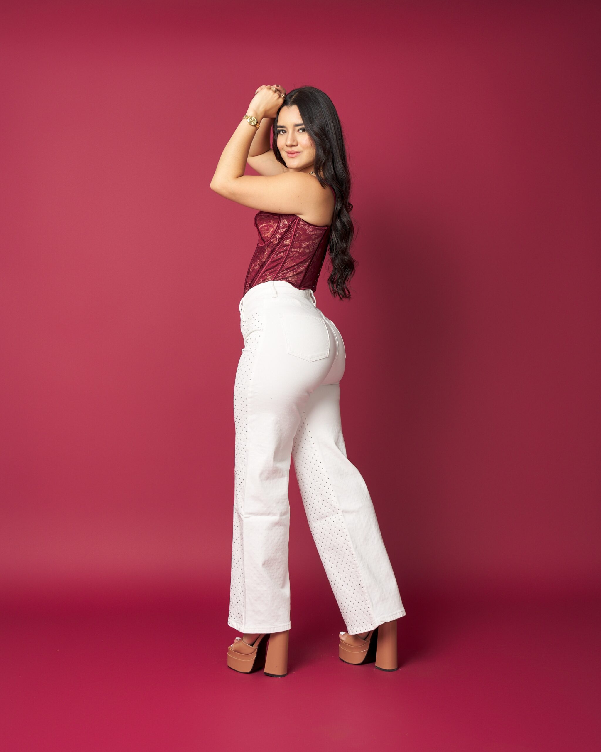 Mayorista, este modelo es perfecto para tus clientas que buscan brillo y elegancia. Wide leg blanco de tiro alto, con microaplicaciones frontales y laterales que iluminan el diseño sin perder sobriedad. Denim firme con stretch cómodo, silueta estilizada y calce que realza la figura.