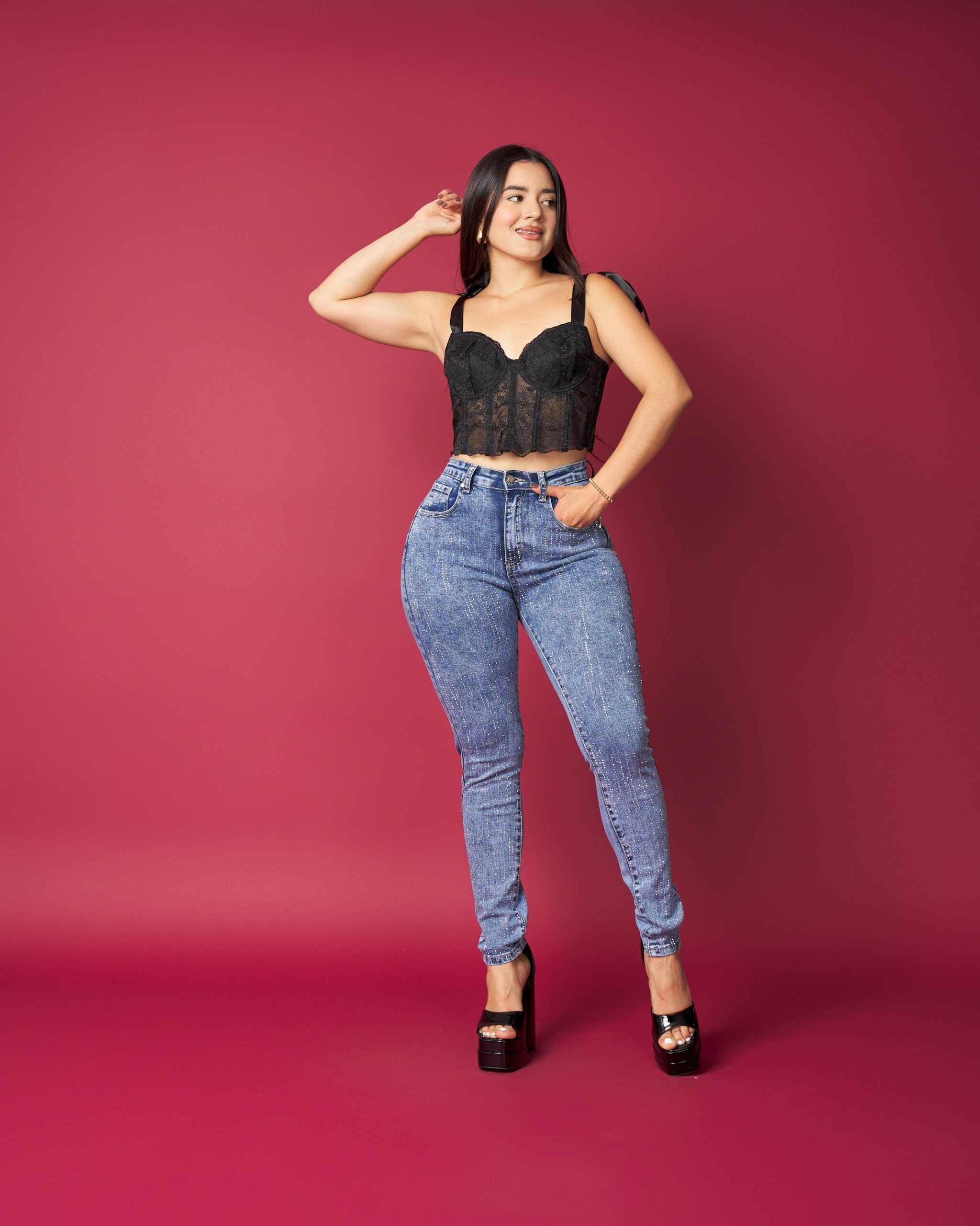 Este jeans combina un diseño clásico con sutiles aplicaciones brillantes que elevan tu look al instante. Su calce favorecedor realza la silueta de forma natural, mientras su tela cómoda y flexible te acompaña durante todo el día con total seguridad y estilo.