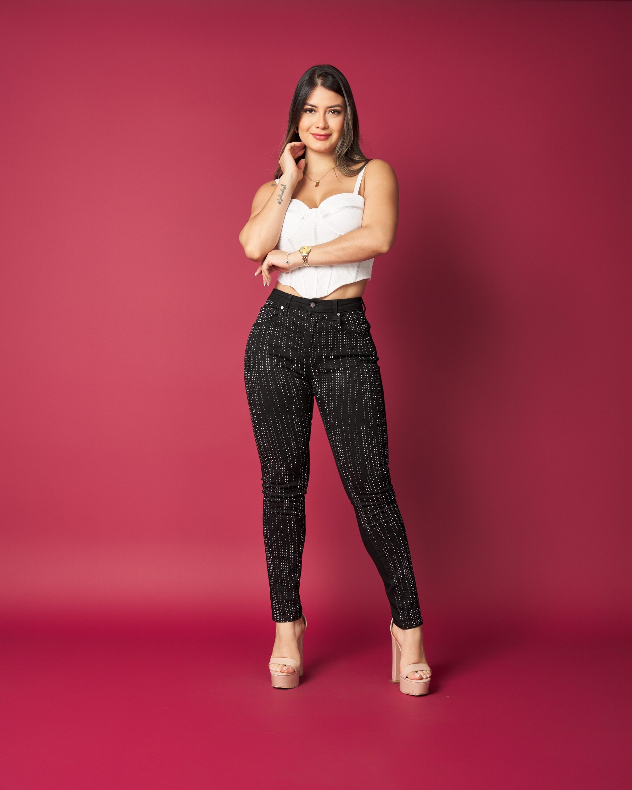 Este jeans destaca por su diseño moderno con delicados detalles brillantes que elevan cualquier look. Su calce favorecedor realza la silueta mientras la tela cómoda y flexible te acompaña durante todo el día con total seguridad y estilo.