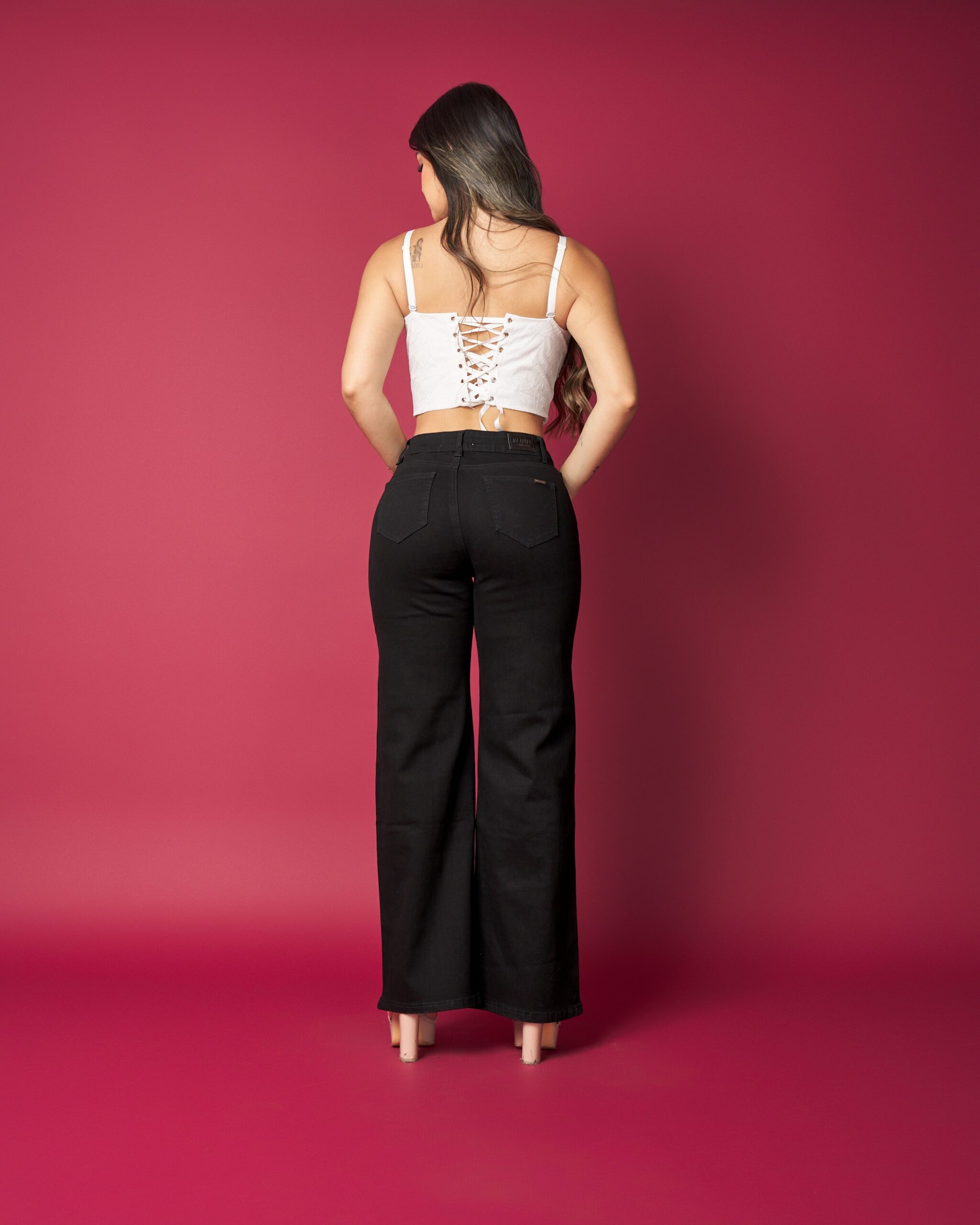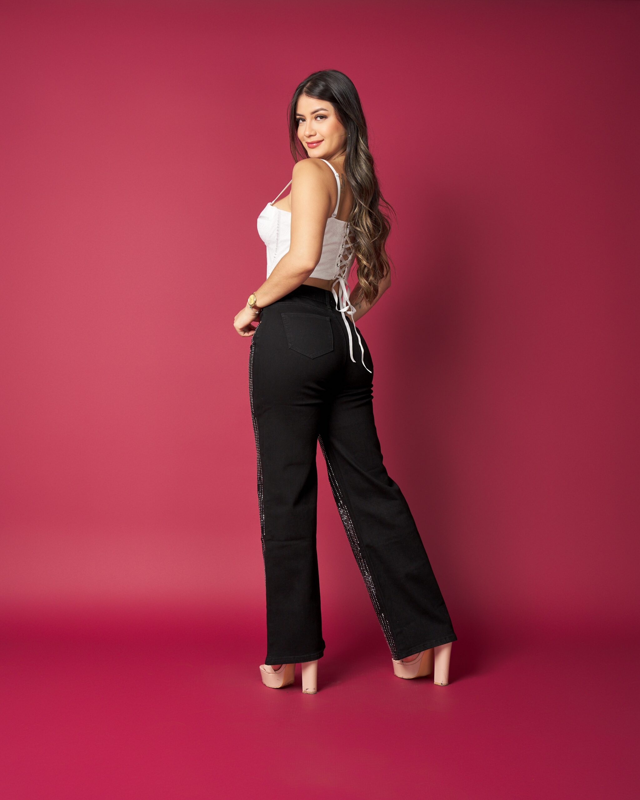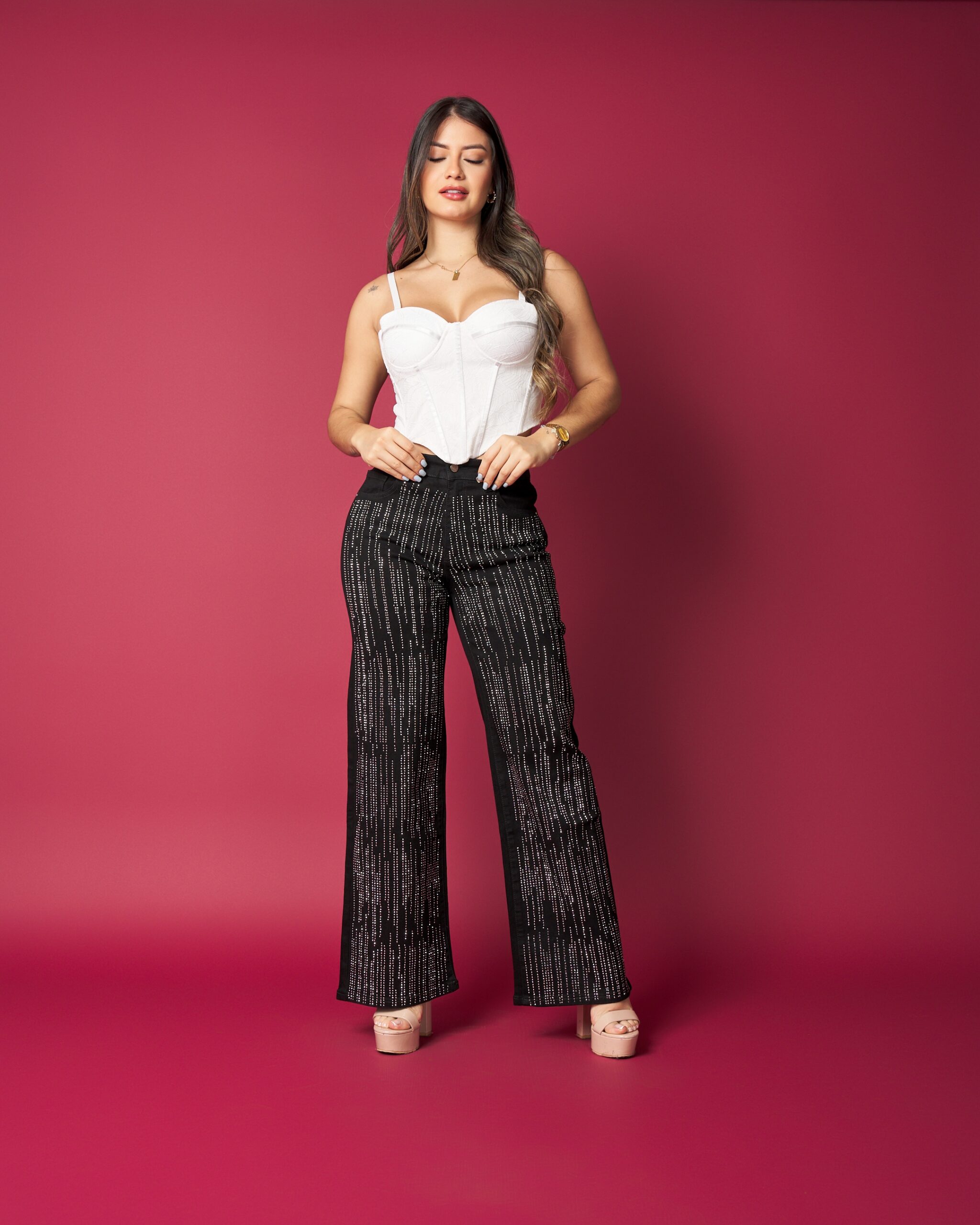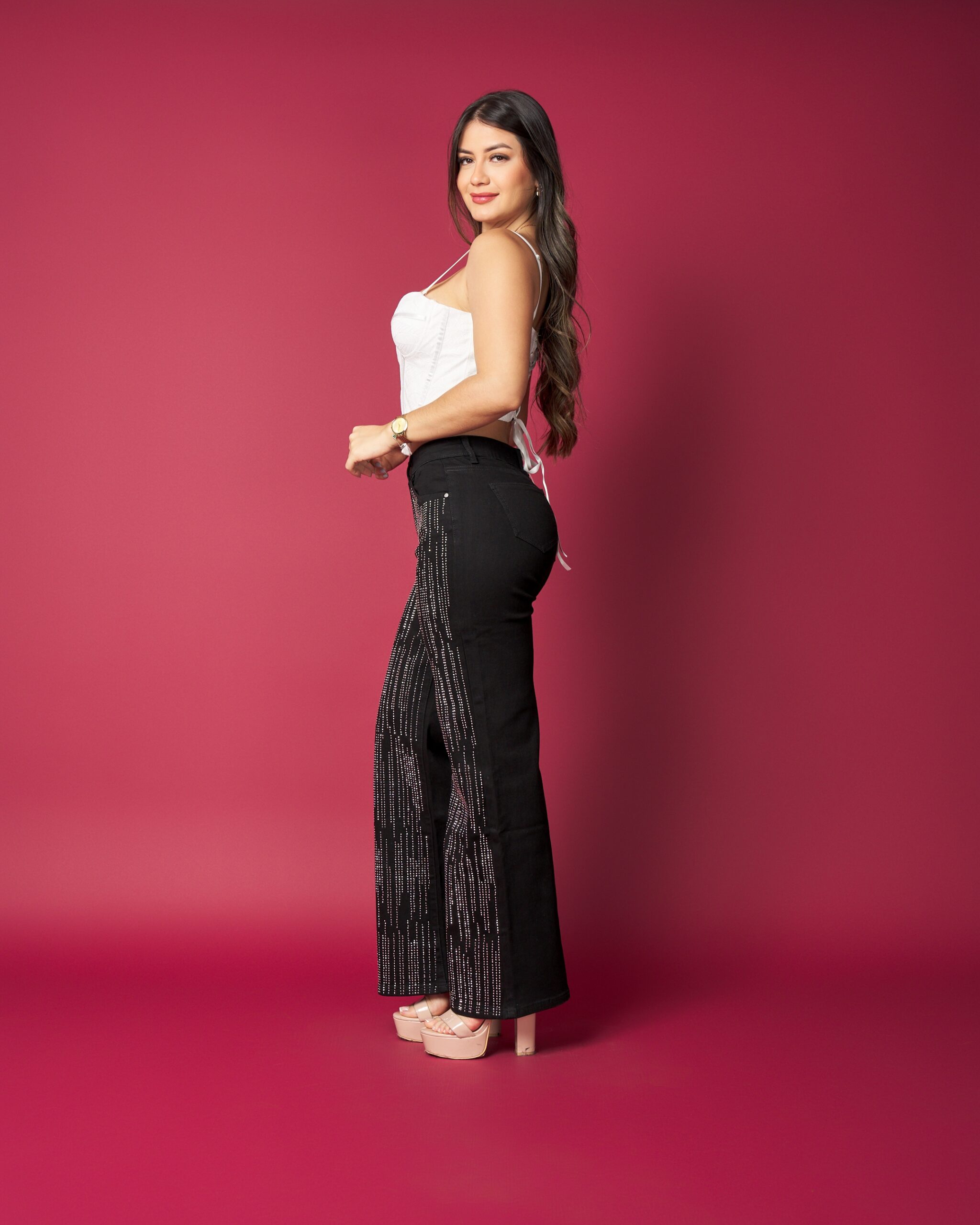 Este jeans combina un diseño elegante con detalles que marcan la diferencia. Sus aplicaciones brillantes aportan un toque sofisticado sin perder comodidad, mientras su calce favorecedor realza la silueta de forma natural.