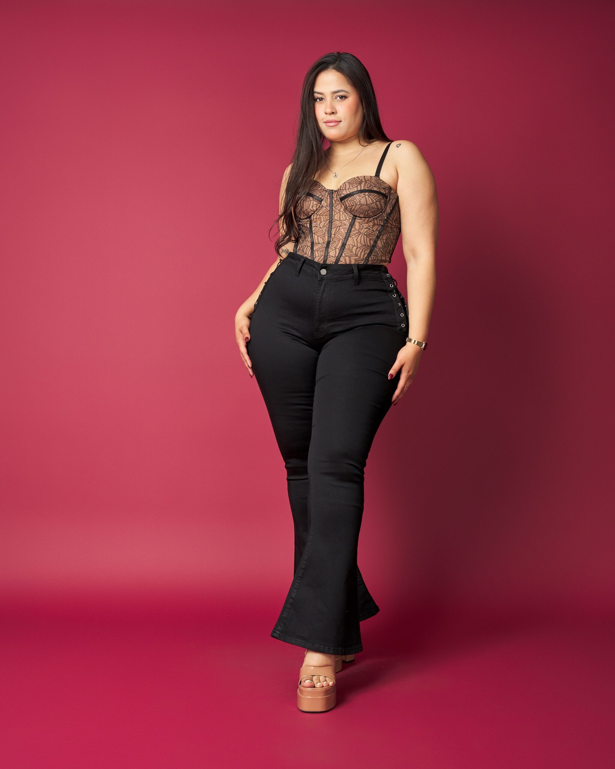 Amig@ mayorista, este modelo es perfecto para clientas que buscan un flare moderno con un toque atrevido. Su diseño con amarras laterales tipo corsé estiliza la cadera, define la cintura y añade un detalle súper atractivo en vitrina.