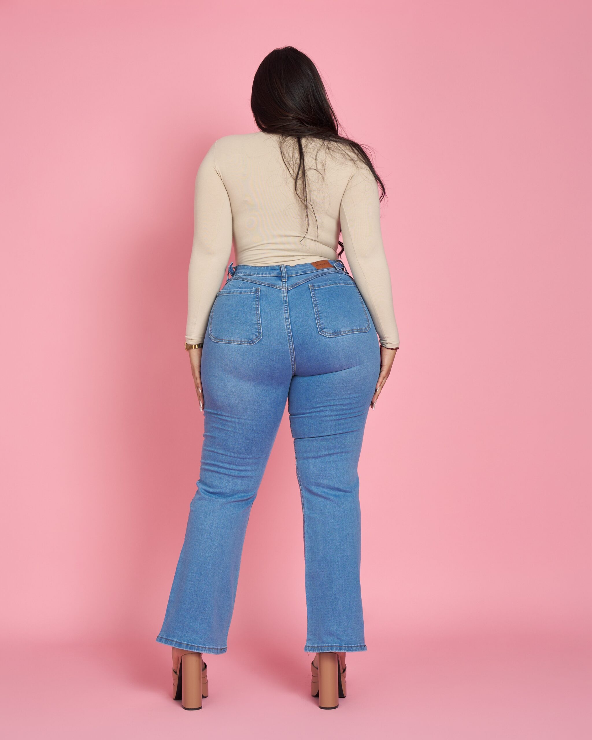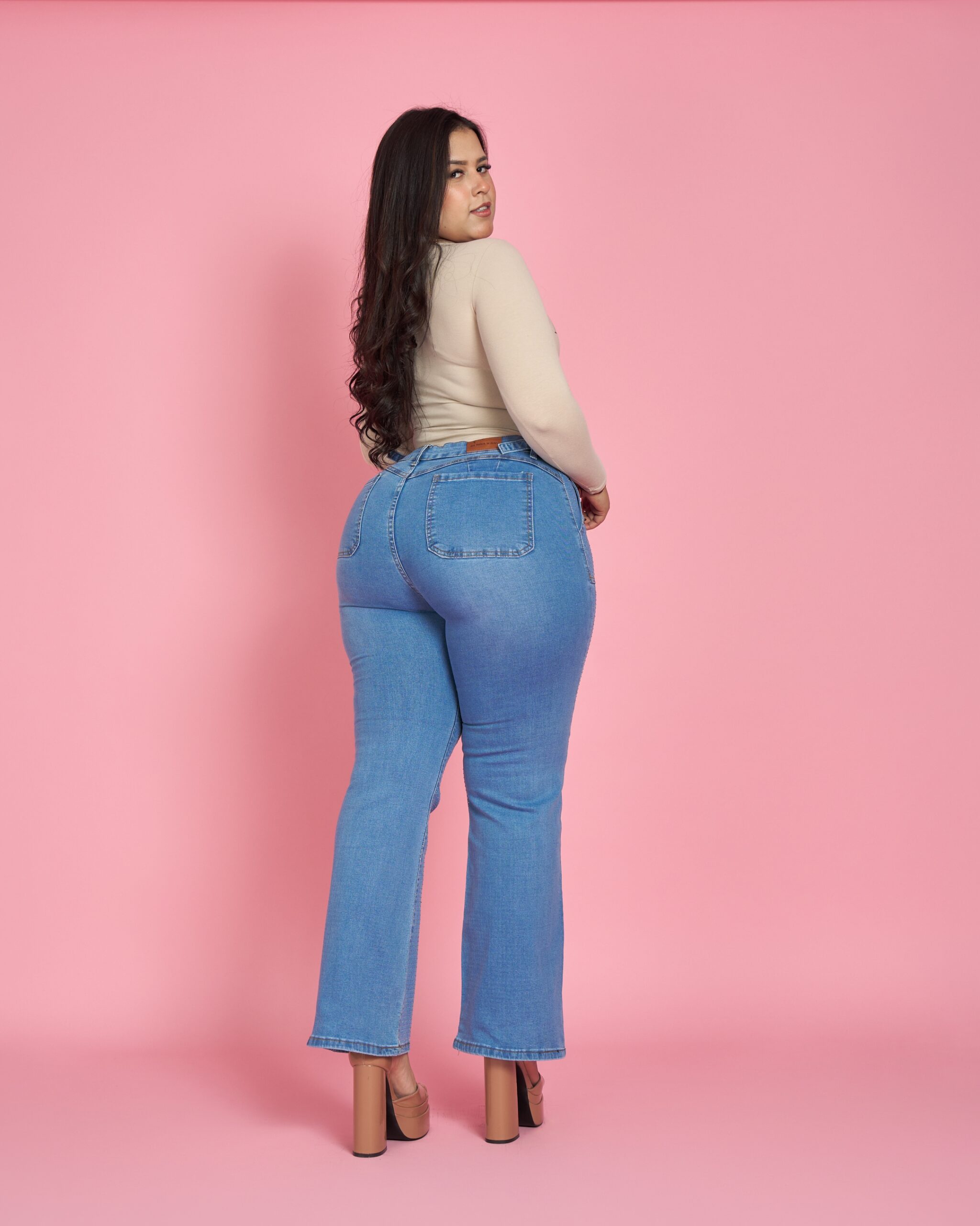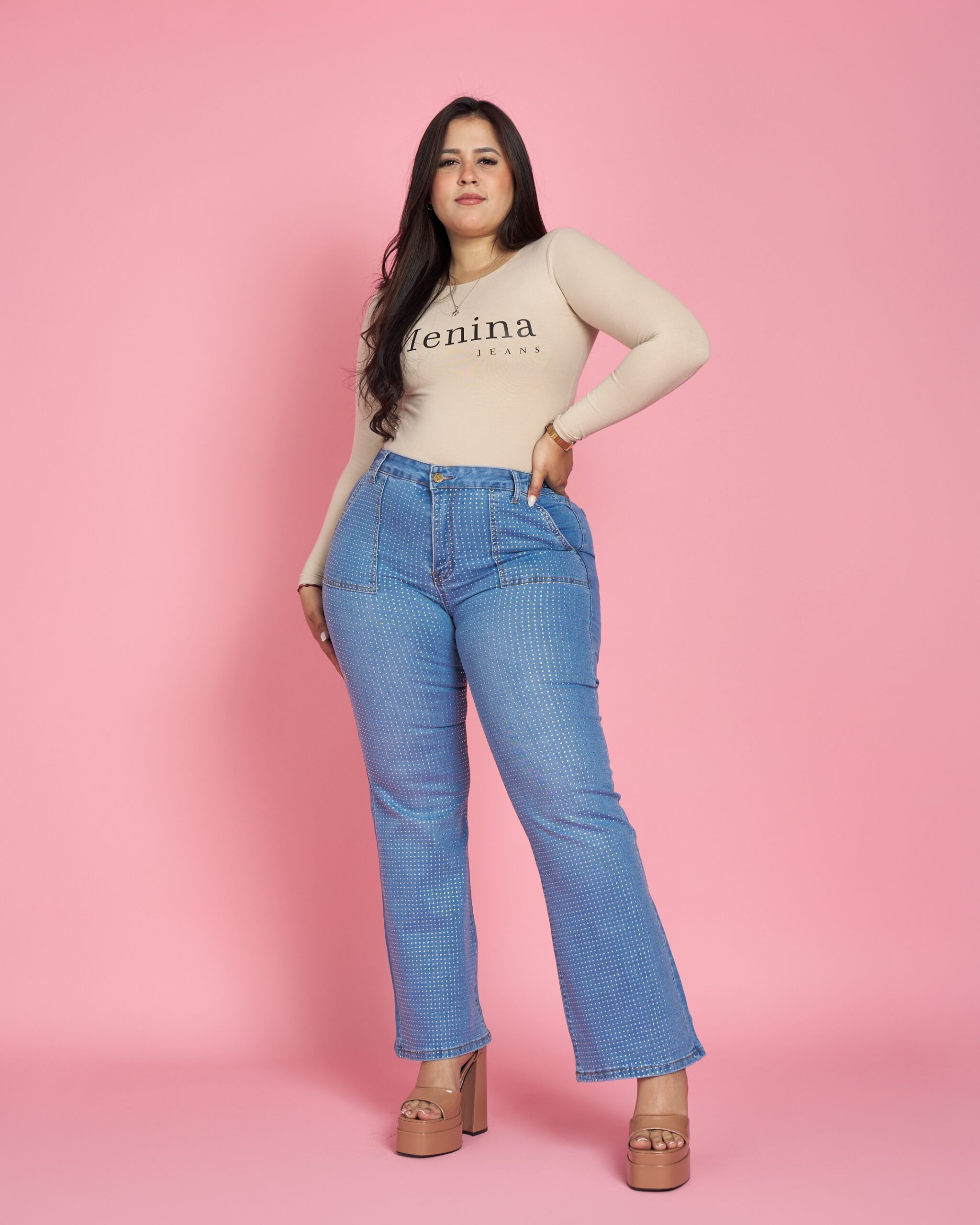 Jeans plus con tiro alto, calce que realza y detalle frontal con microbrillos que ilumina la figura sin perder comodidad. Tela firme, suave y con elasticidad justa para un ajuste perfecto.