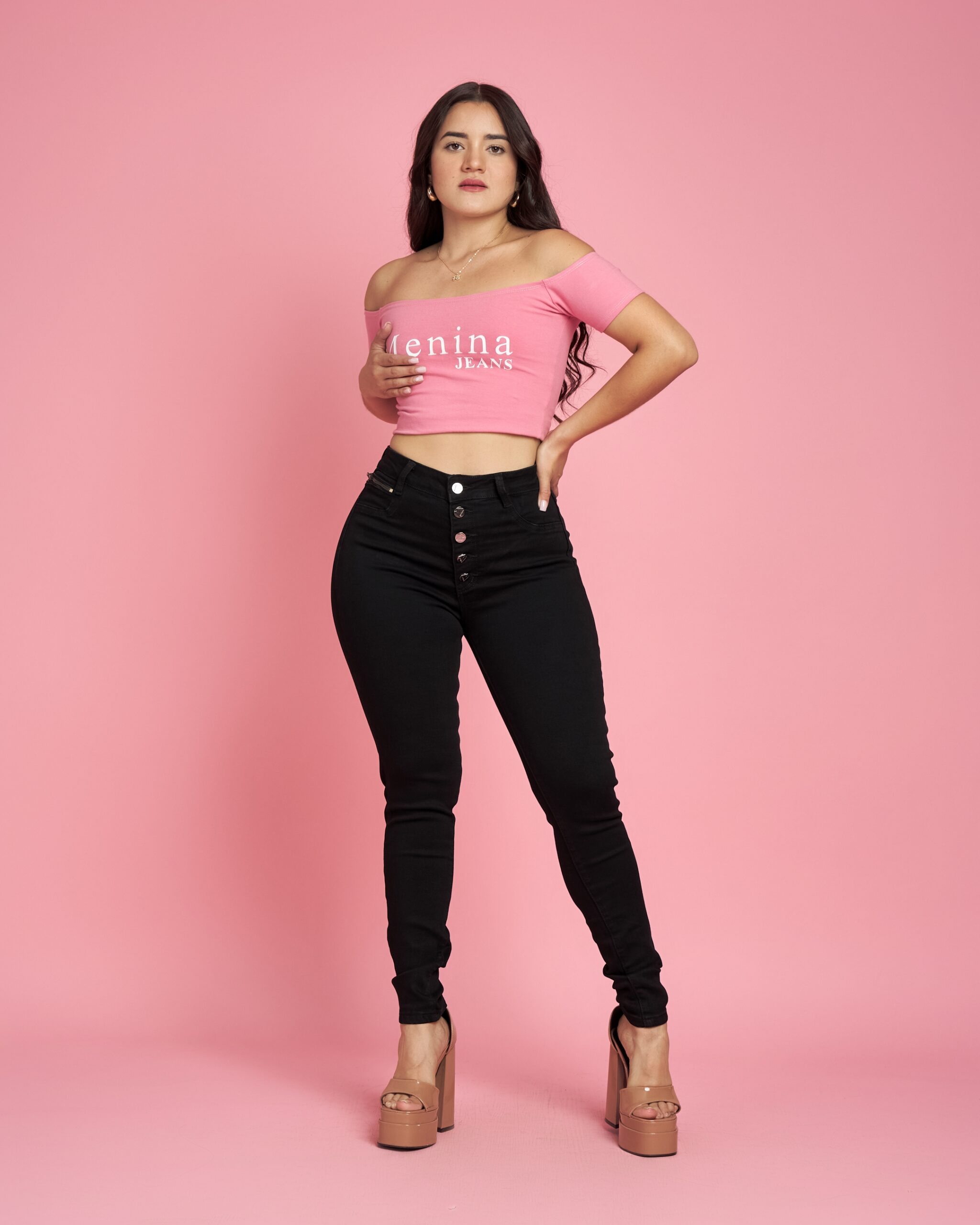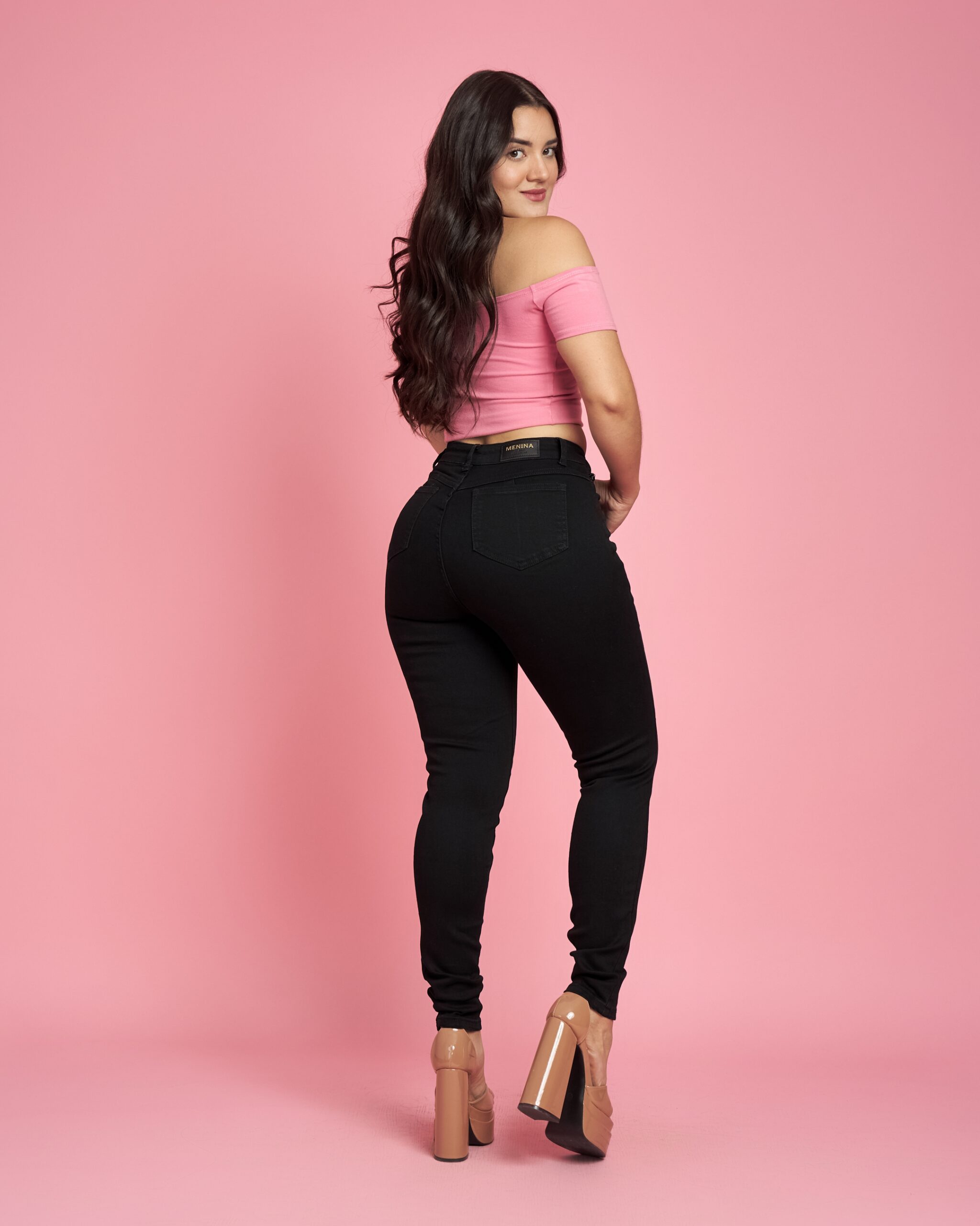 Jeans negro tiro alto con triple botón frontal, calce skinny y tela altamente elasticada que moldea y realza la figura. Un básico indispensable: cómodo, estiliza y combina con todo.