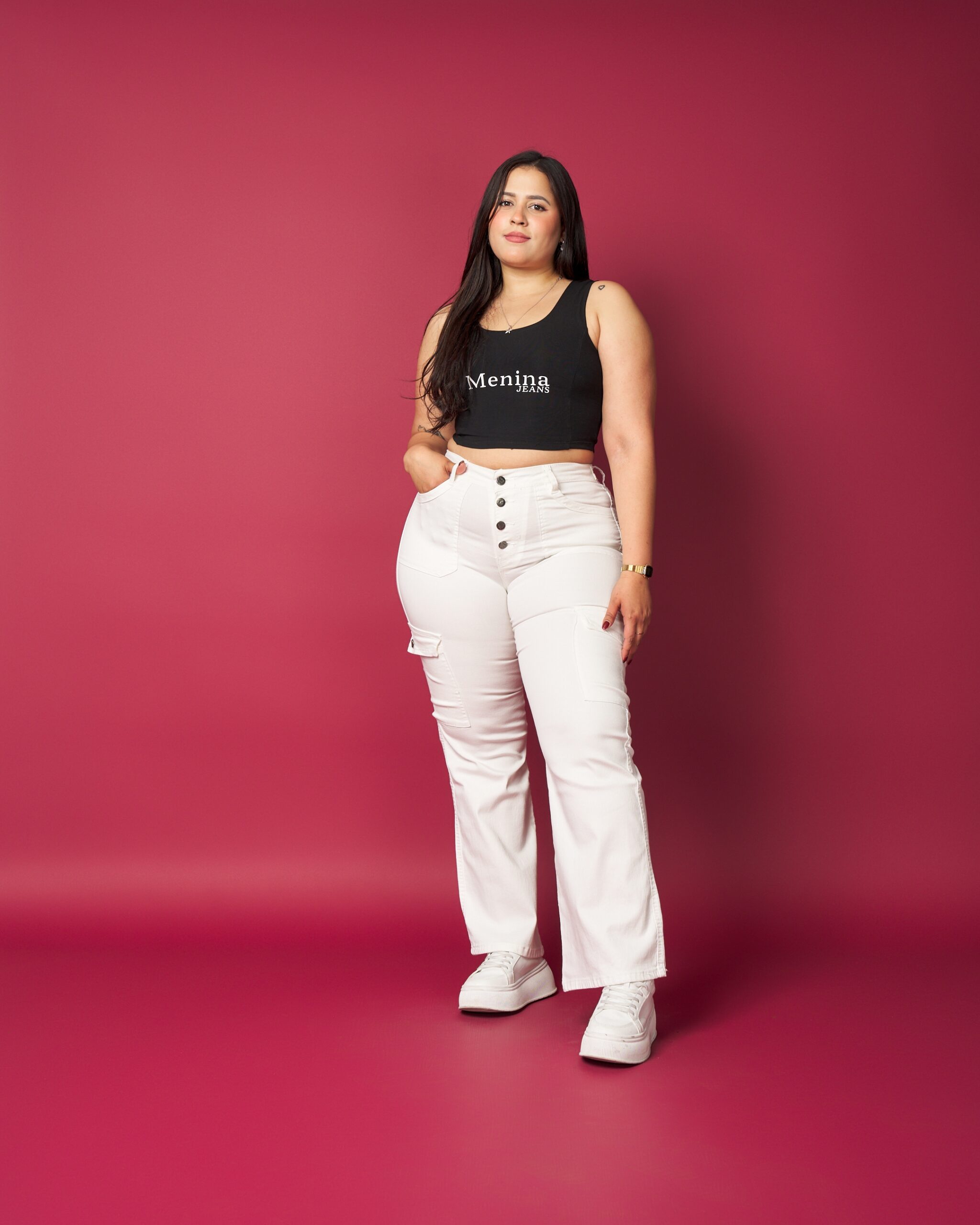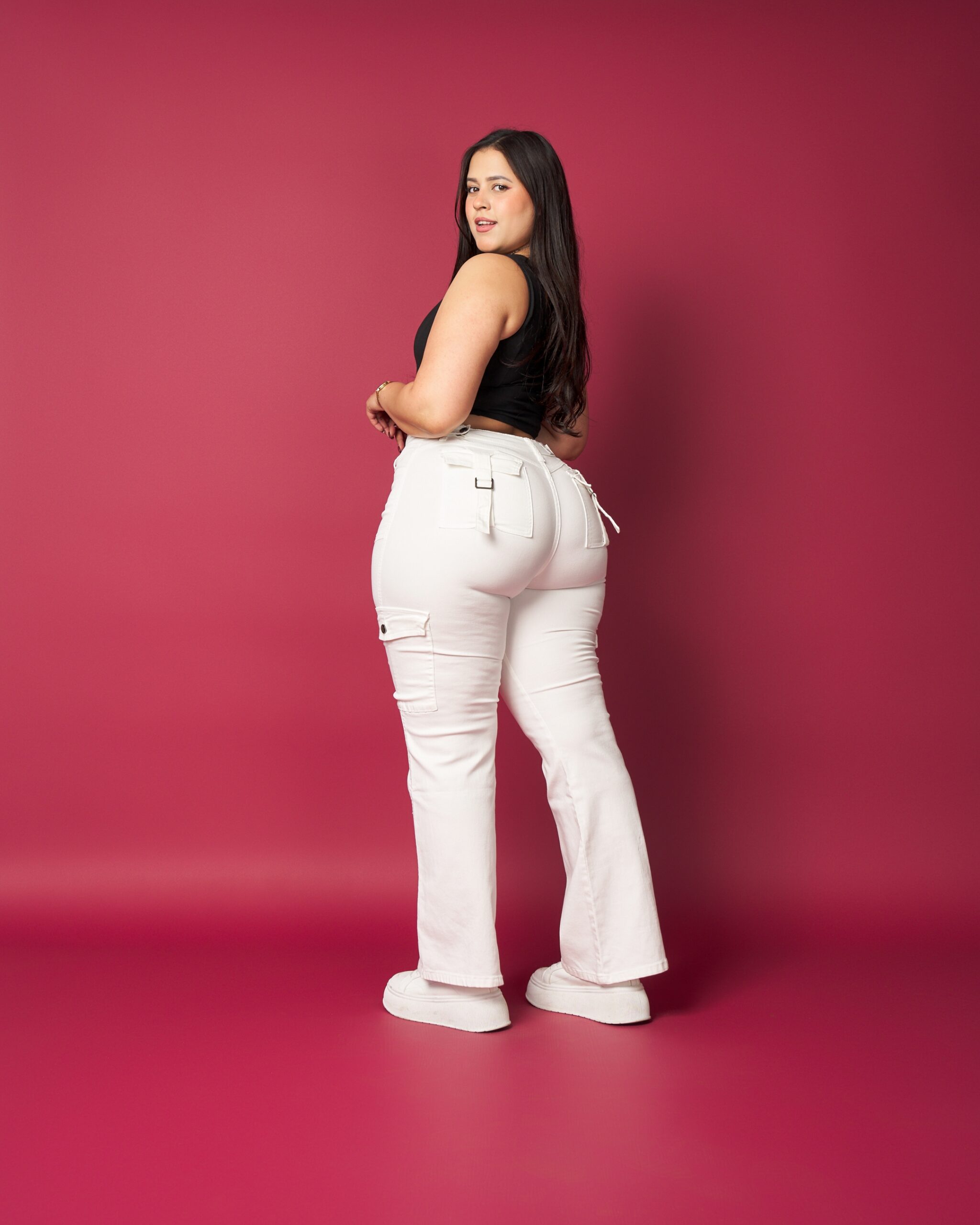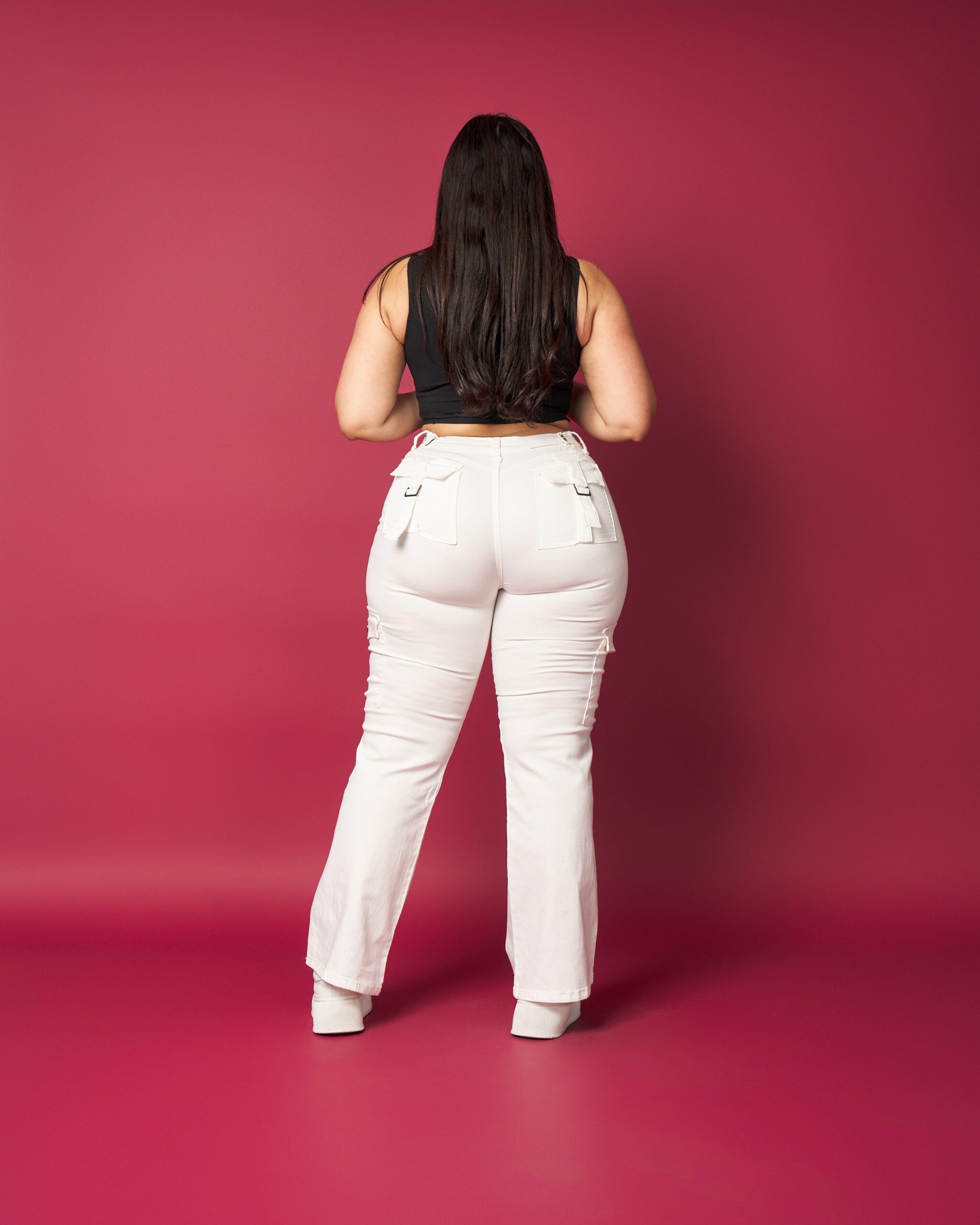 Jeans de tiro alto con calce recto y diseño cargo que incorpora bolsillos funcionales y cintas decorativas en la parte trasera, aportando un estilo moderno y urbano. Confeccionado en tela firme que realza la figura y entrega comodidad durante todo el día.