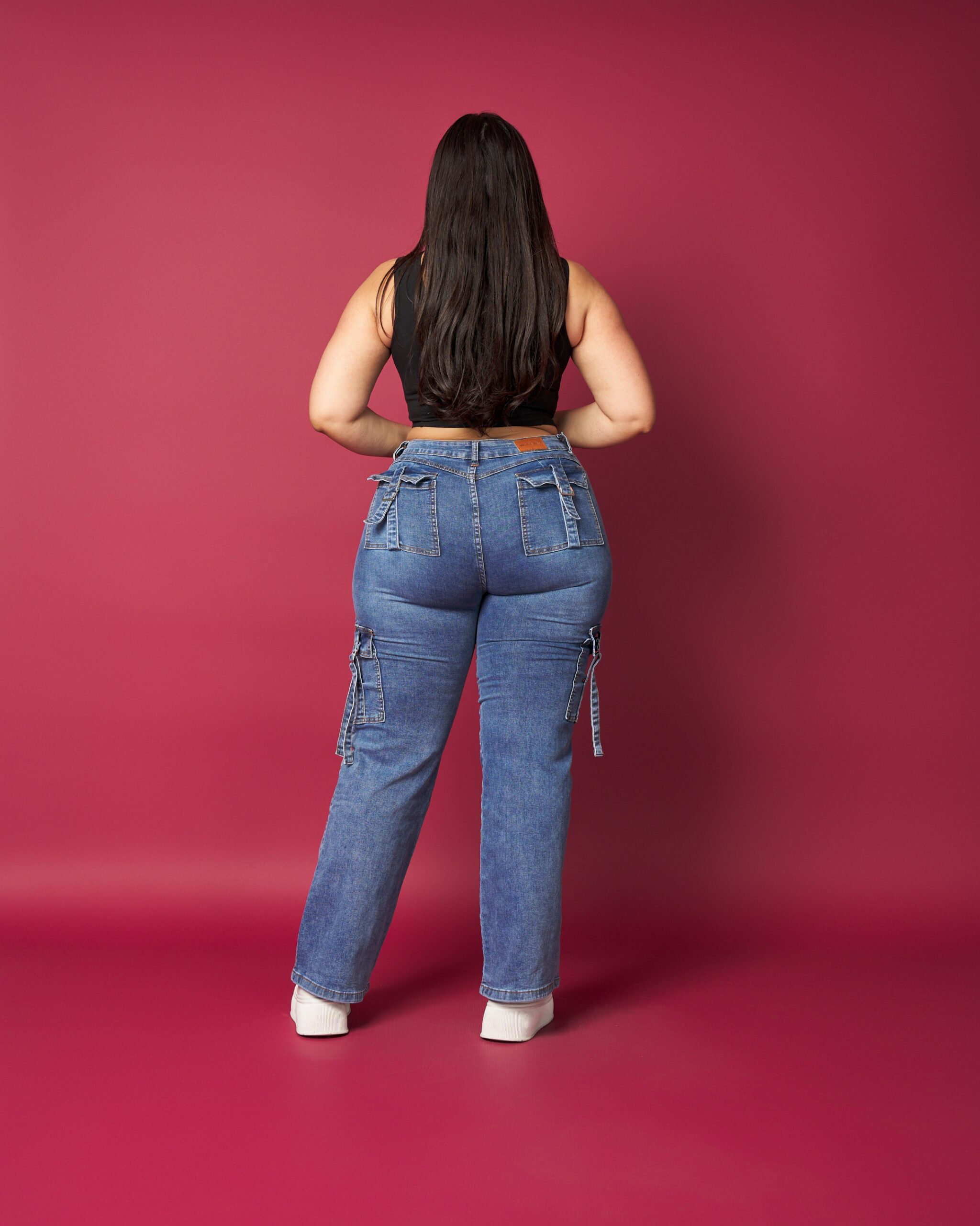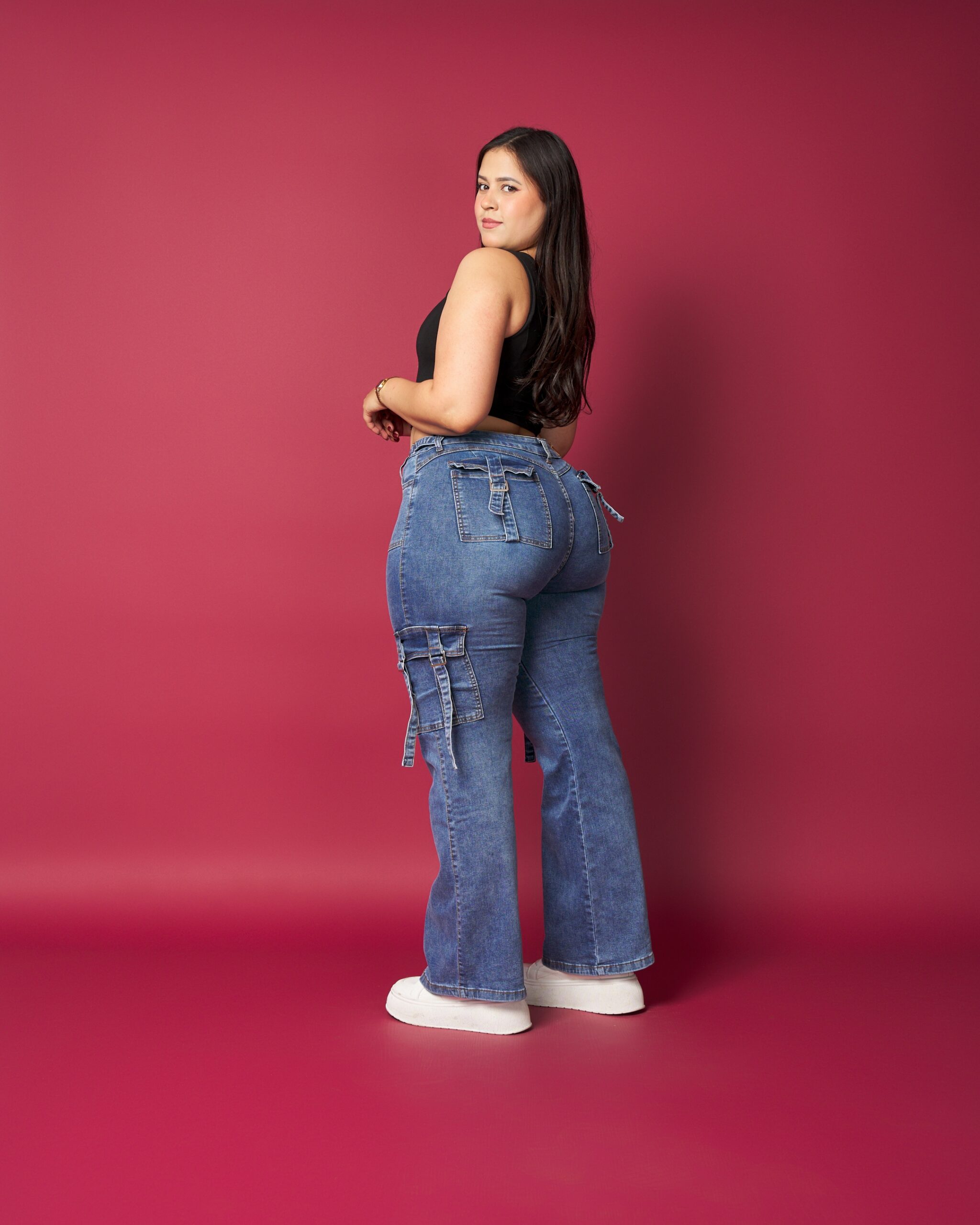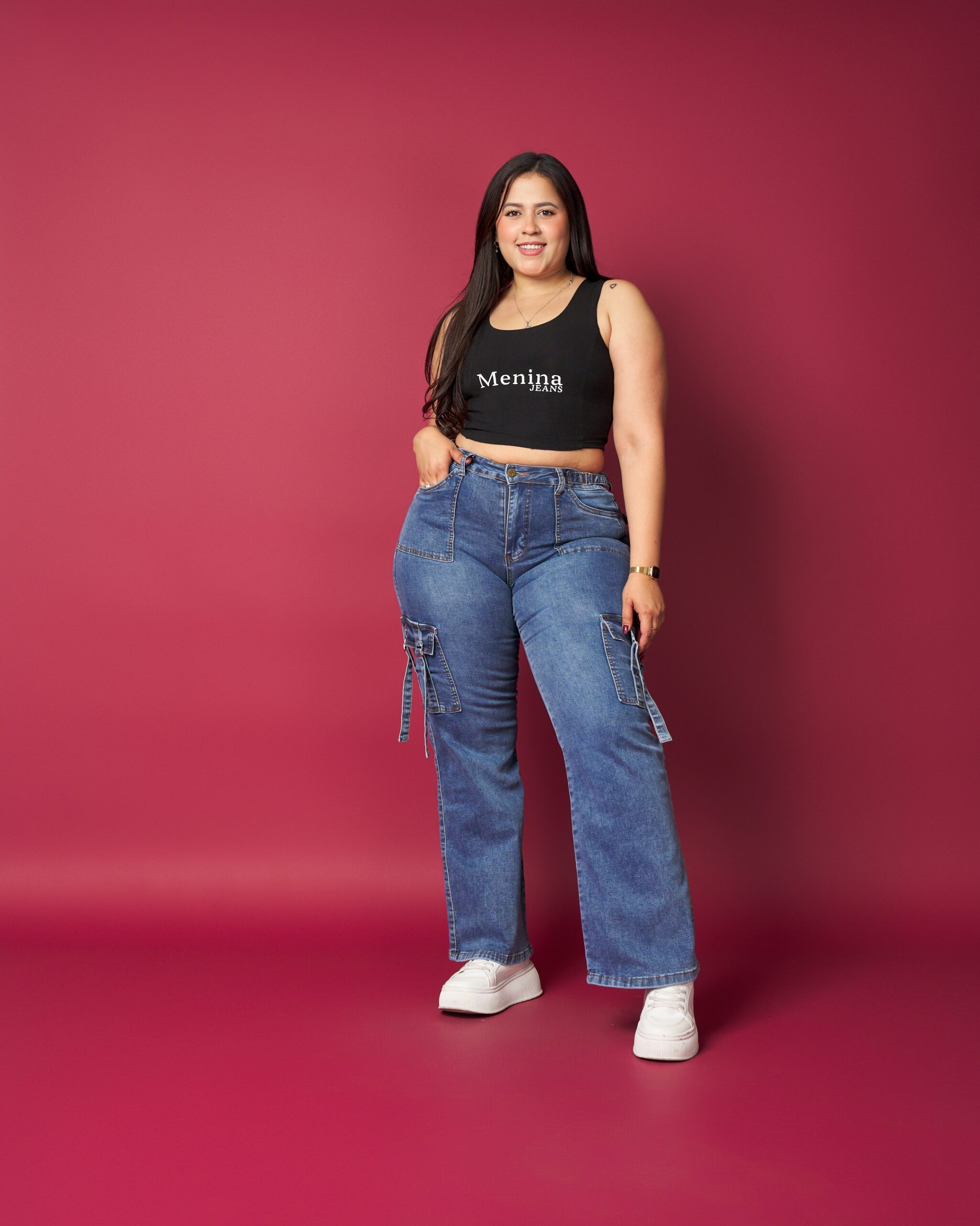 Jeans de tiro alto con calce recto y favorecedor, ideal para estilizar la figura sin perder comodidad. Incorpora bolsillos cargo laterales con tiras decorativas, que aportan un look moderno y funcional. Confeccionado en denim resistente con leve elasticidad, perfecto para el uso diario y outfits urbanos.