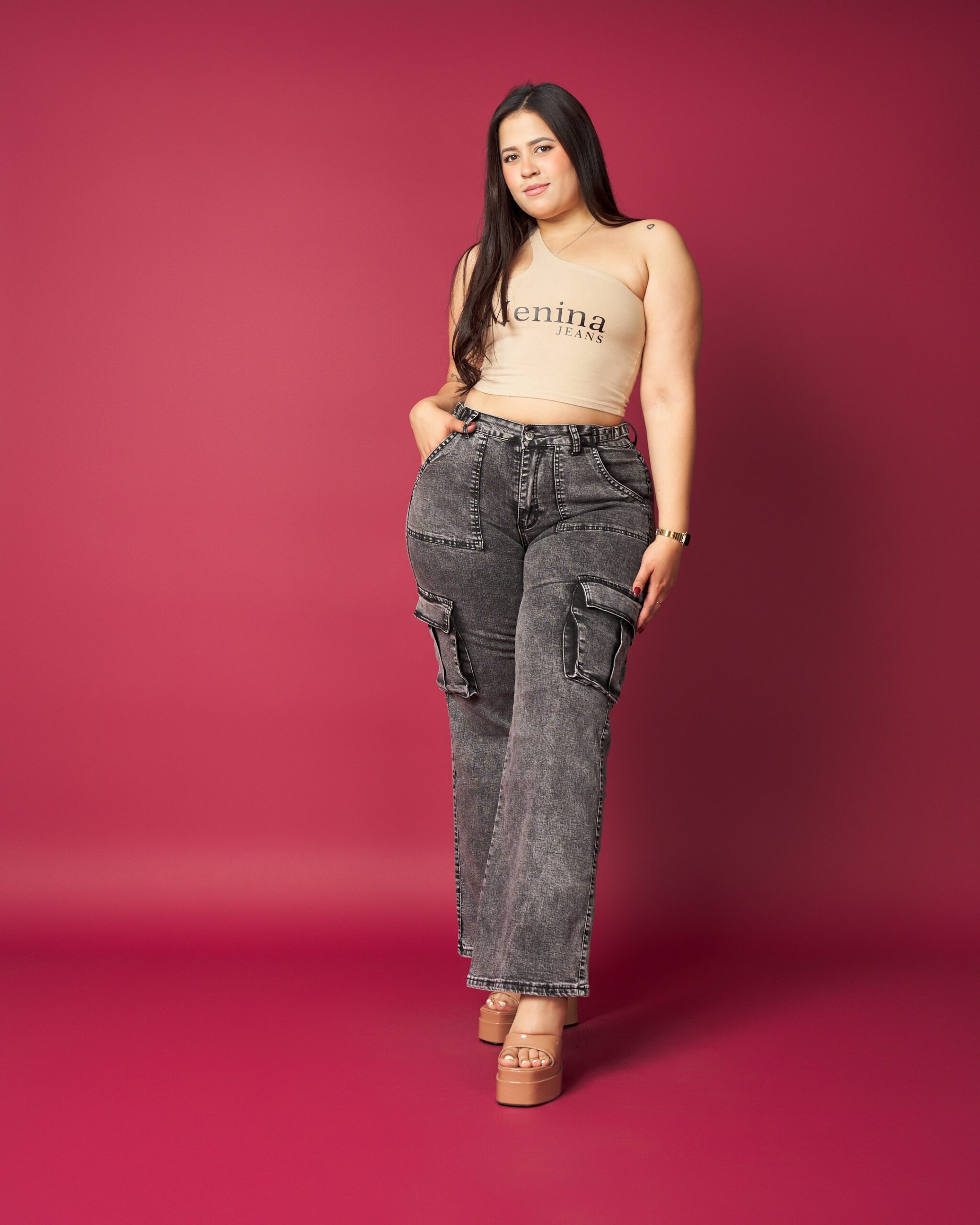 Pantalón de denim elasticado con diseño cargo y bolsillos laterales funcionales. Cuenta con tiro medio/alto que realza la figura y un calce cómodo que se adapta muy bien a caderas y piernas. Ideal para un look urbano con estilo, fácil de combinar con zapatillas o tacones.
