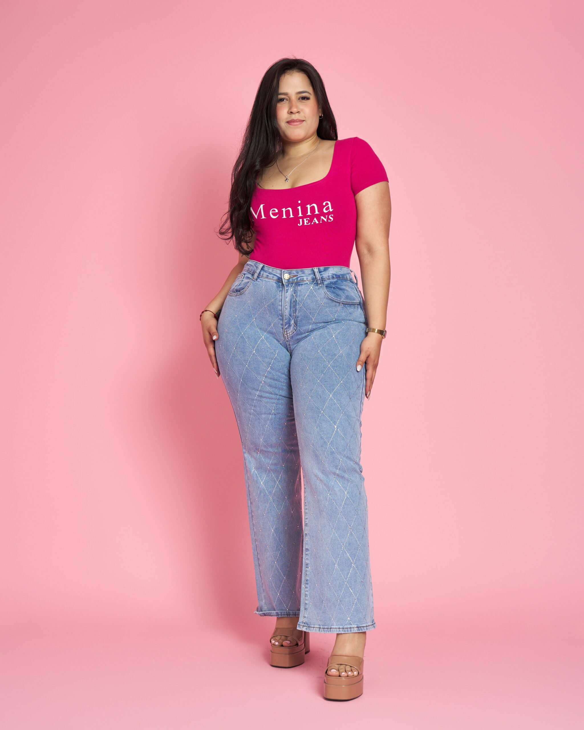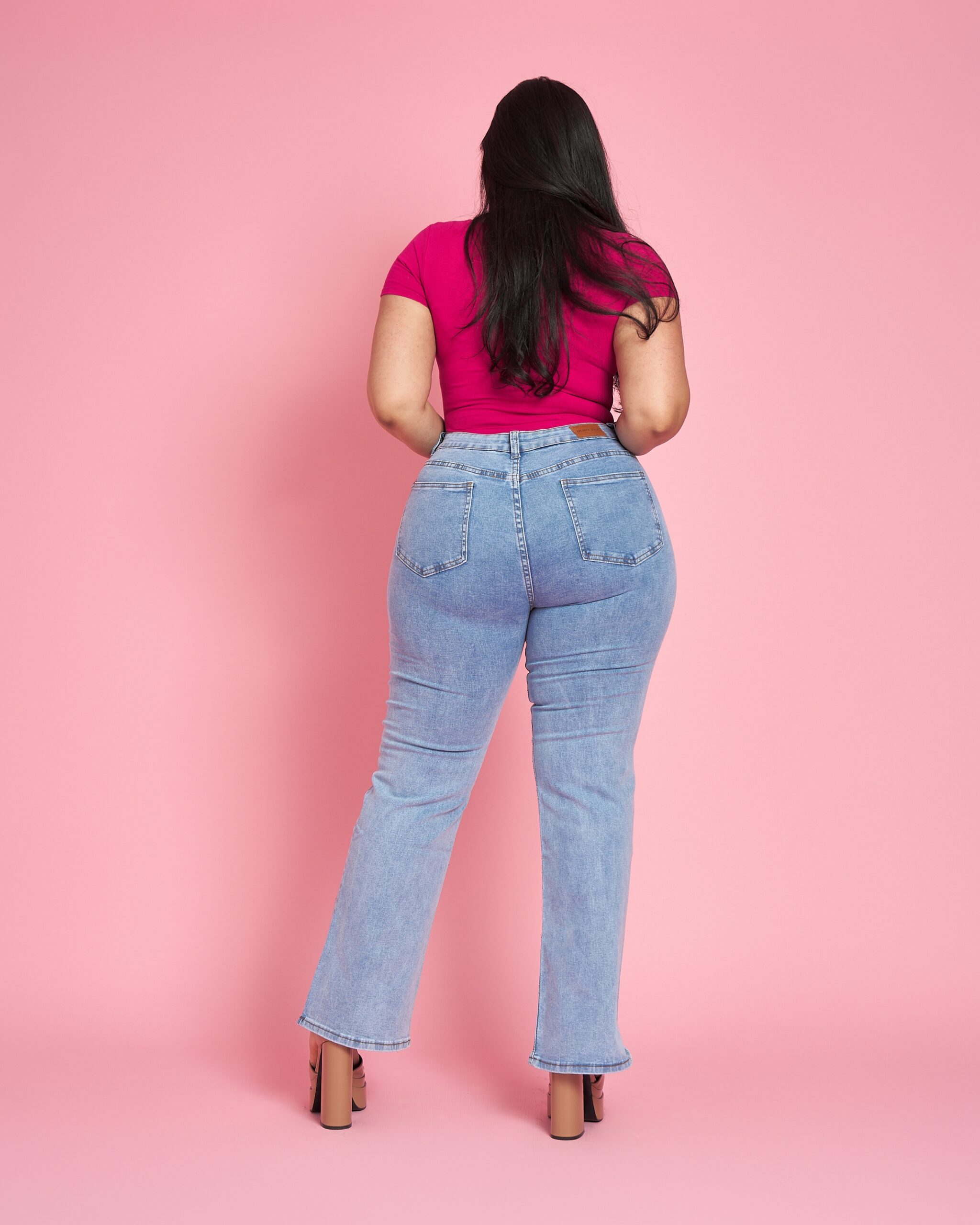 Es un jeans recto–flare tiro alto, confeccionado en denim elasticado, que asegura un calce firme, cómodo y muy favorecedor para todo tipo de cuerpo.