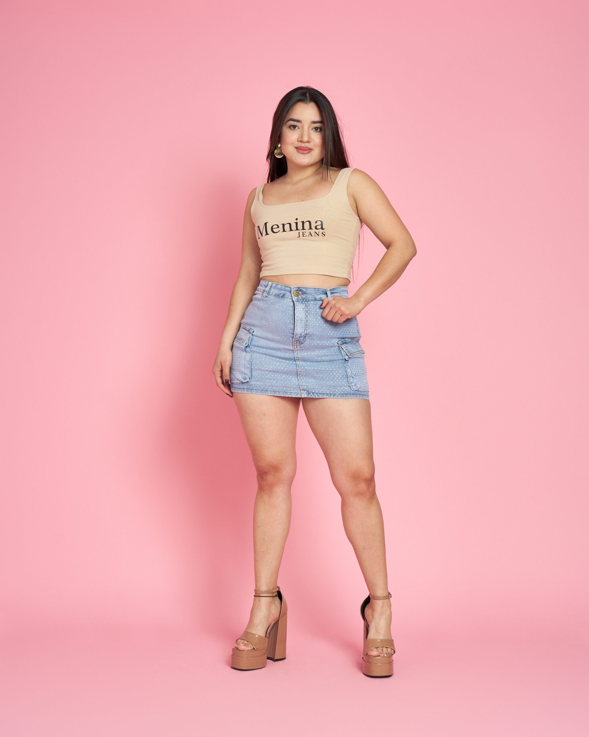 Se trata de una falda short cargo elasticada, en denim celeste con brillos suaves, ideal para clientas que buscan un look juvenil, estilizado y con detalles que destacan.