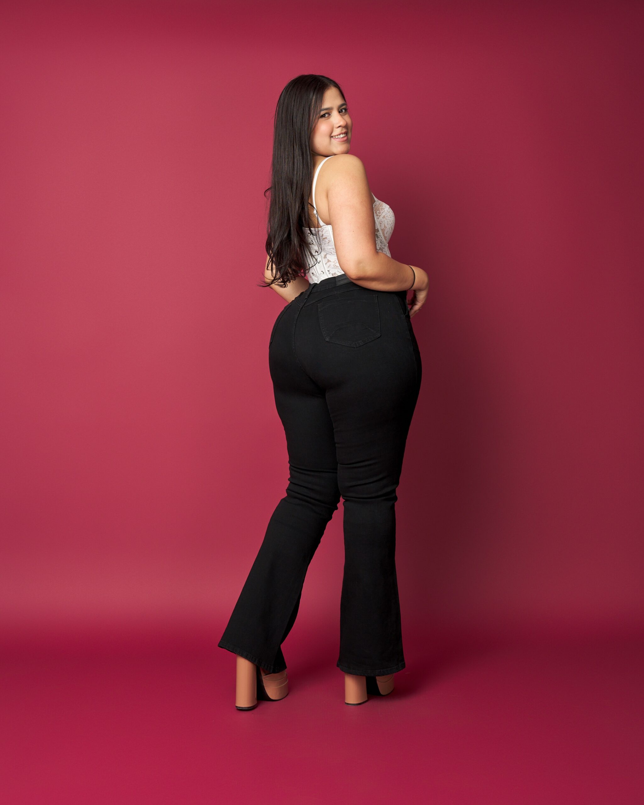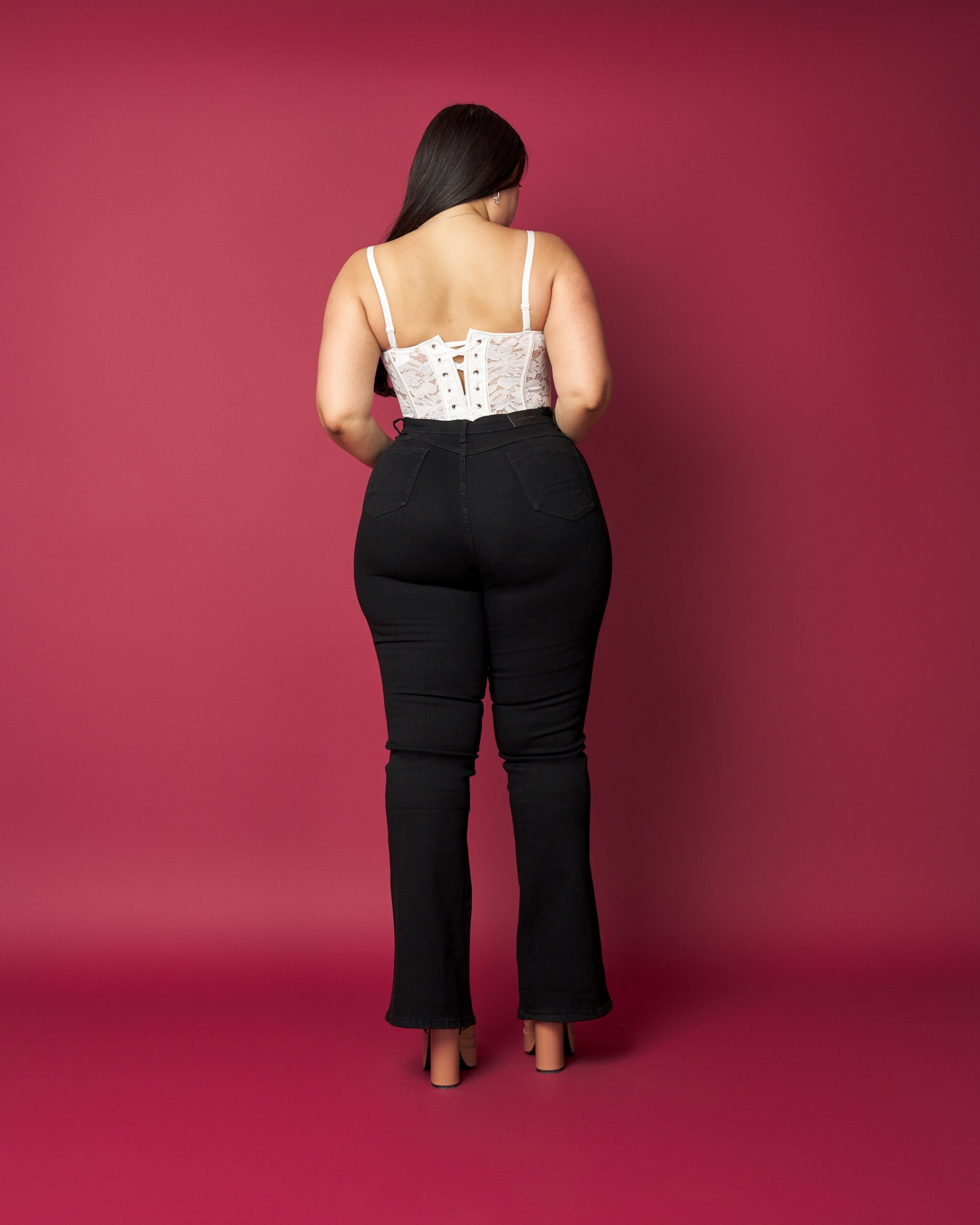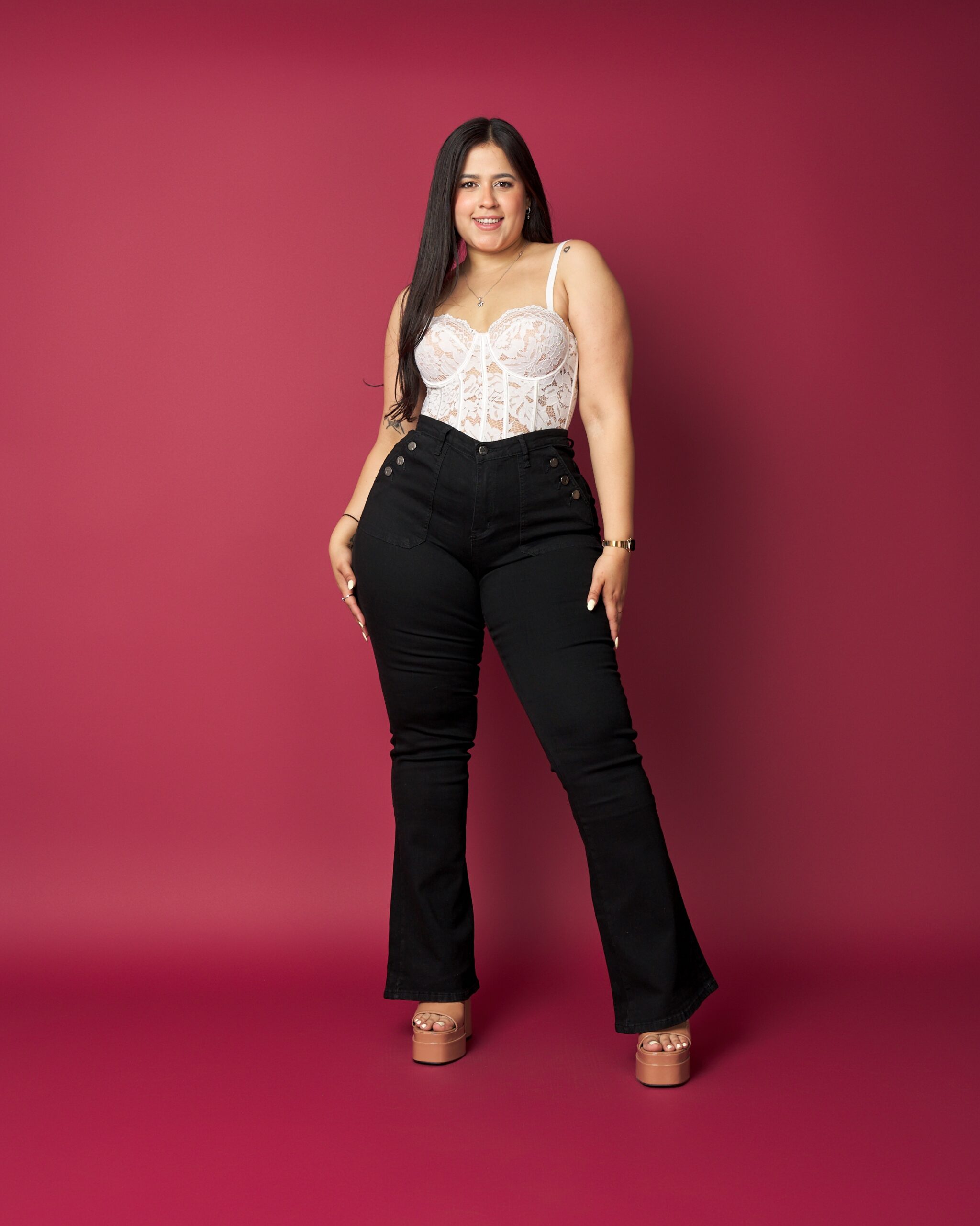 ¡Mayorista, este modelo es un éxito seguro! Flare plus size en denim negro con tiro alto que define la cintura y moldea el abdomen con un calce firme y súper favorecedor. Sus botones metálicos decorativos al frente aportan un toque moderno y elevan el diseño sin perder elegancia. La bota acampanada equilibra la silueta y realza las curvas de manera natural.